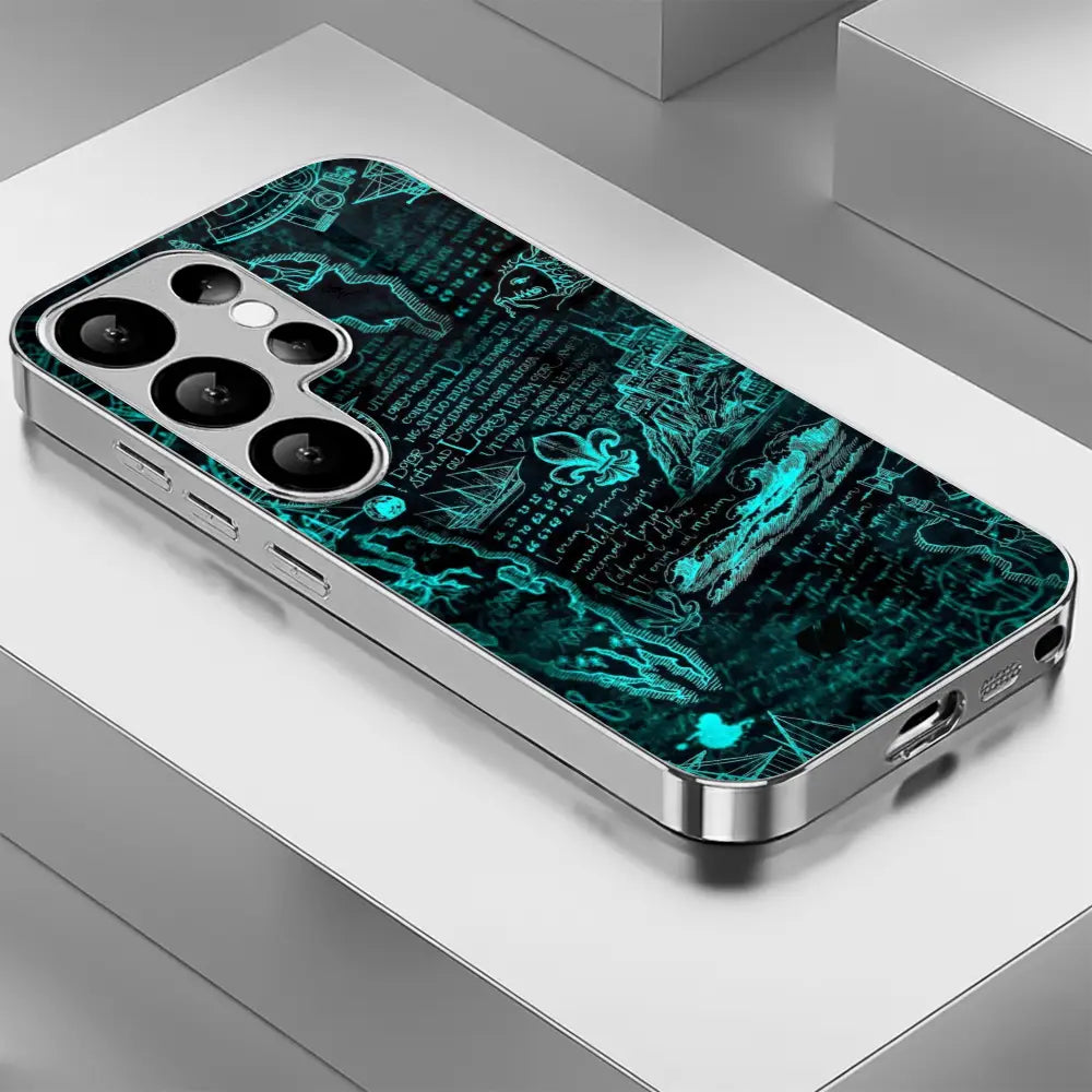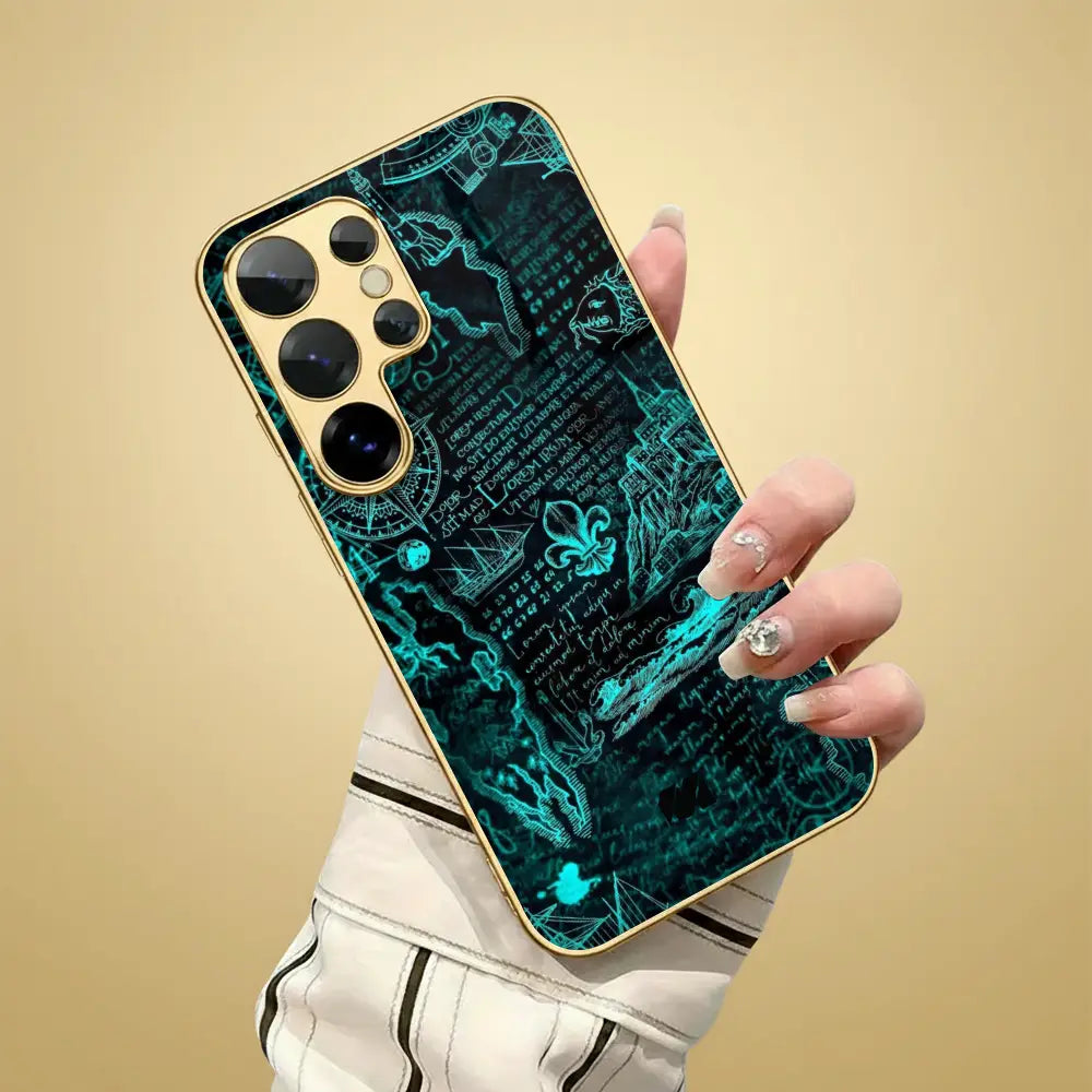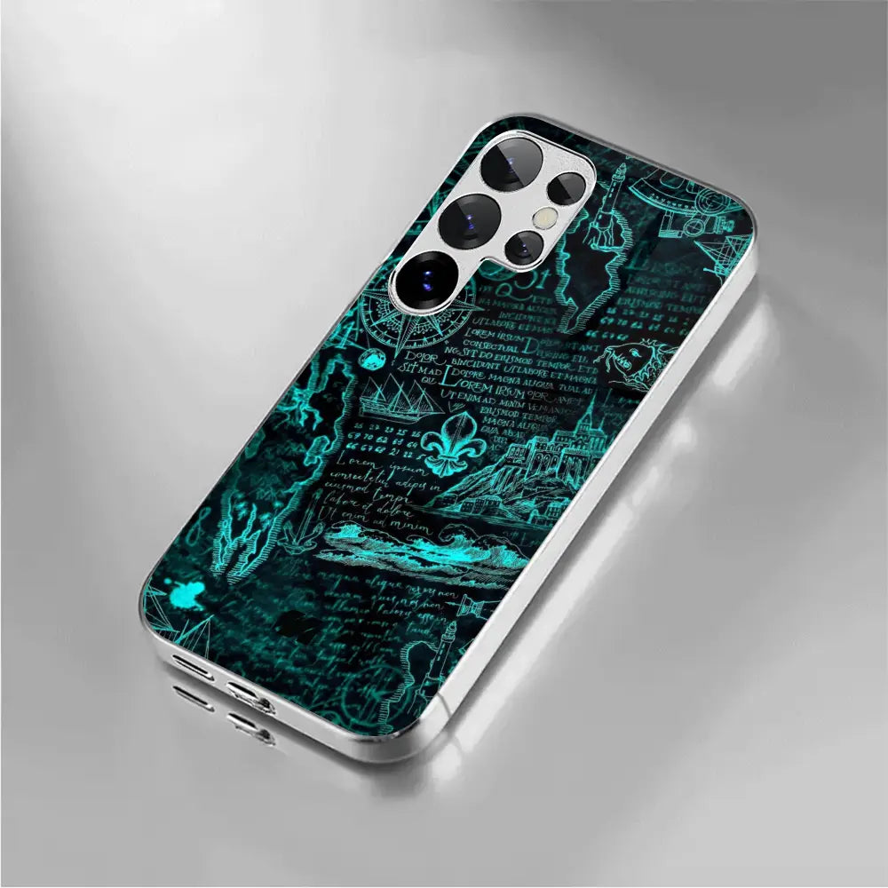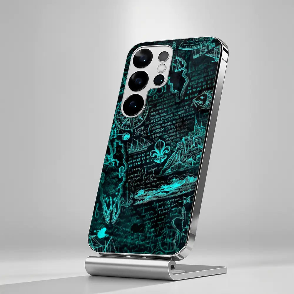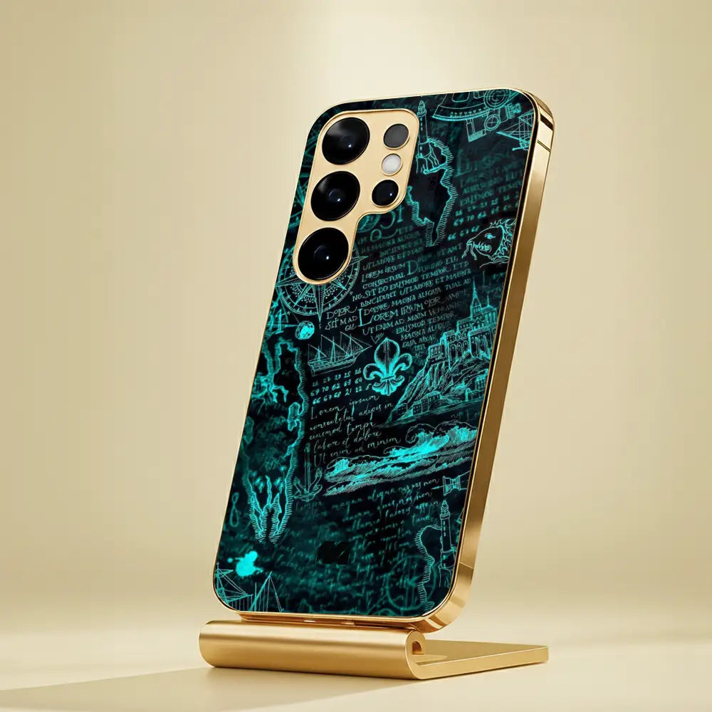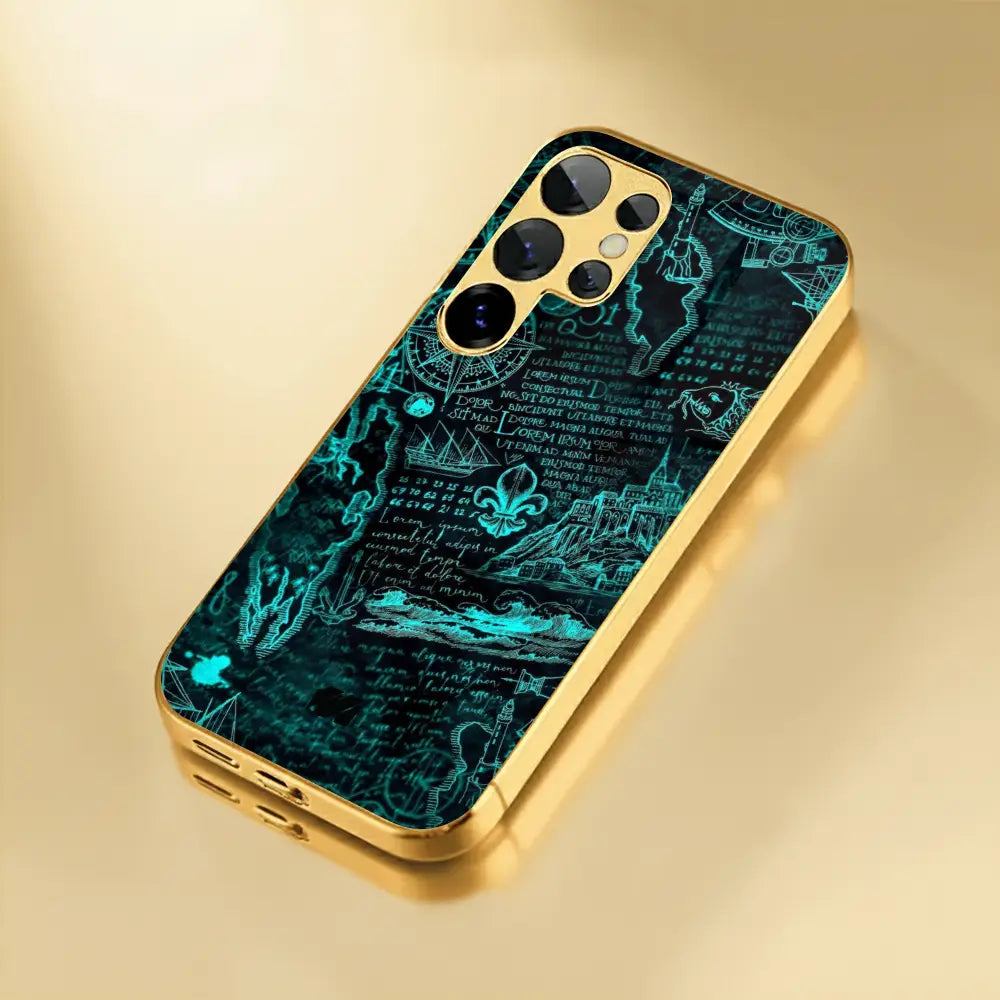 Featuring an enchanting neon-teal map design that glows with depth and detail, this case transforms your phone into a portal to a hidden world. The golden metallic frame adds a luxurious finish, creating a flawless balance of sophistication and fantasy.