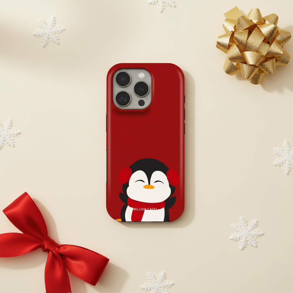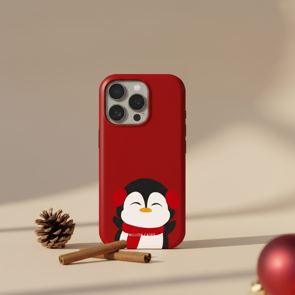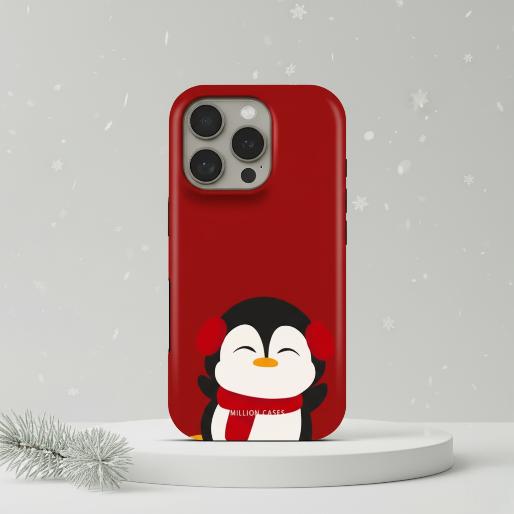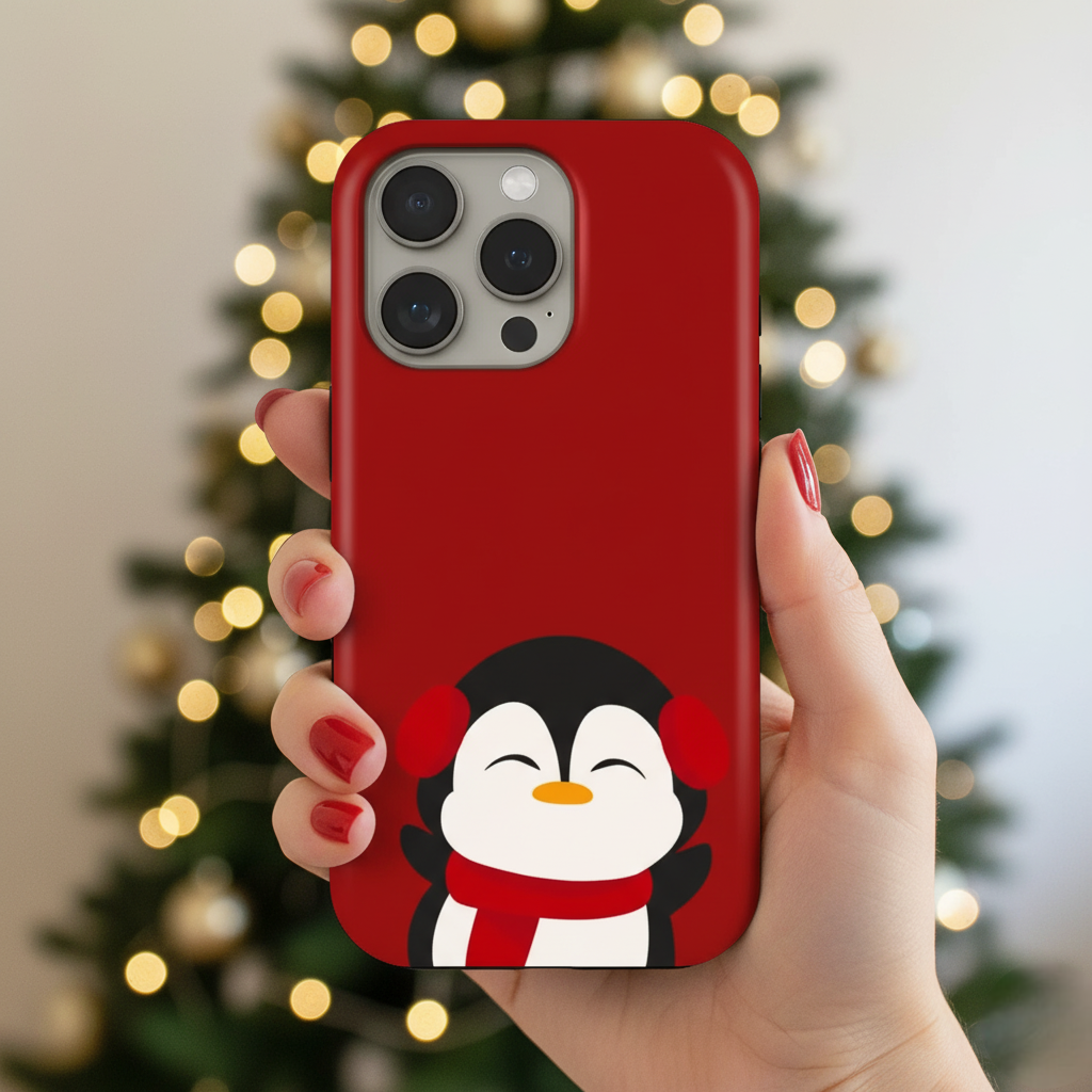 Wrap your phone in pure winter charm with the Arctic Cuddle case. Featuring an adorable penguin in cozy earmuffs and a warm red scarf, this case brings a soft and joyful festive vibe to your everyday style. The rich red background makes the artwork pop while adding a cheerful holiday touch.