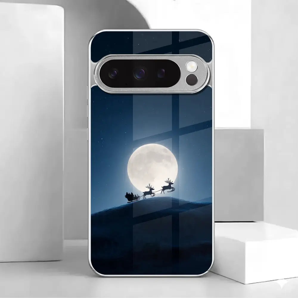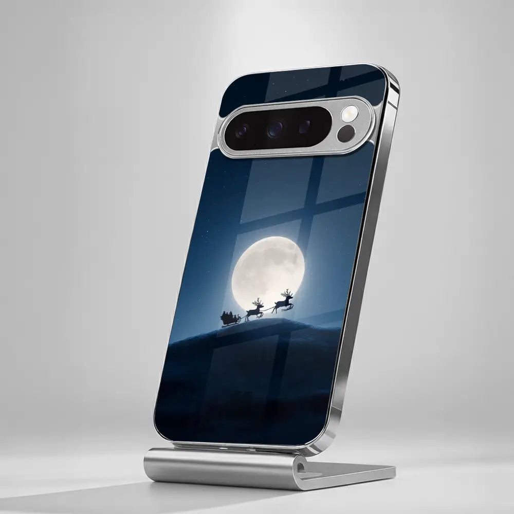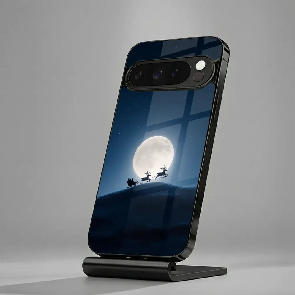 The Celestial Rider Case captures the magic of a moonlit winter night, featuring a serene silhouette of Santa’s sleigh gliding across a glowing full moon. Set against a deep, starry backdrop, the design blends festive charm with celestial elegance.