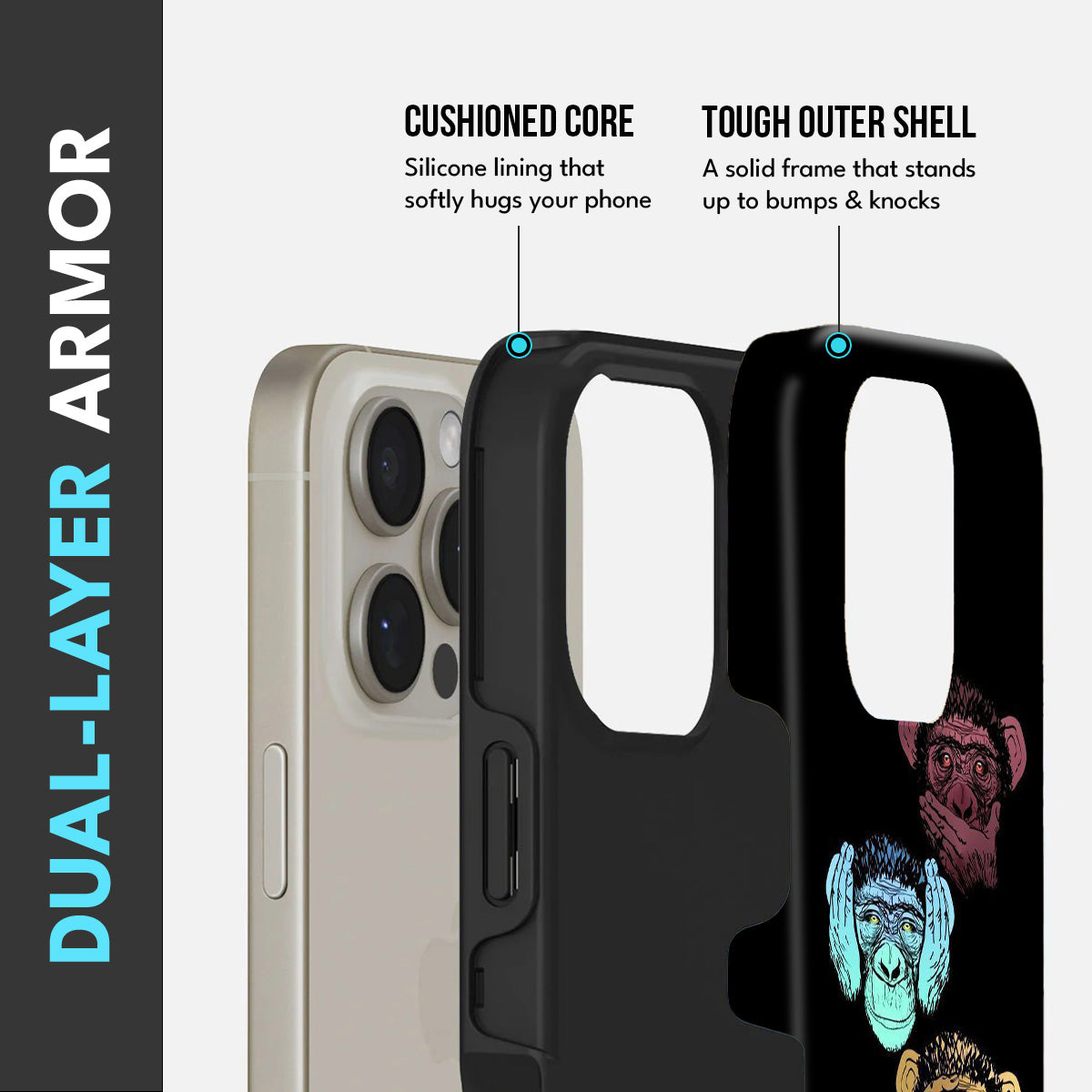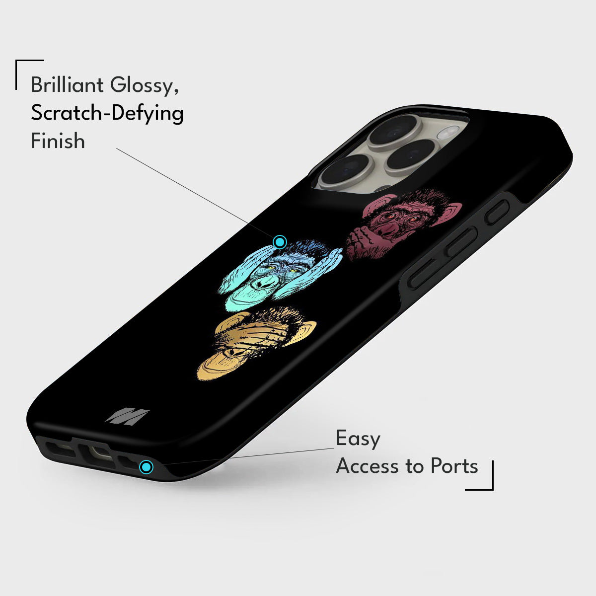Bring wisdom and personality to your phone with the Moral Monkeys Case. Featuring the iconic “See No Evil, Hear No Evil, Speak No Evil” monkeys illustrated in bold, colorful detail, this case turns a classic moral message into playful modern art. Each monkey pops against the sleek black background, creating a stylish design that’s both meaningful and eye-catching.
