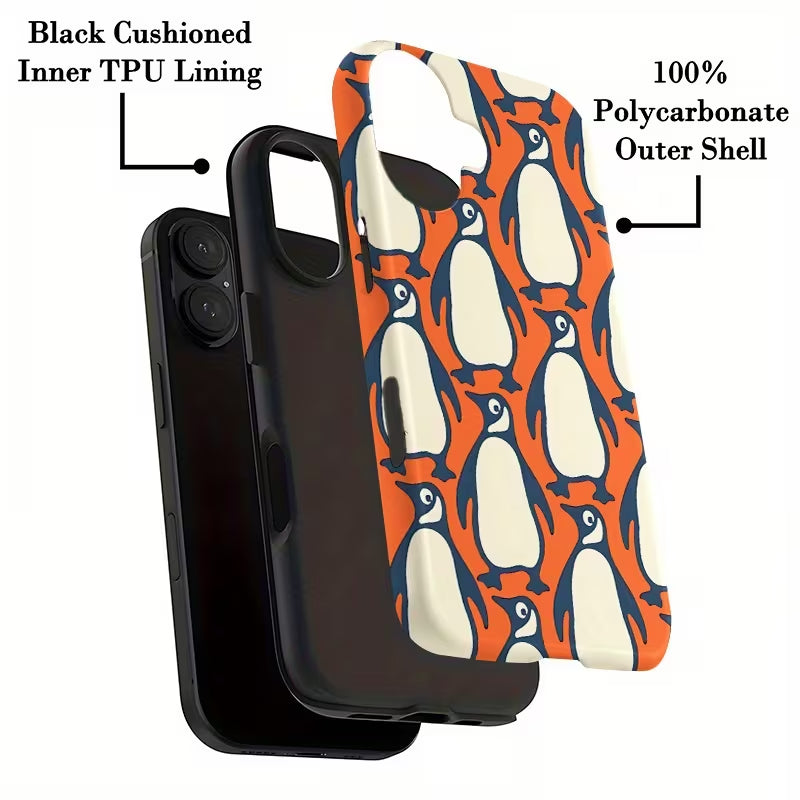 Bring a burst of playful charm to your phone with the Penguin Parade case. Featuring a delightful repeating pattern of stylized penguins in bold navy and warm cream tones set against a vibrant orange backdrop, this design radiates quirky personality and feel-good energy.