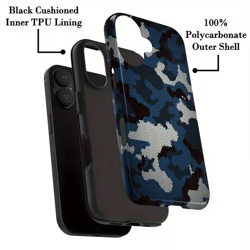 The Pixel Camo Case brings a modern twist to the classic camouflage look with its digital, pixel-style pattern in deep blues, greys, and blacks. Designed for those who love tactical aesthetics with a tech-inspired edge, this case blends rugged attitude with sleek everyday style.