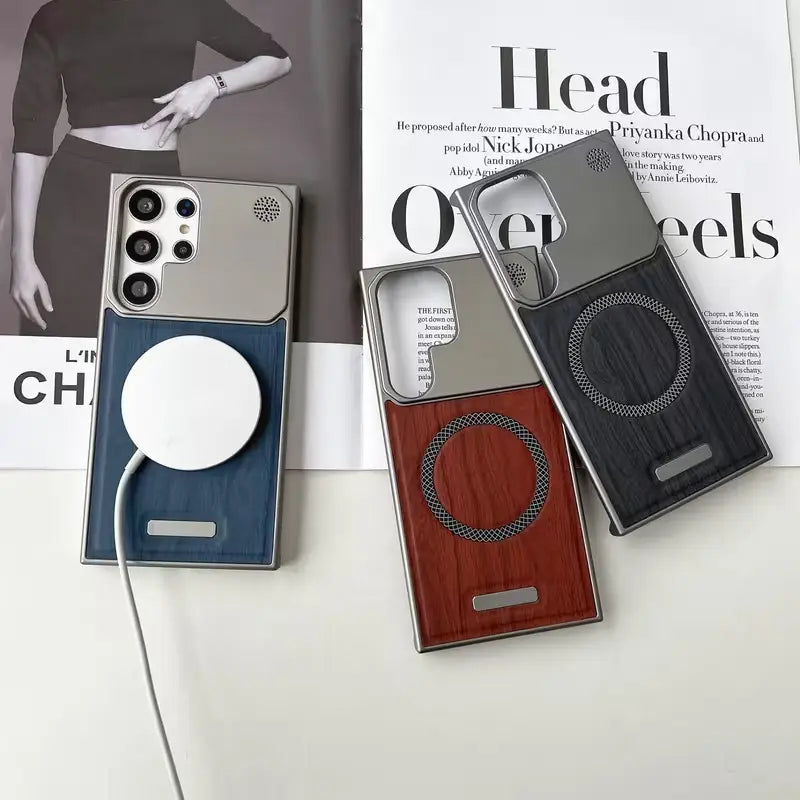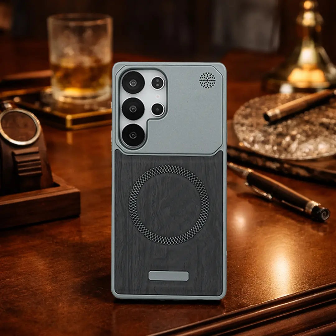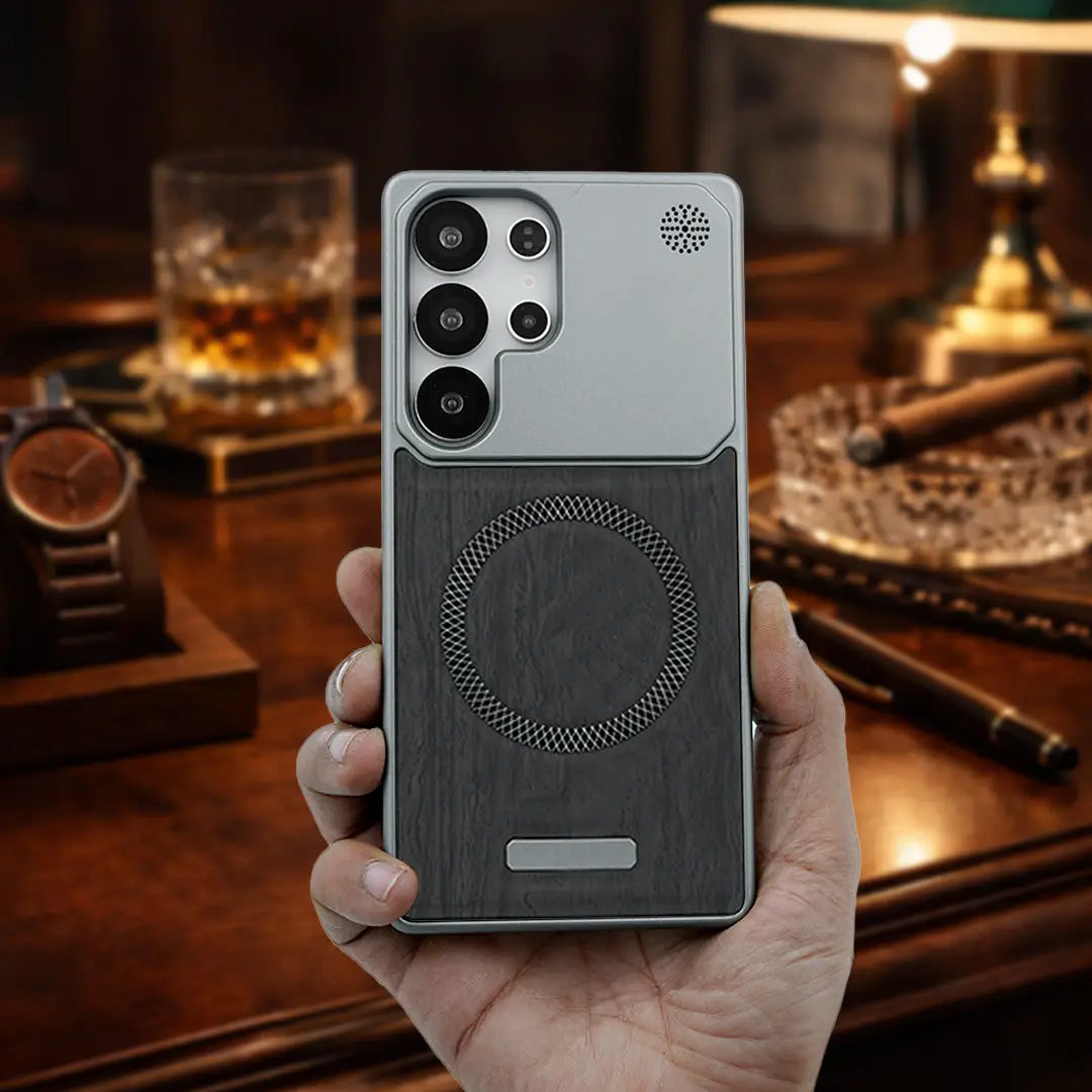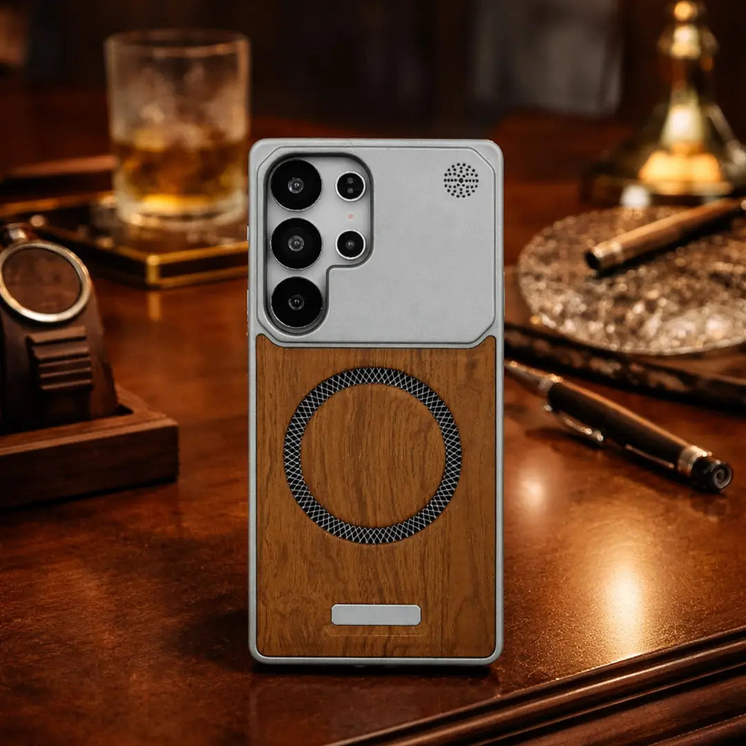 Elevate your device with the refined blend of modern design and natural texture. The Contemporary MagSafe Wood Case combines a sleek, industrial top half with a beautifully detailed wood-grain finish below, creating a striking contrast that stands out effortlessly.