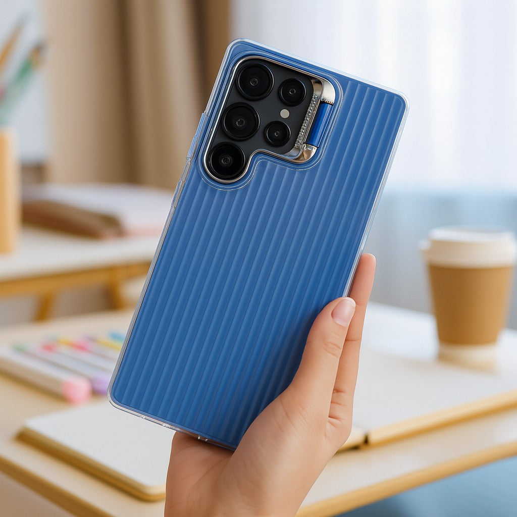 The Mirror Gloss Shield Case combines style and protection in one sleek design. Its textured finish adds a secure grip, while the lens bracket ensures your camera stays safe from scratches and impacts.