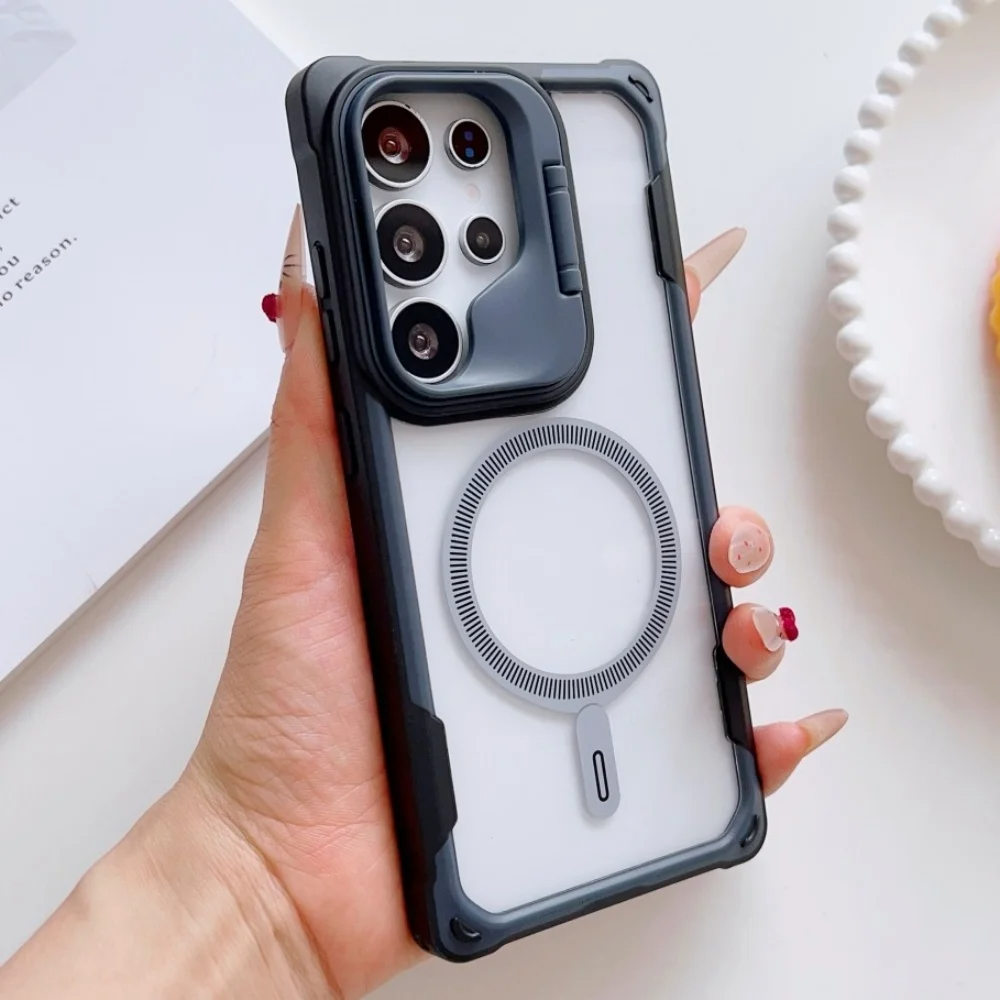 Unleash bold protection with a sleek, magnetic armor design. Crafted with a foldable lens stand, shockproof bumper, and a crystal-clear acrylic shield, this case is designed to deliver fearless style and flawless durability.