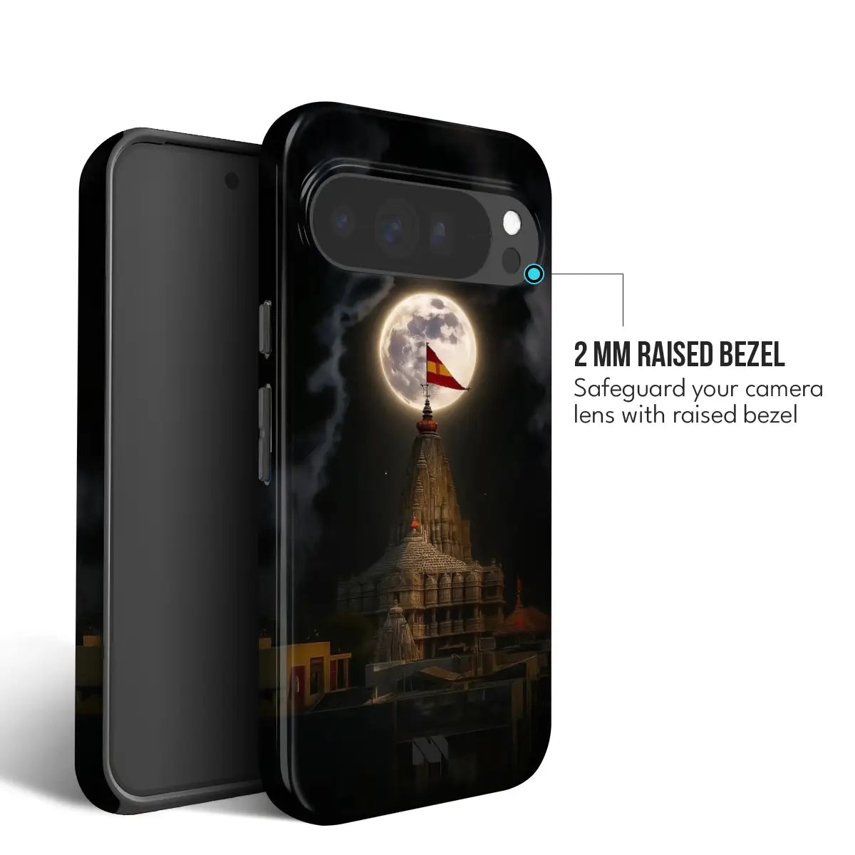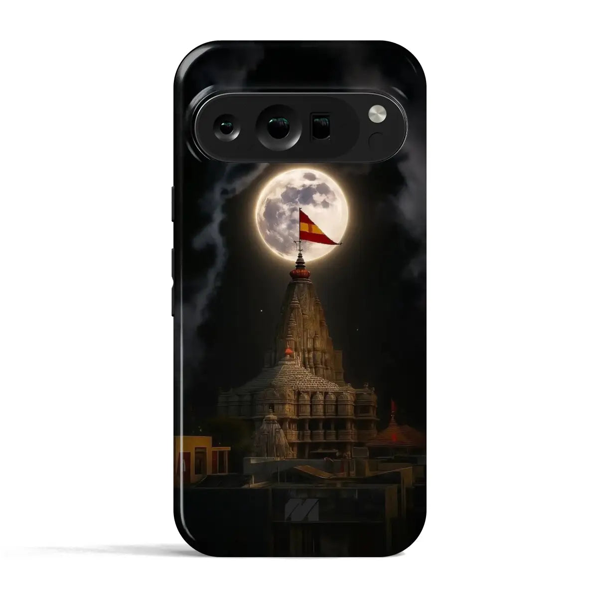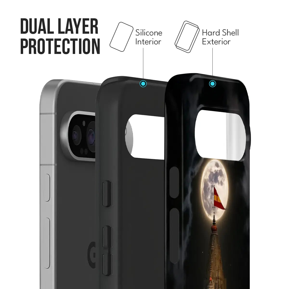 Inspired by a sacred temple rising beneath a radiant full moon, this design captures the moment where belief meets eternity. The illuminated shrine represents resilience, while the soaring banner reflects pride, strength, and spiritual identity. Set against a deep midnight backdrop, the artwork evokes calm, power, and reverence all at once.