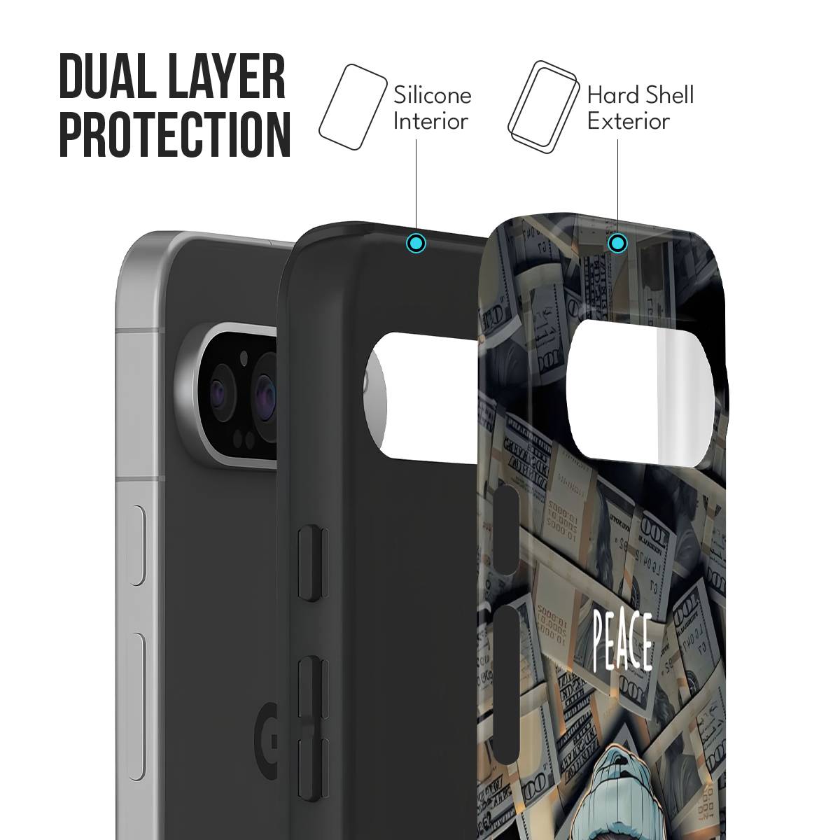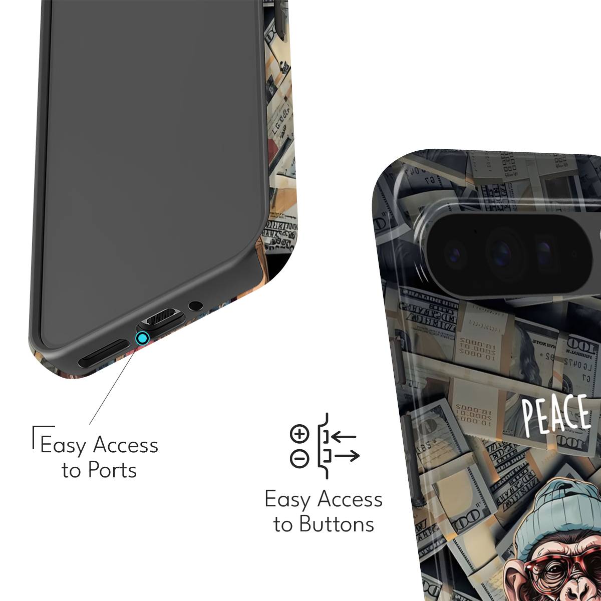 Bring bold energy and street-art swagger to your phone with the Hustle Ape Case—a design made for those who grind hard, live loud, and stay unbothered. Featuring a stylish, chilled-out ape in sunglasses and a floral shirt flashing the peace sign against a backdrop of stacked cash, this case captures the perfect mix of hustle and vibe.