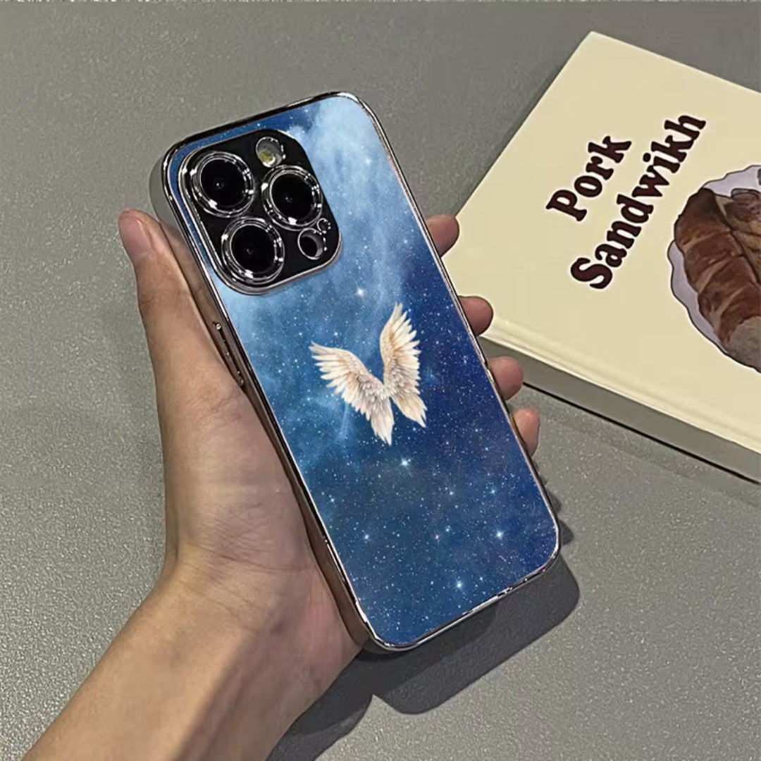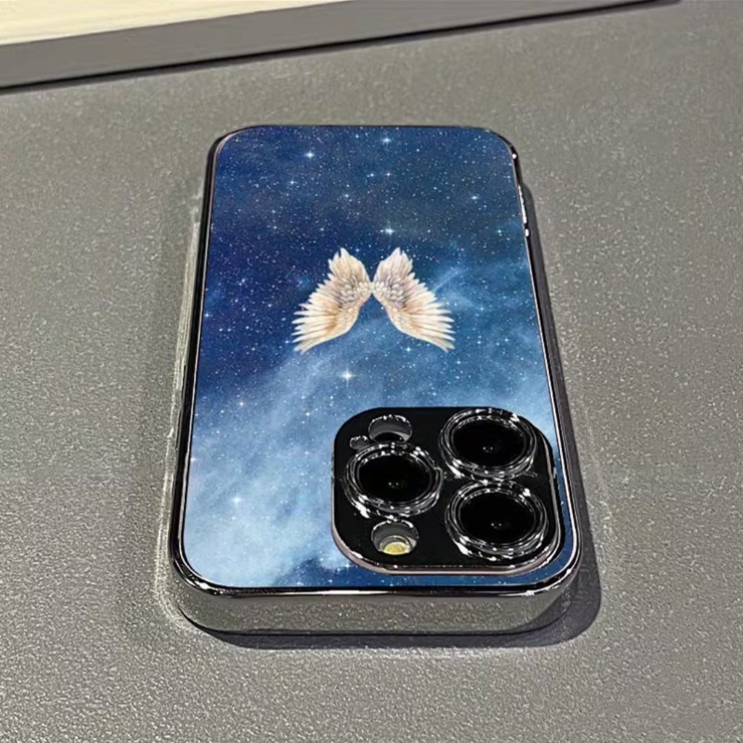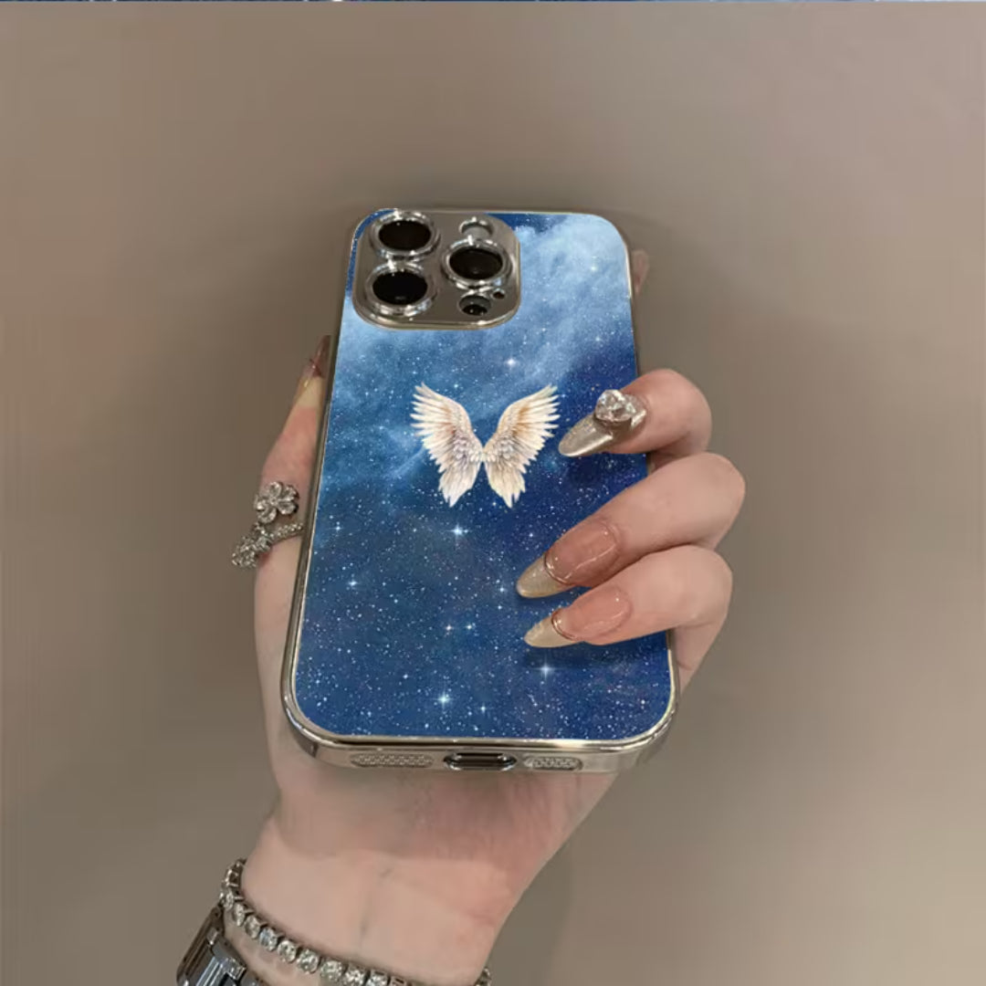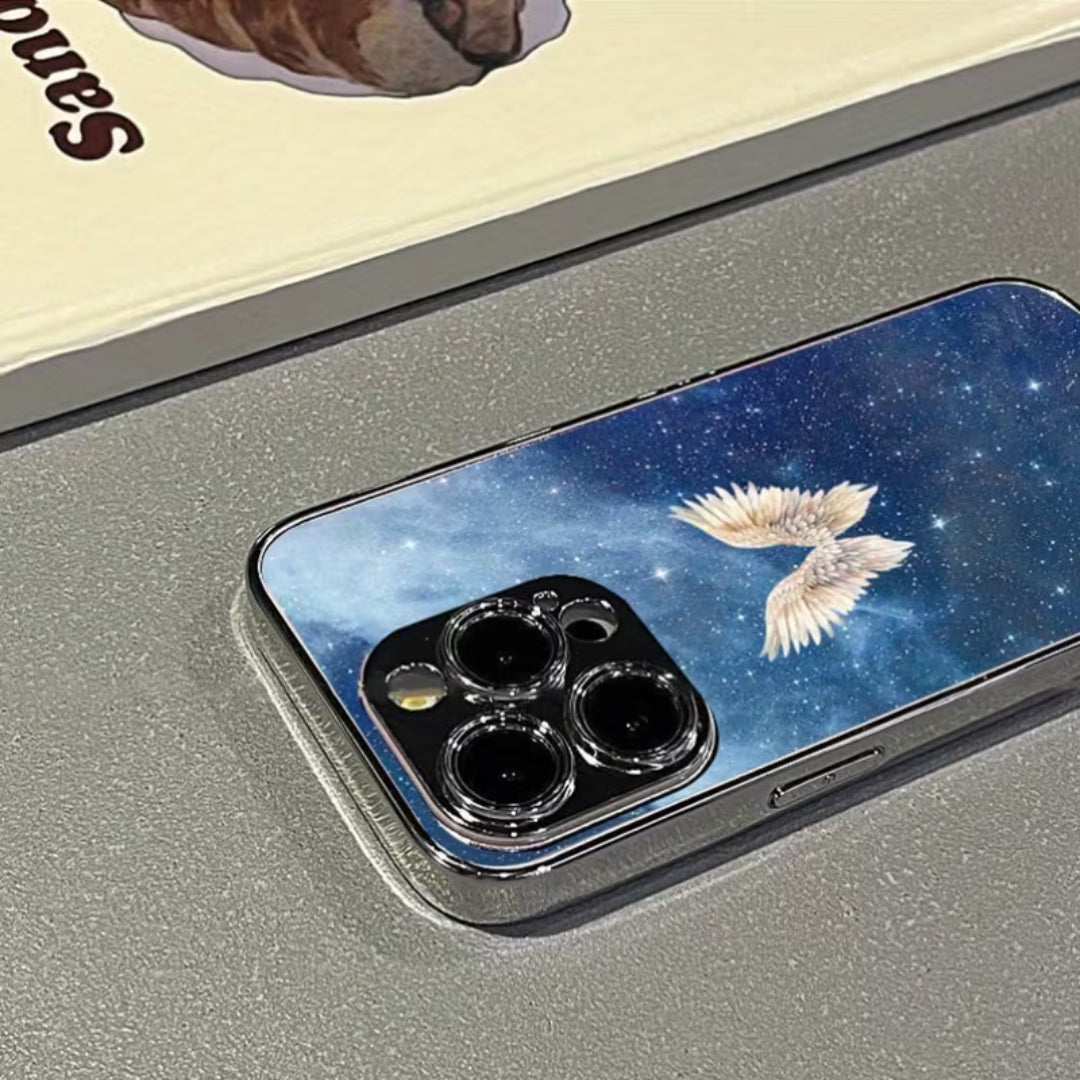 Soft light meets infinite space in Lucent Wings. Set against a deep, starlit sky, luminous angel wings glow with quiet radiance—symbolizing protection, freedom, and grace. The cosmic backdrop adds depth and mystery, while the glossy finish enhances every detail, allowing the design to shimmer subtly as it catches the light.