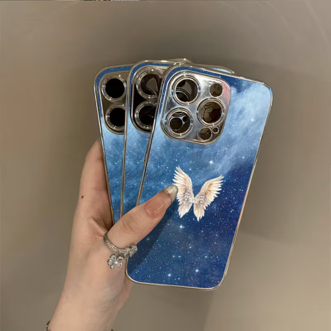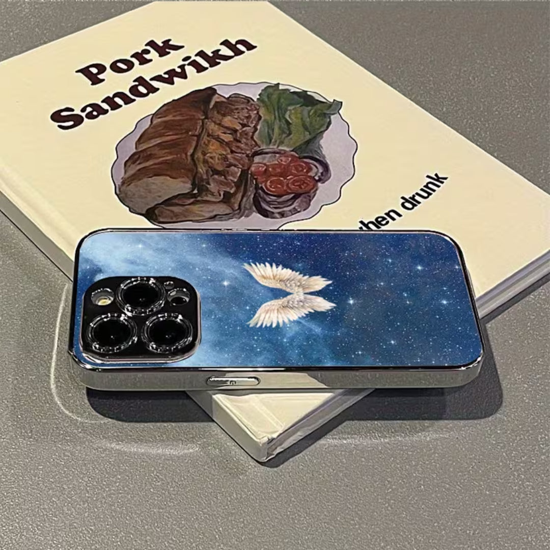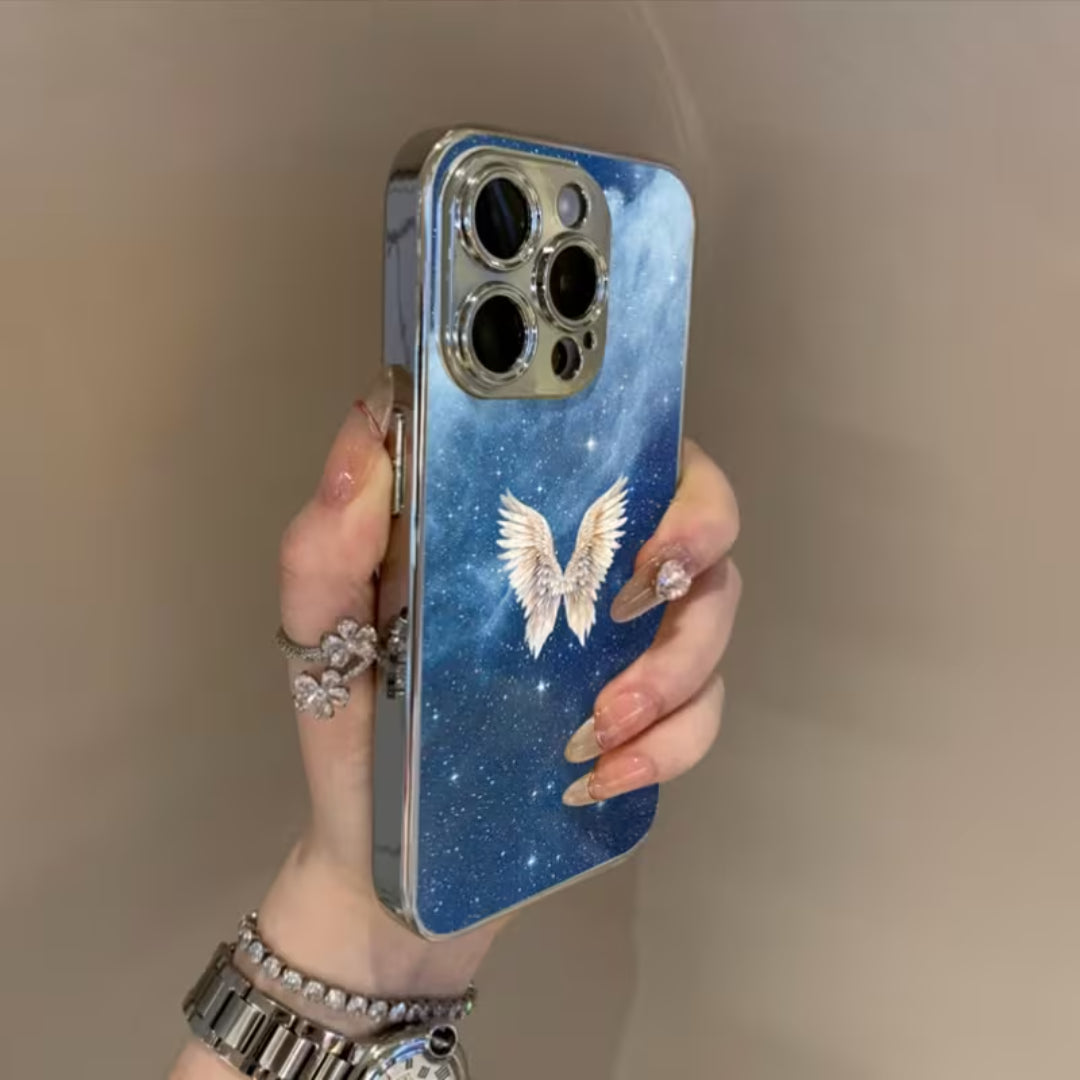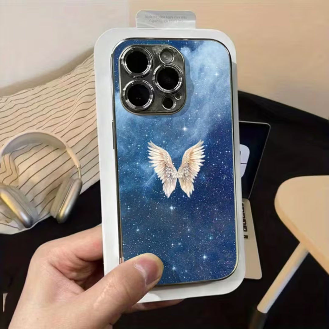 Soft light meets infinite space in Lucent Wings. Set against a deep, starlit sky, luminous angel wings glow with quiet radiance—symbolizing protection, freedom, and grace. The cosmic backdrop adds depth and mystery, while the glossy finish enhances every detail, allowing the design to shimmer subtly as it catches the light.