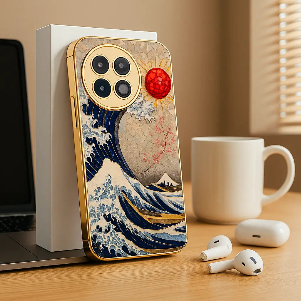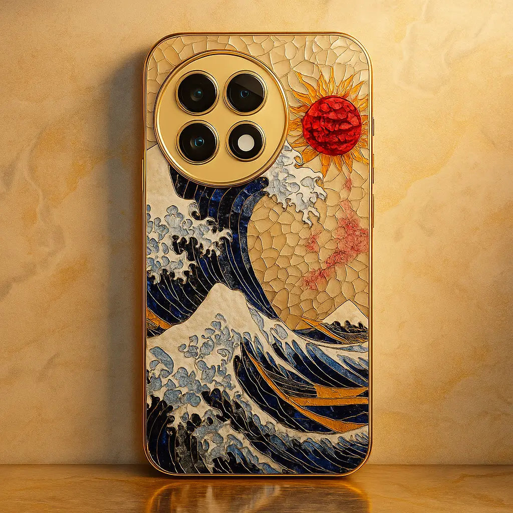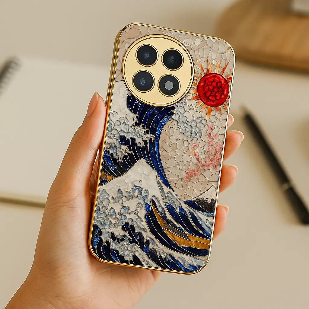 Inspired by the legendary Great Wave off Kanagawa, Shattered Sea reimagines the iconic scene through a mosaic lens — where each fragment reflects the chaos and beauty of nature. With deep indigo waves crashing beneath a radiant crimson sun, this case tells a story of motion, energy, and timeless art.