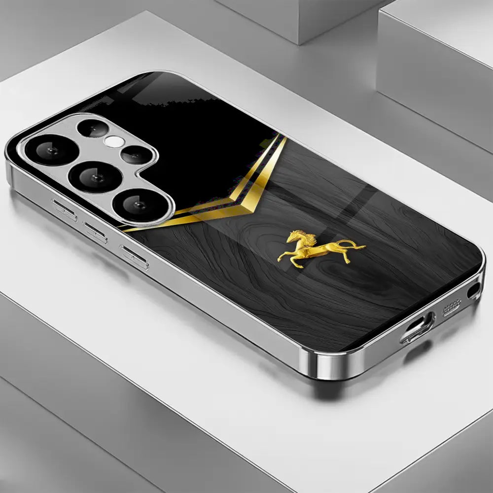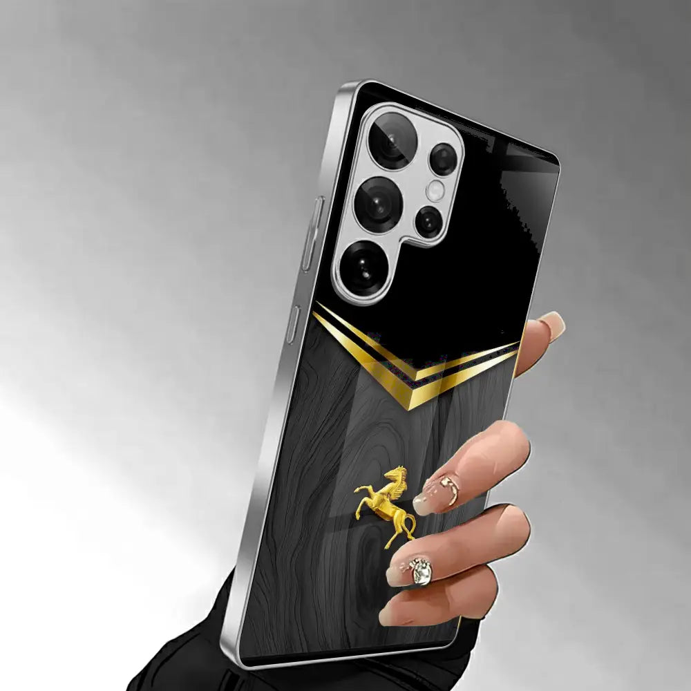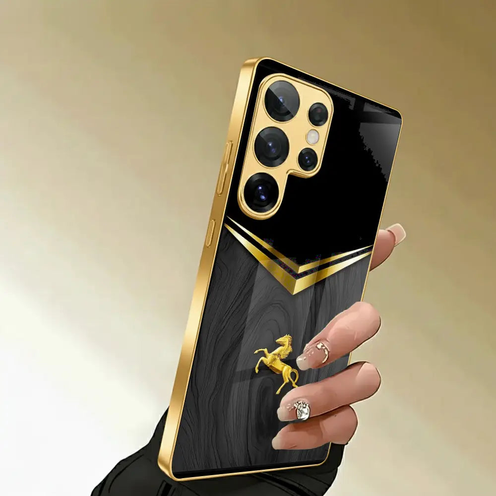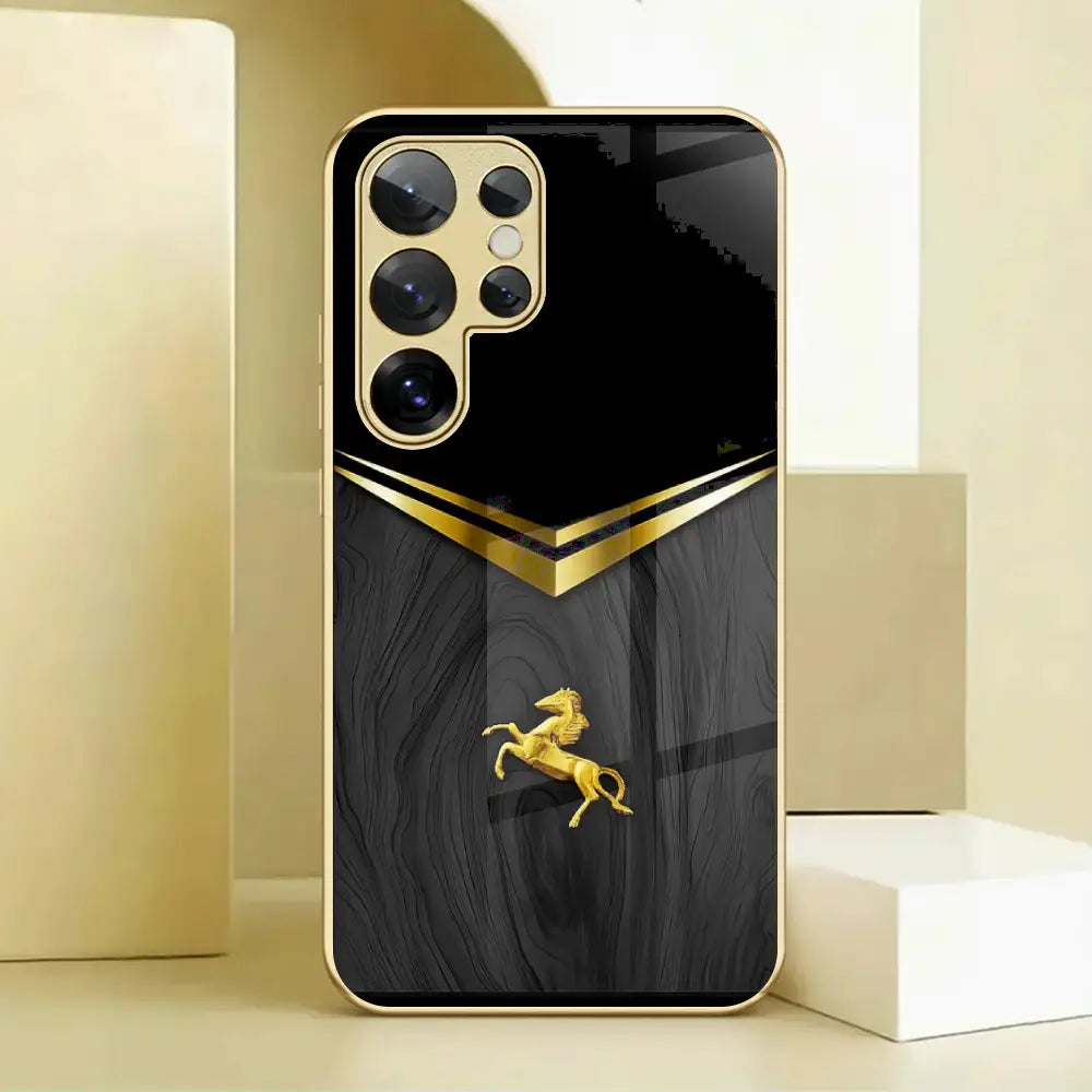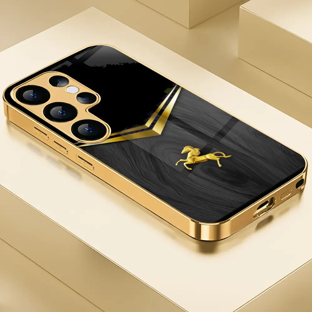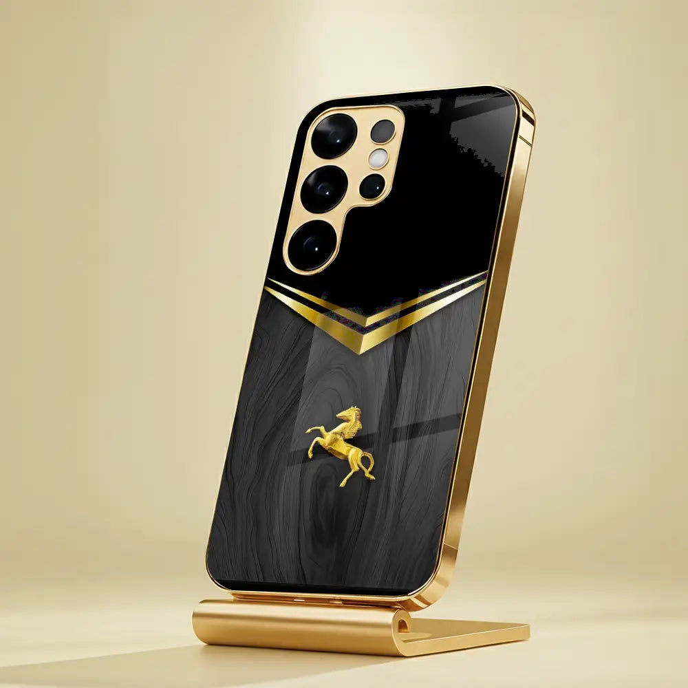 Commanding and refined, the Night Horse Case brings a dash of equestrian luxury to your phone. A deep ebony look like wood-grain panel anchors the design, finished with a sculpted golden stallion emblem and a faceted gold accent at the camera crown. Beneath the couture look, a rigid back and shock-absorbing bumper team up for everyday drop protection—so you get elegance without compromise.