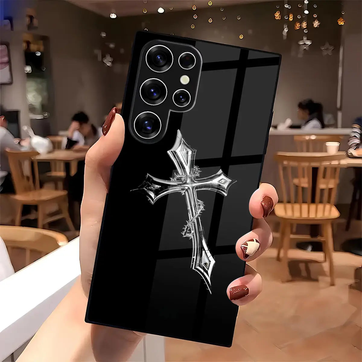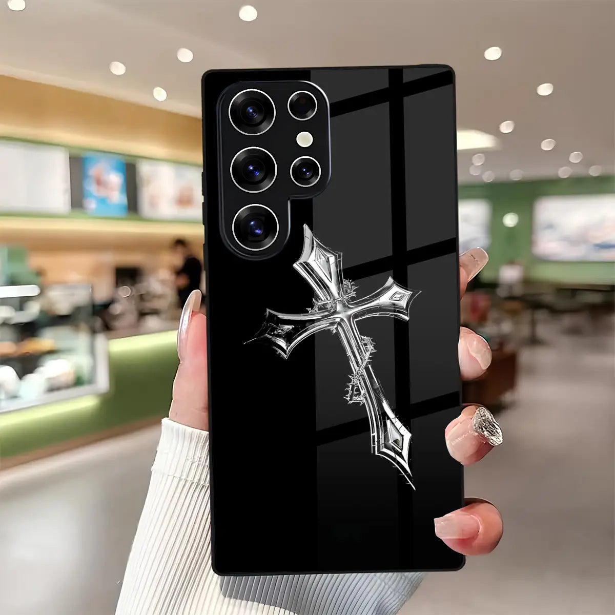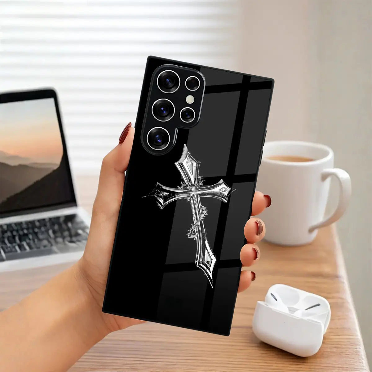 Cruciform Creed Case stands at the intersection of faith, strength, and restraint. Set against a deep black glass finish, the refined metallic cross emerges with quiet authority—symbolizing conviction, discipline, and an unshakable inner code. Minimal yet commanding, the design speaks without excess, making a powerful statement through simplicity.