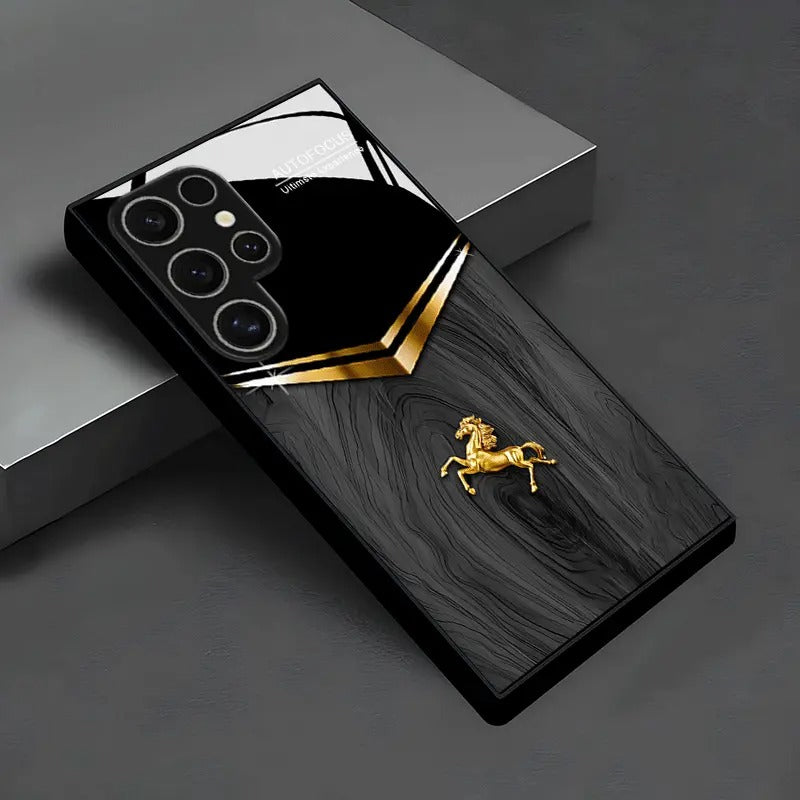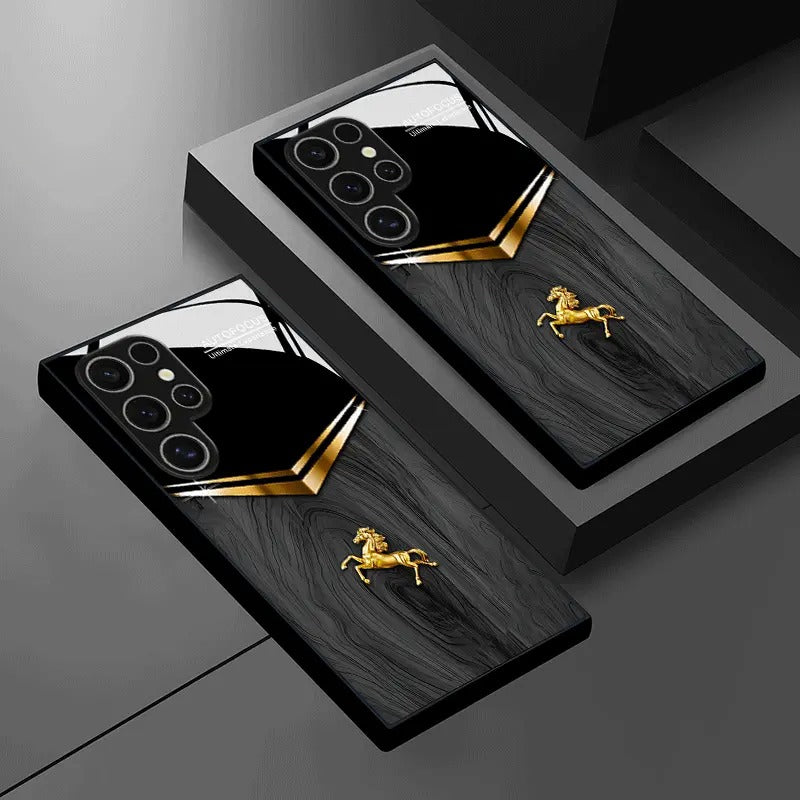 Commanding and refined, the Night Horse Case brings a dash of equestrian luxury to your phone. A deep ebony look like wood-grain panel anchors the design, finished with a sculpted golden stallion emblem and a faceted gold accent at the camera crown. Beneath the couture look, a rigid back and shock-absorbing bumper team up for everyday drop protection—so you get elegance without compromise.