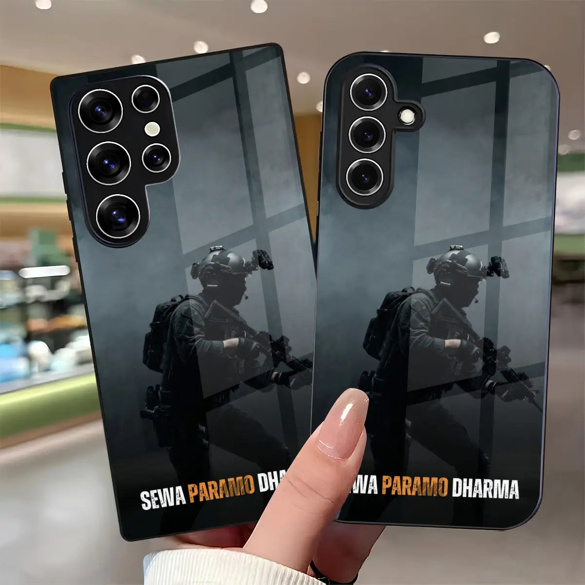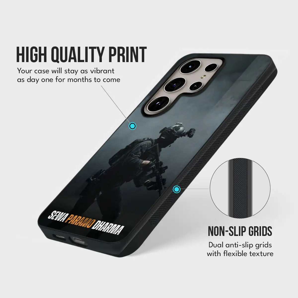 Inspired by the eternal principle of “Seva Paramo Dharma”—service above all—Paramo Dharma stands as a tribute to duty, sacrifice, and unwavering commitment. Featuring a disciplined soldier rendered in a dark, minimalist composition, this case reflects courage carried quietly and honor lived daily.