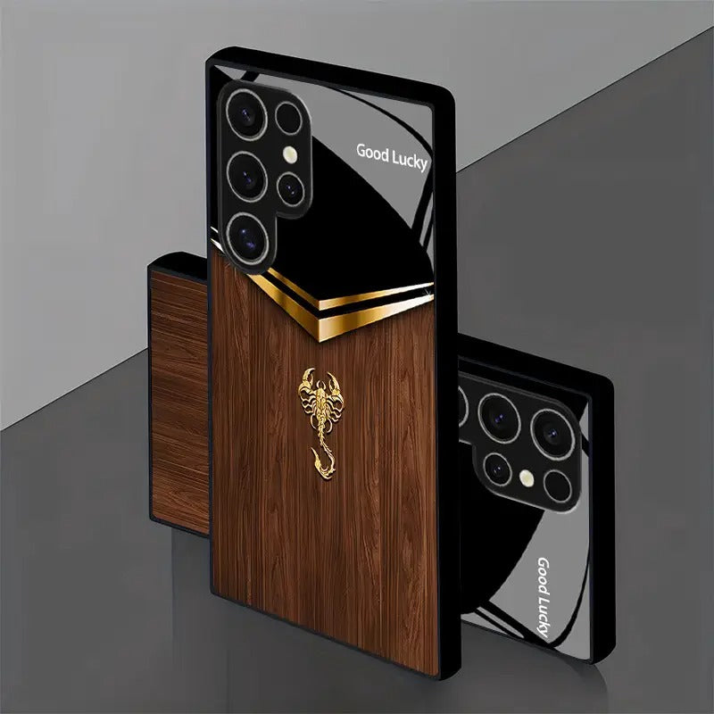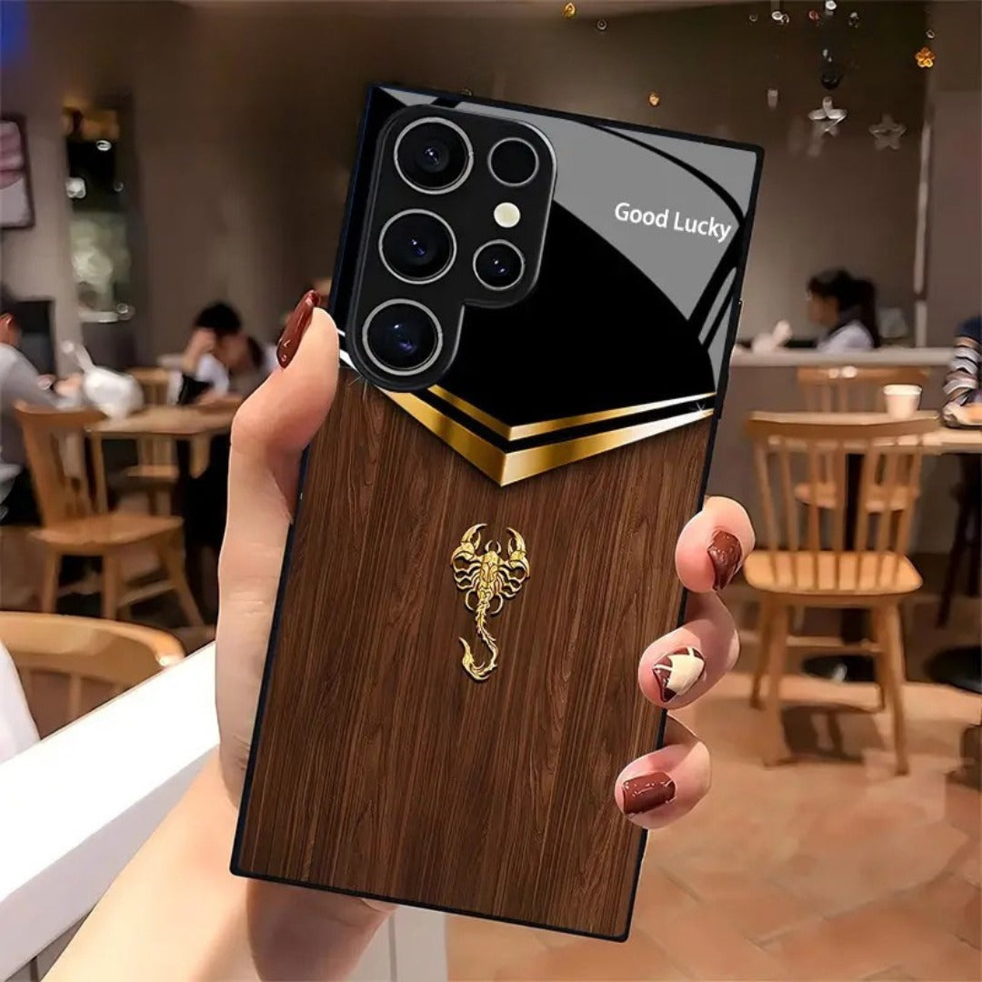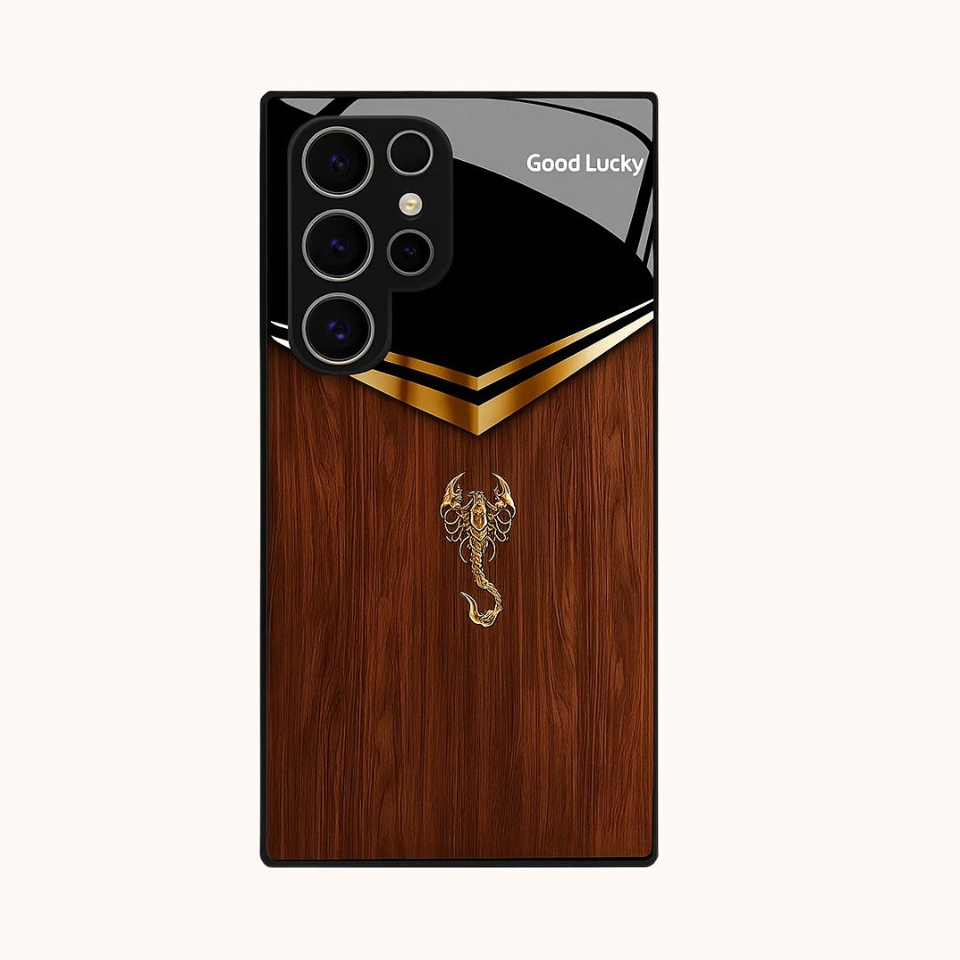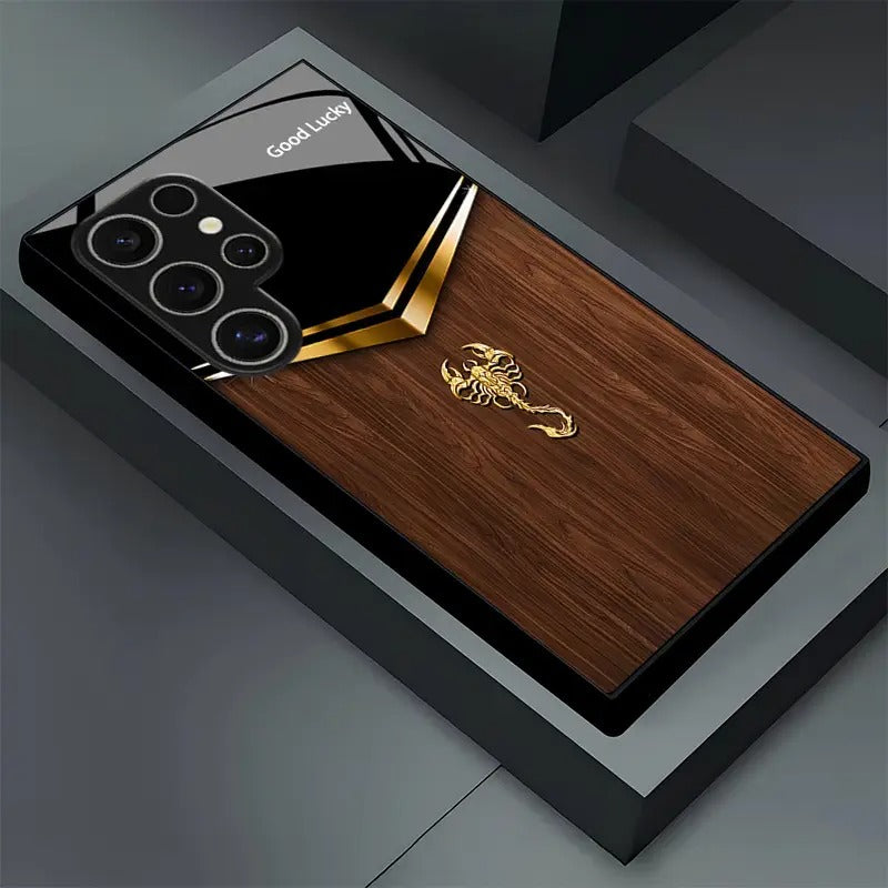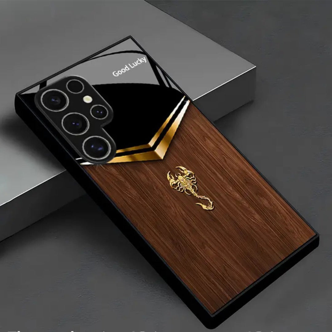 Royal Carapace is a commanding case that wraps your phone in boardroom luxury. Rich walnut grain meets a piano-black top and gilded chevron, crowned by a sculpted scorpion emblem for armored elegance. Its glossy finish and refined details make it an irresistible power accessory.