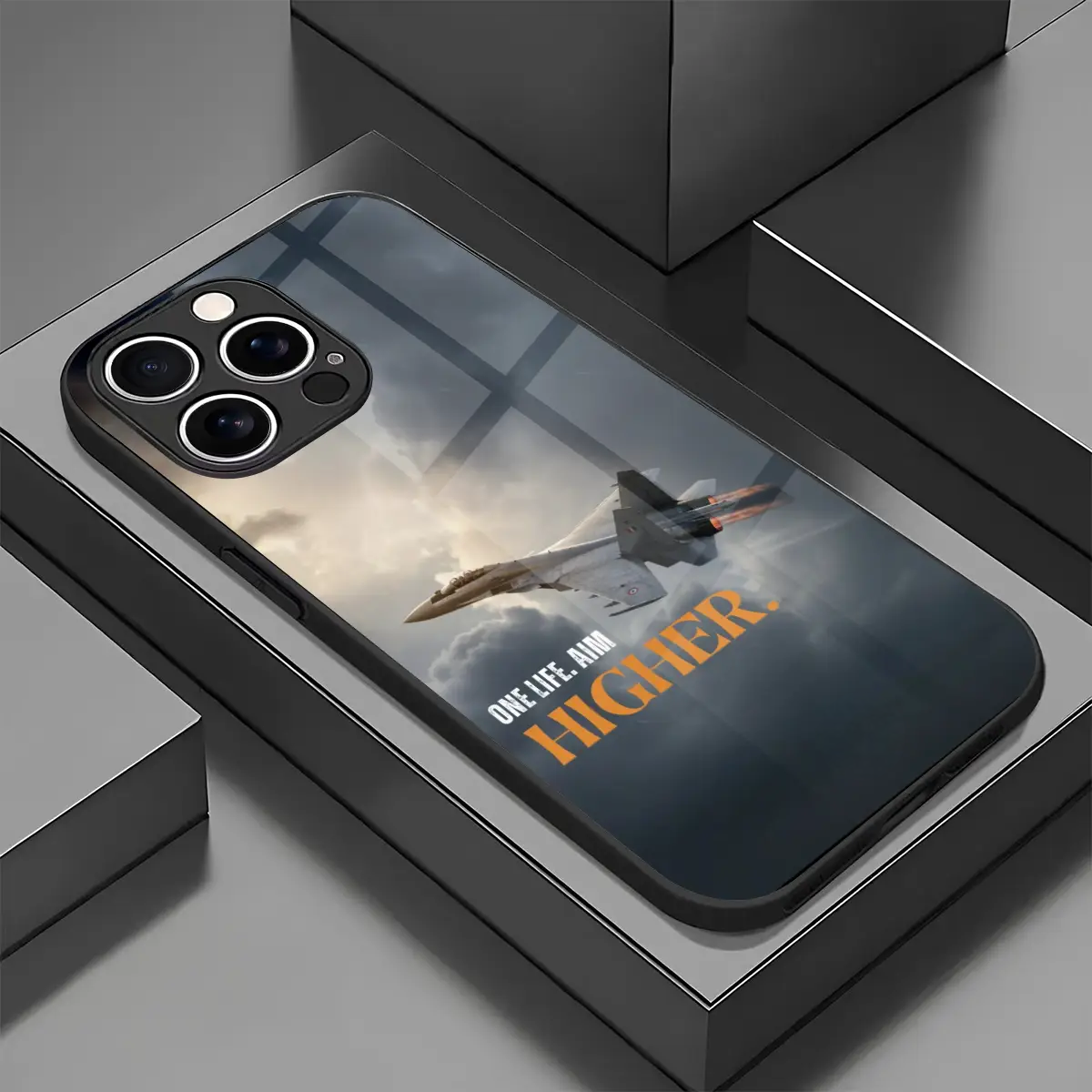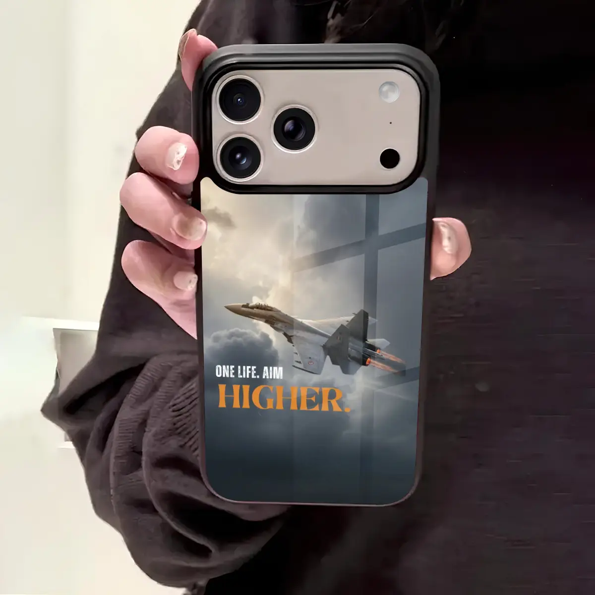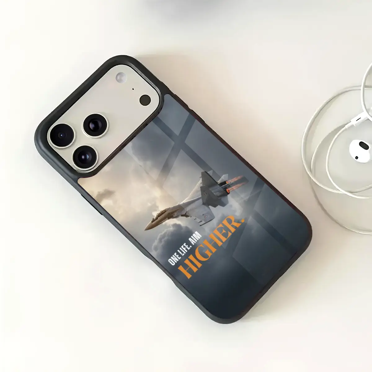 Inspired by the spirit of aviation and the courage to rise above limits, the Aim Higher case captures ambition in motion. Featuring a powerful fighter jet soaring through dramatic clouds, this design symbolizes focus, fearlessness, and the drive to push beyond boundaries. The bold typography reinforces a mindset of progress—one life, one direction, higher.