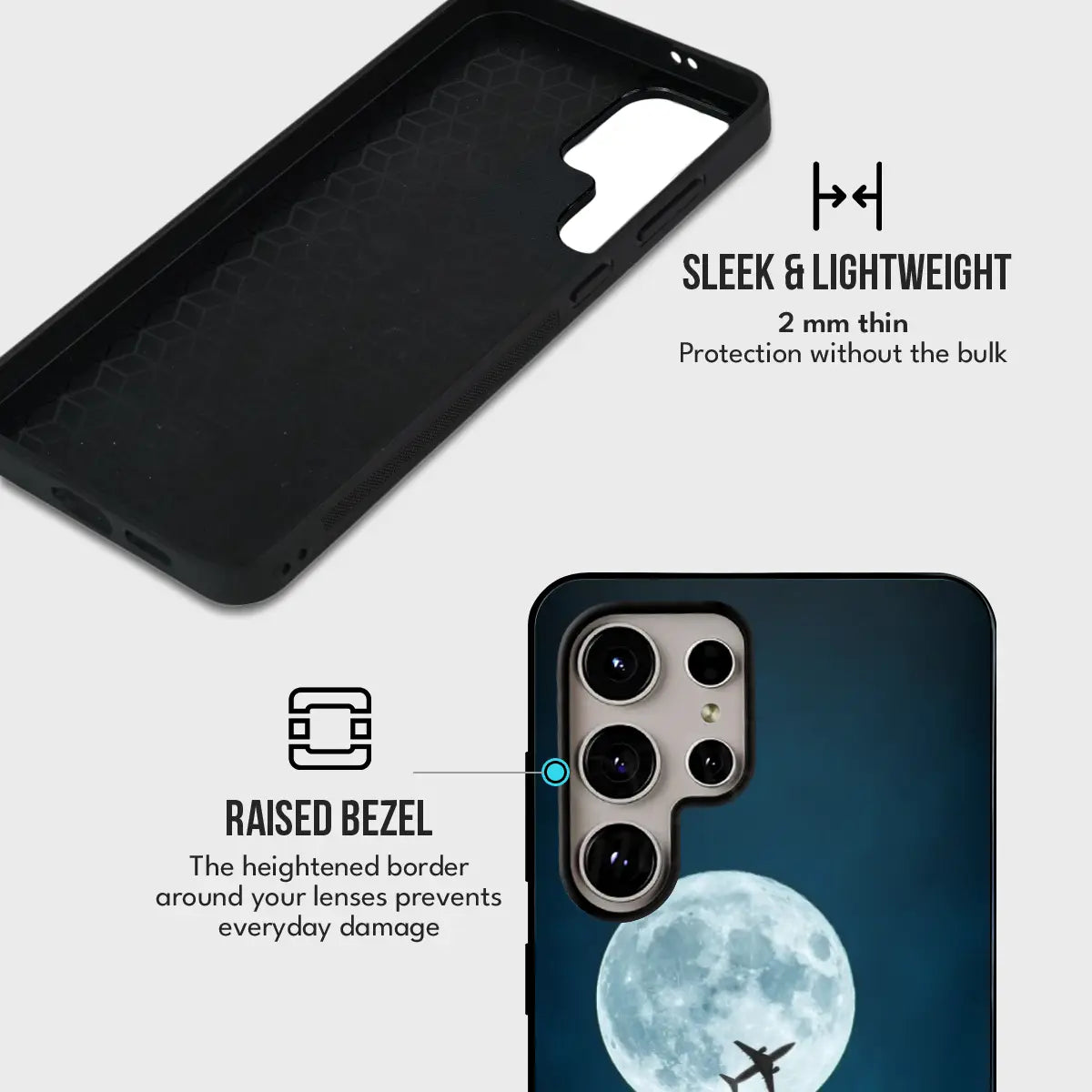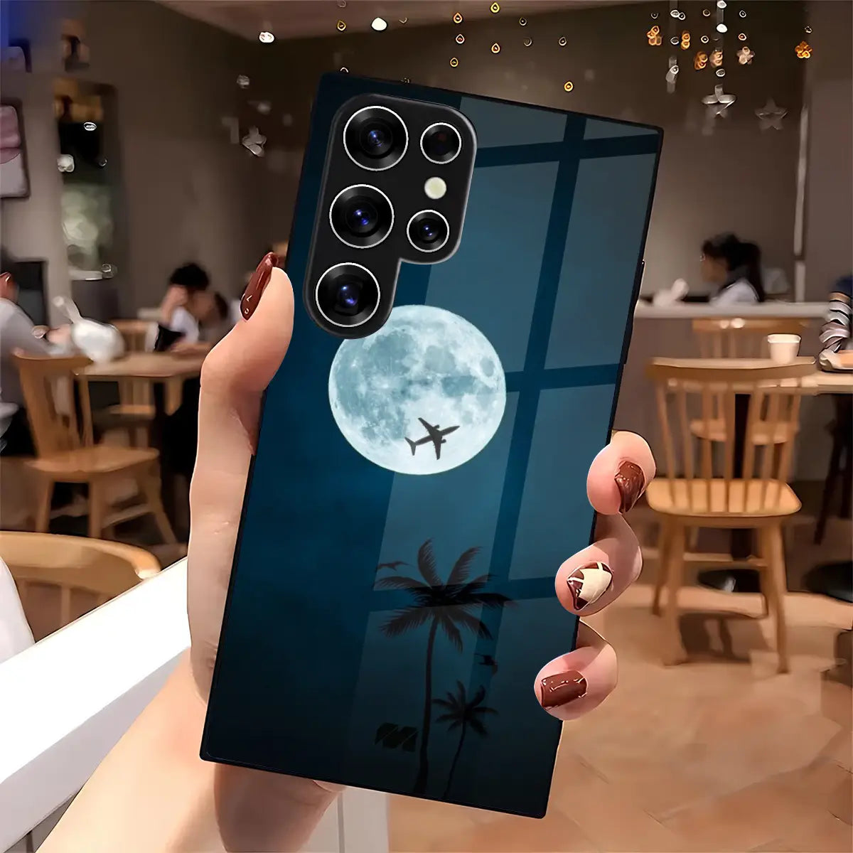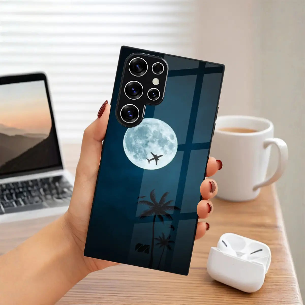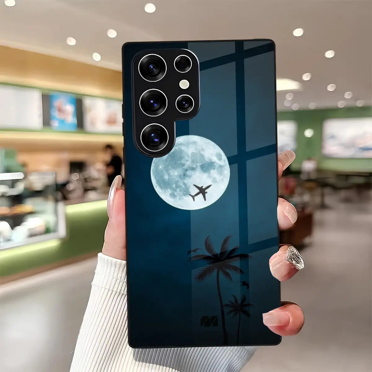 Set against a deep blue evening sky, the glowing full moon becomes a window to imagination as a lone aircraft drifts across its face. Silhouetted palms and soft reflections add depth and calm, creating a scene that feels both distant and familiar—like a dream you don’t want to wake from.