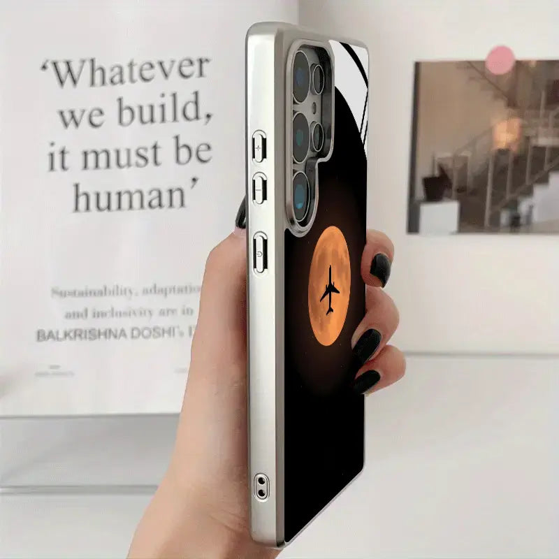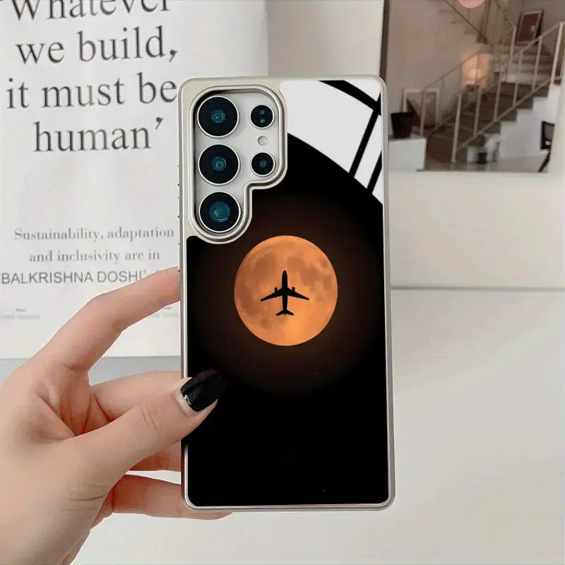 Experience the thrill of night skies every time you pick up your phone. The Midnight Takeoff case features a stunning silhouette of an airplane soaring across a glowing full moon, creating a dramatic, wanderlust-filled scene that inspires adventure.