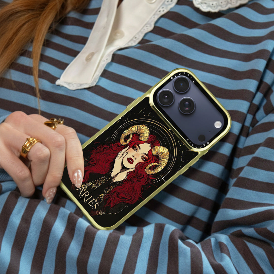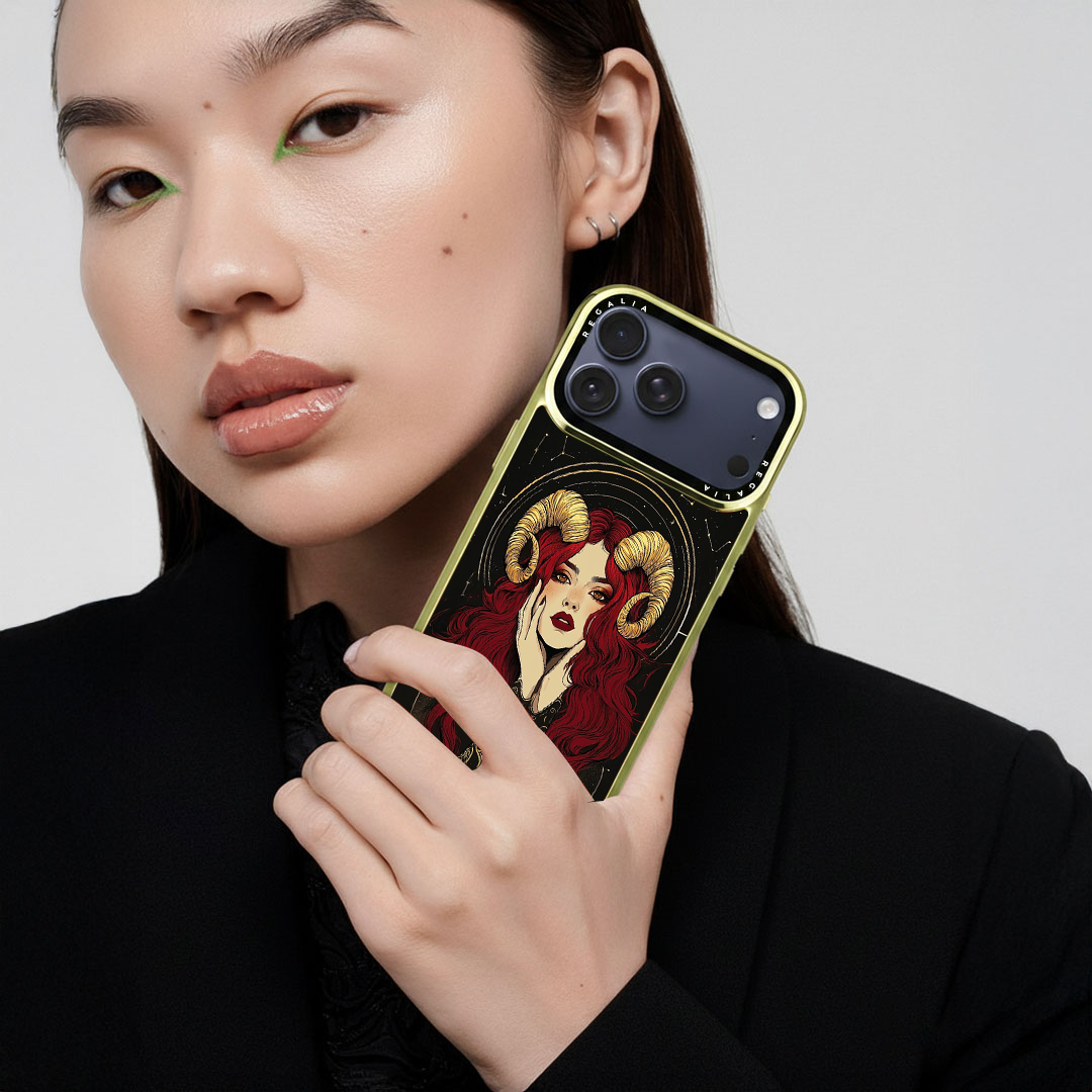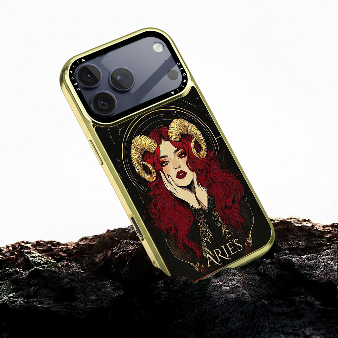 Aries Aura is a cosmic-chic case that channels fearless fire-sign energy. A striking muse with scarlet waves and gilded ram horns glows against a star-studded noir backdrop, framed by celestial arcs and ornate zodiac linework.