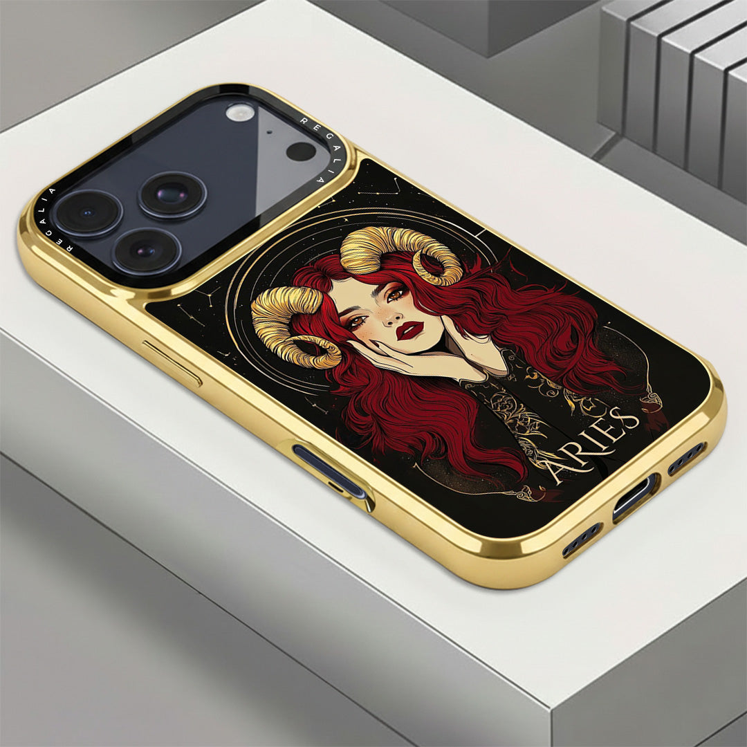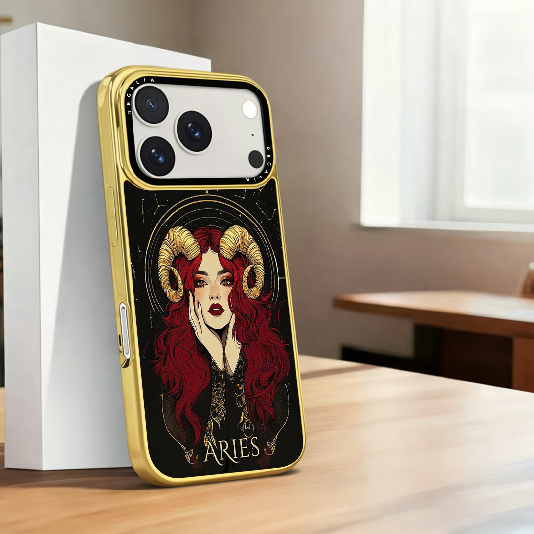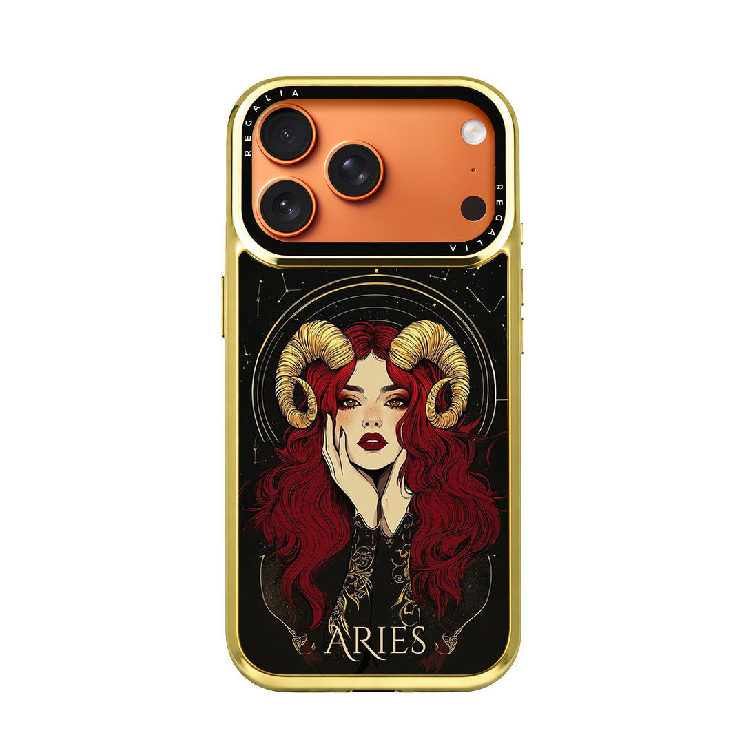 Aries Aura is a cosmic-chic case that channels fearless fire-sign energy. A striking muse with scarlet waves and gilded ram horns glows against a star-studded noir backdrop, framed by celestial arcs and ornate zodiac linework.