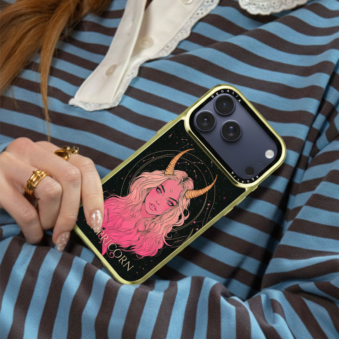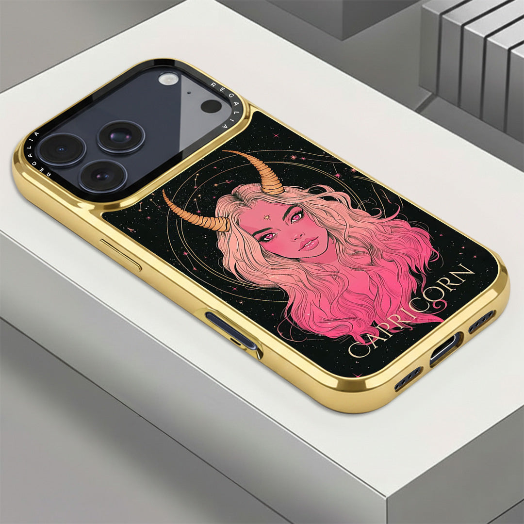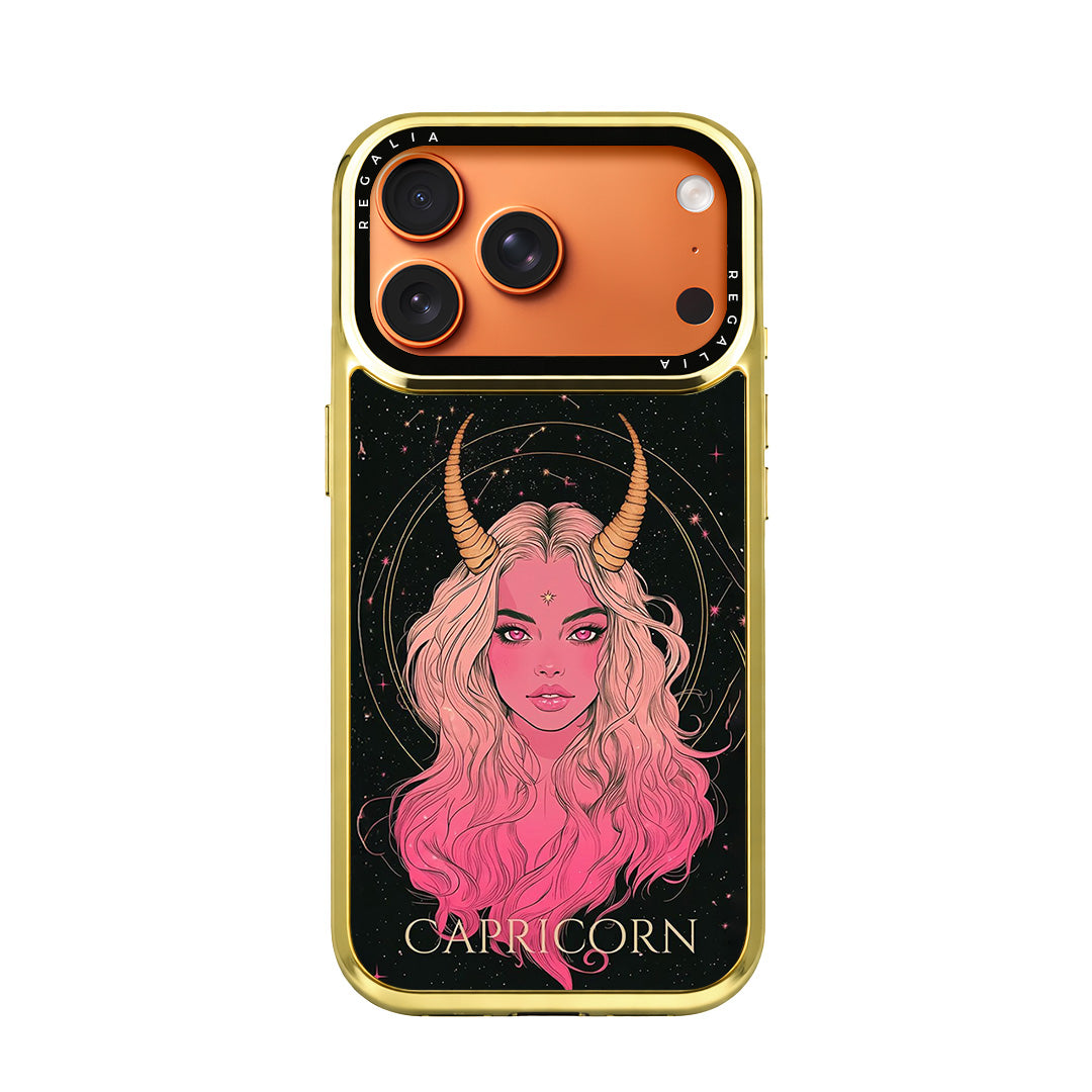 Capricorn Muse is a cosmic-chic case that celebrates elegant ambition. A luminous muse with cascading rose waves and gilded sea-goat horns glows against a star-sprinkled noir sky, framed by celestial arcs and Saturn-like rings. Ornate zodiac linework and a glossy finish make the gold accents shine—poised, powerful, and unmistakably Capricorn.