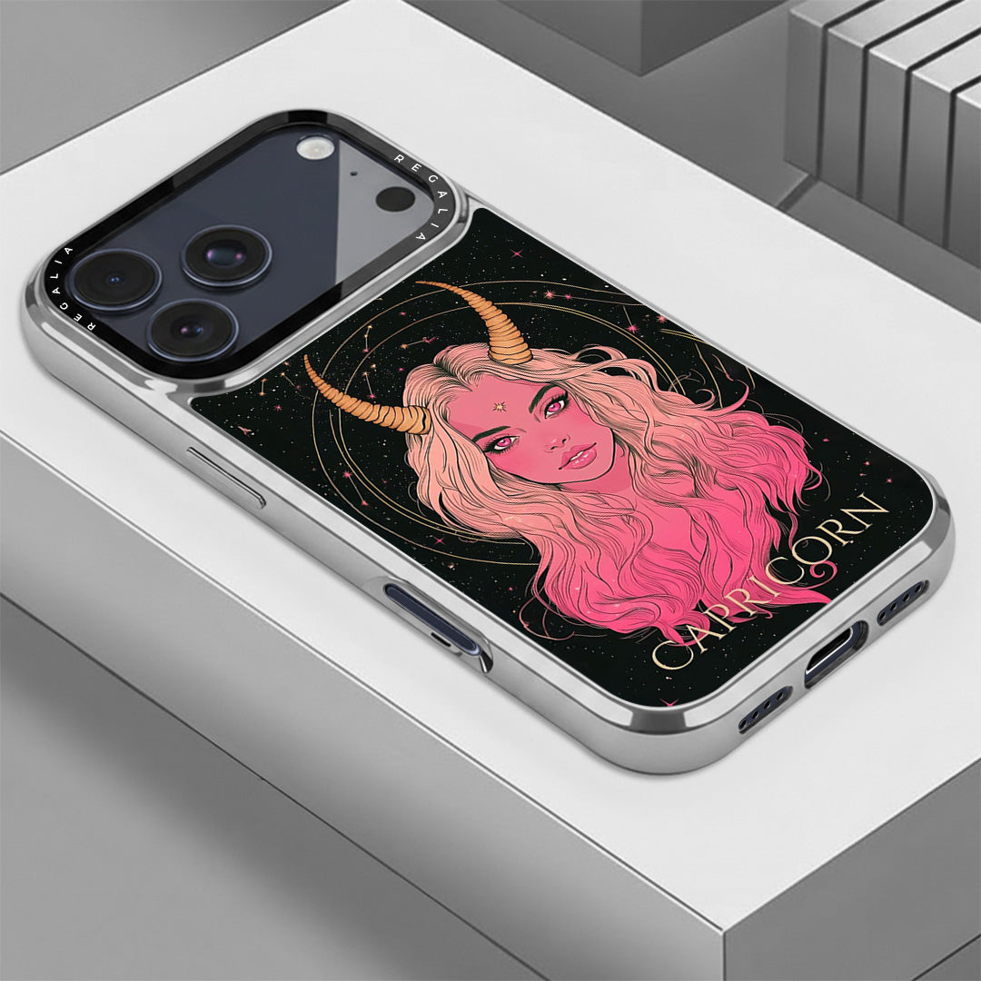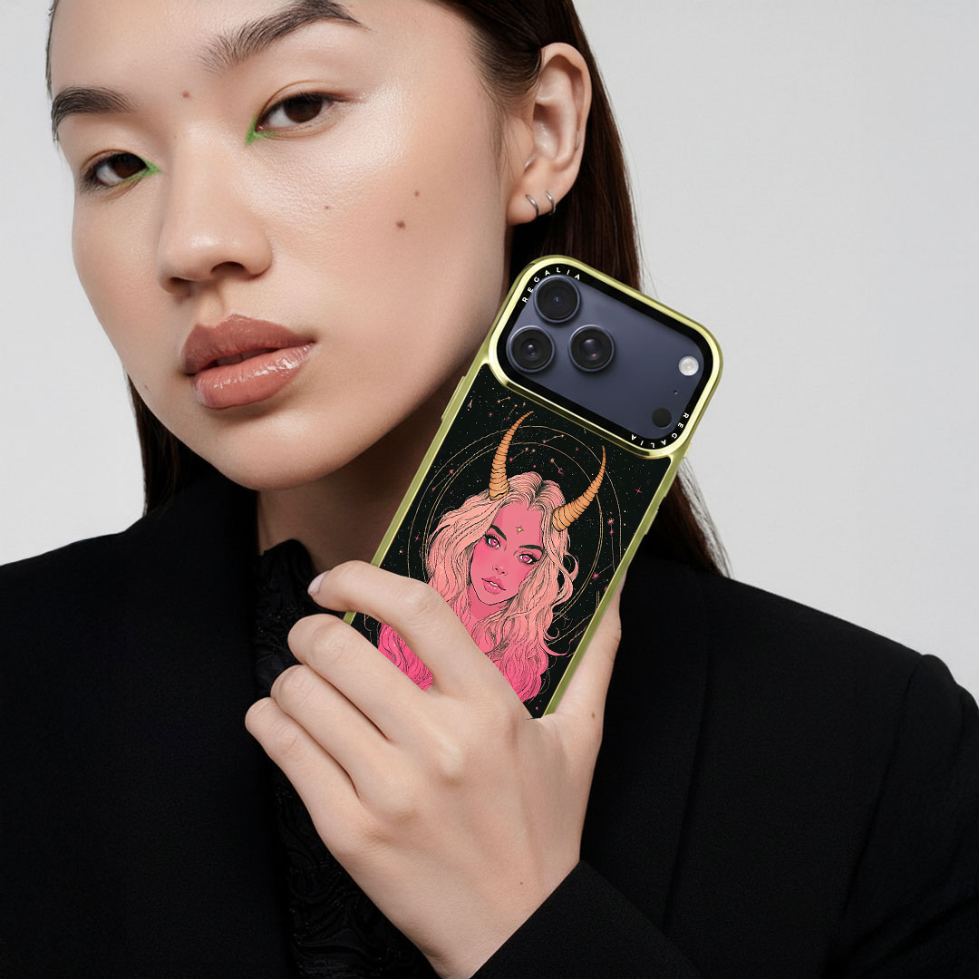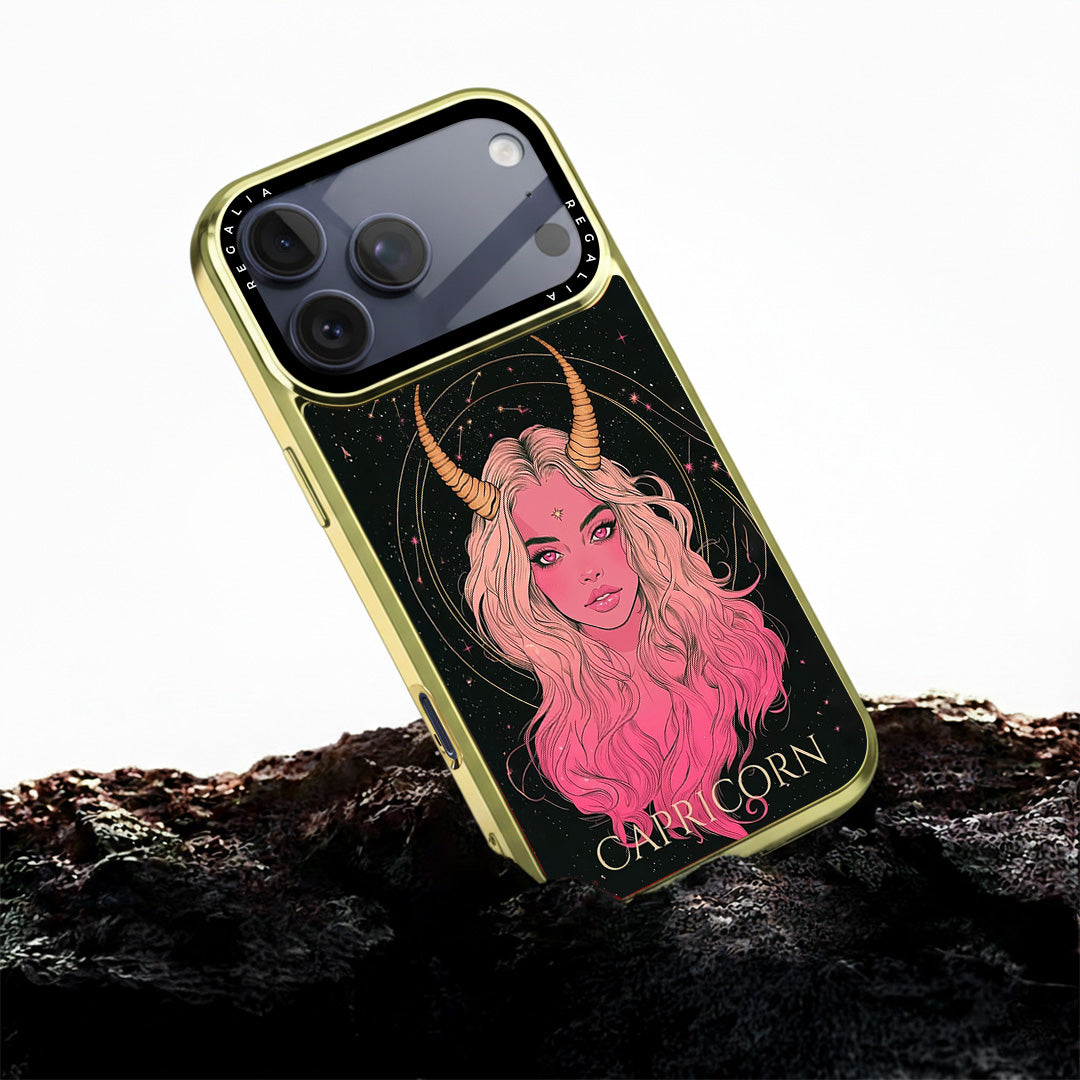 Capricorn Muse is a cosmic-chic case that celebrates elegant ambition. A luminous muse with cascading rose waves and gilded sea-goat horns glows against a star-sprinkled noir sky, framed by celestial arcs and Saturn-like rings. Ornate zodiac linework and a glossy finish make the gold accents shine—poised, powerful, and unmistakably Capricorn.