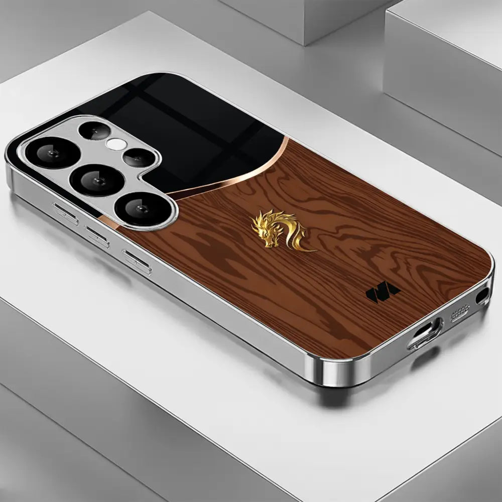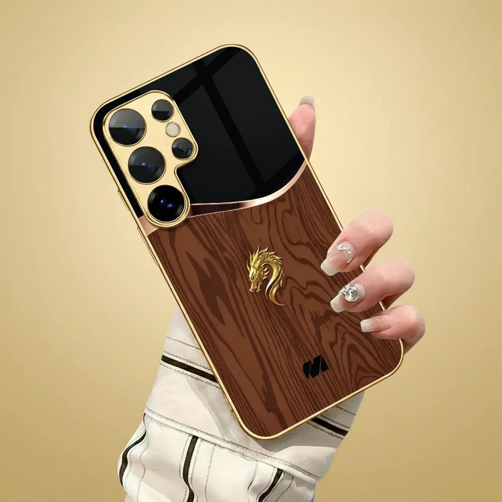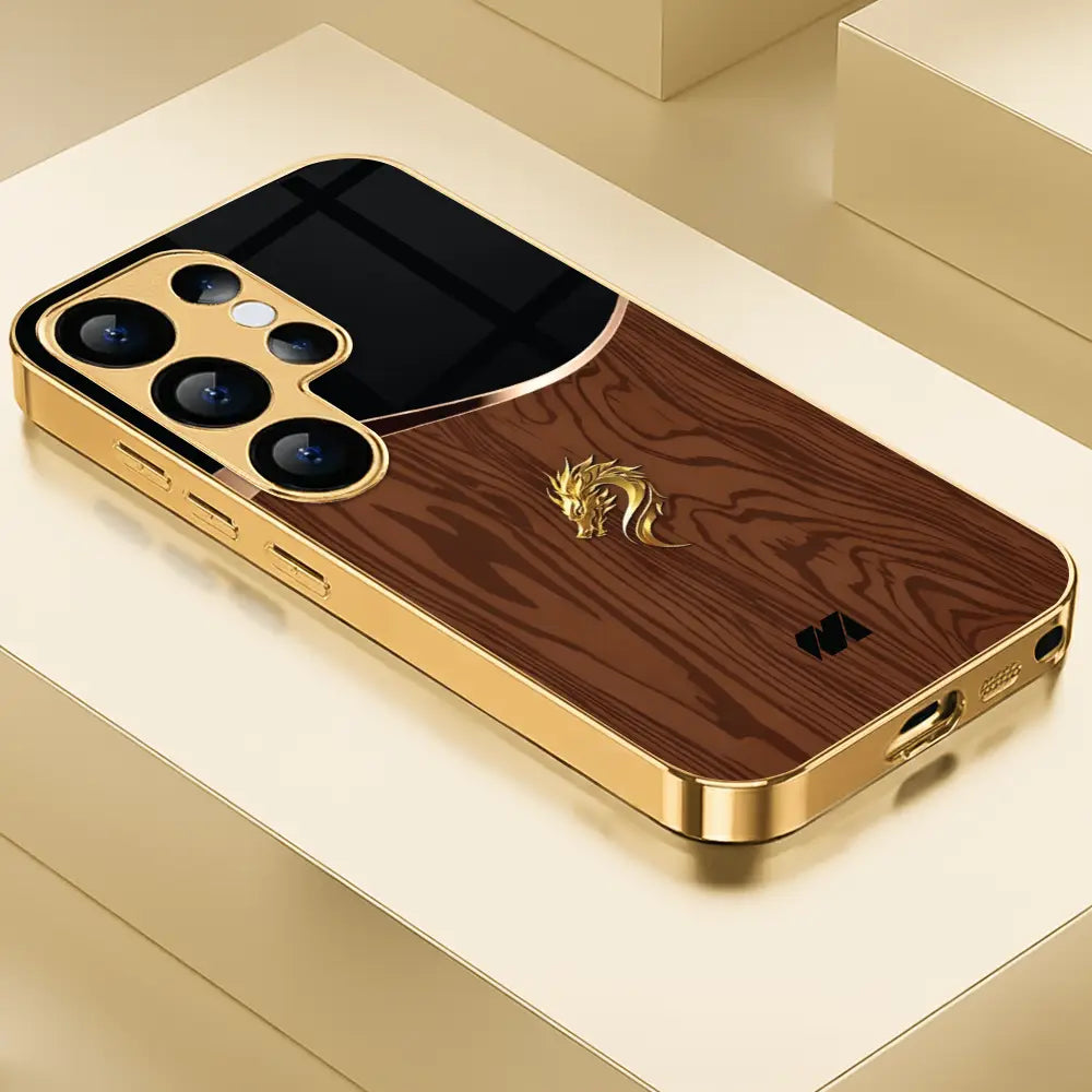 The Dynasty Dragonwood case fuses ancient power with modern luxury, featuring a deep wood-grain finish crowned by a striking golden dragon emblem. Inspired by imperial craftsmanship, this design symbolizes strength, prosperity, and timeless authority. The glossy surface enhances the rich tones of the wood texture, while the metallic dragon detail adds a bold, regal accent that commands attention.