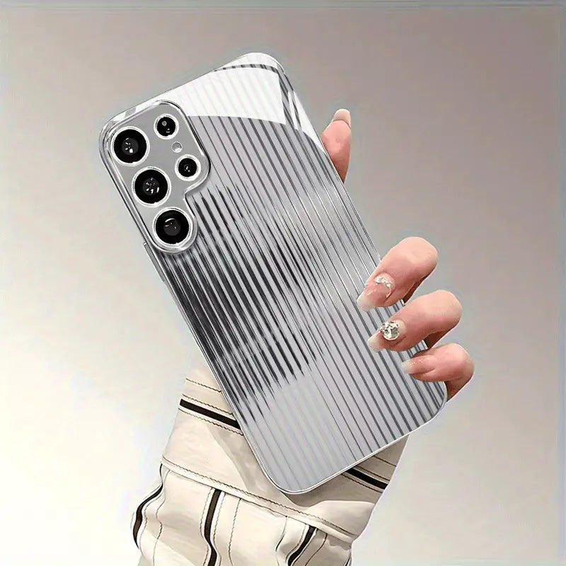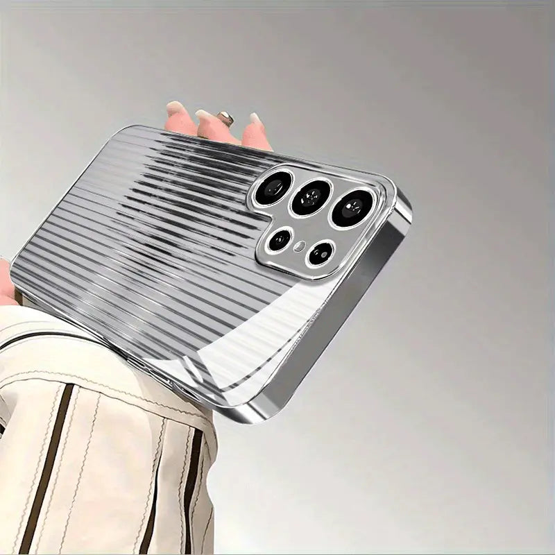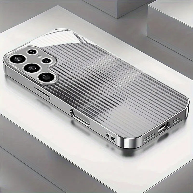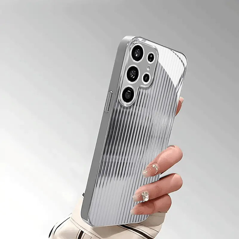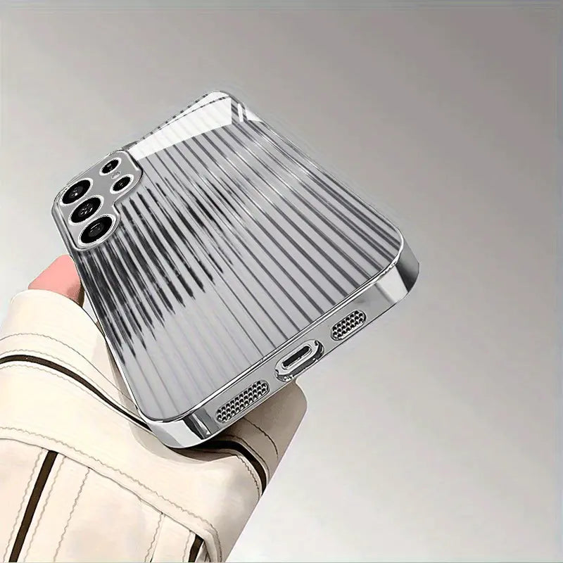 A refined case with electroplated glass finish and elegant linear design that radiates modern minimalism. Its glossy surface not only elevates style but also ensures lasting protection with a premium touch.