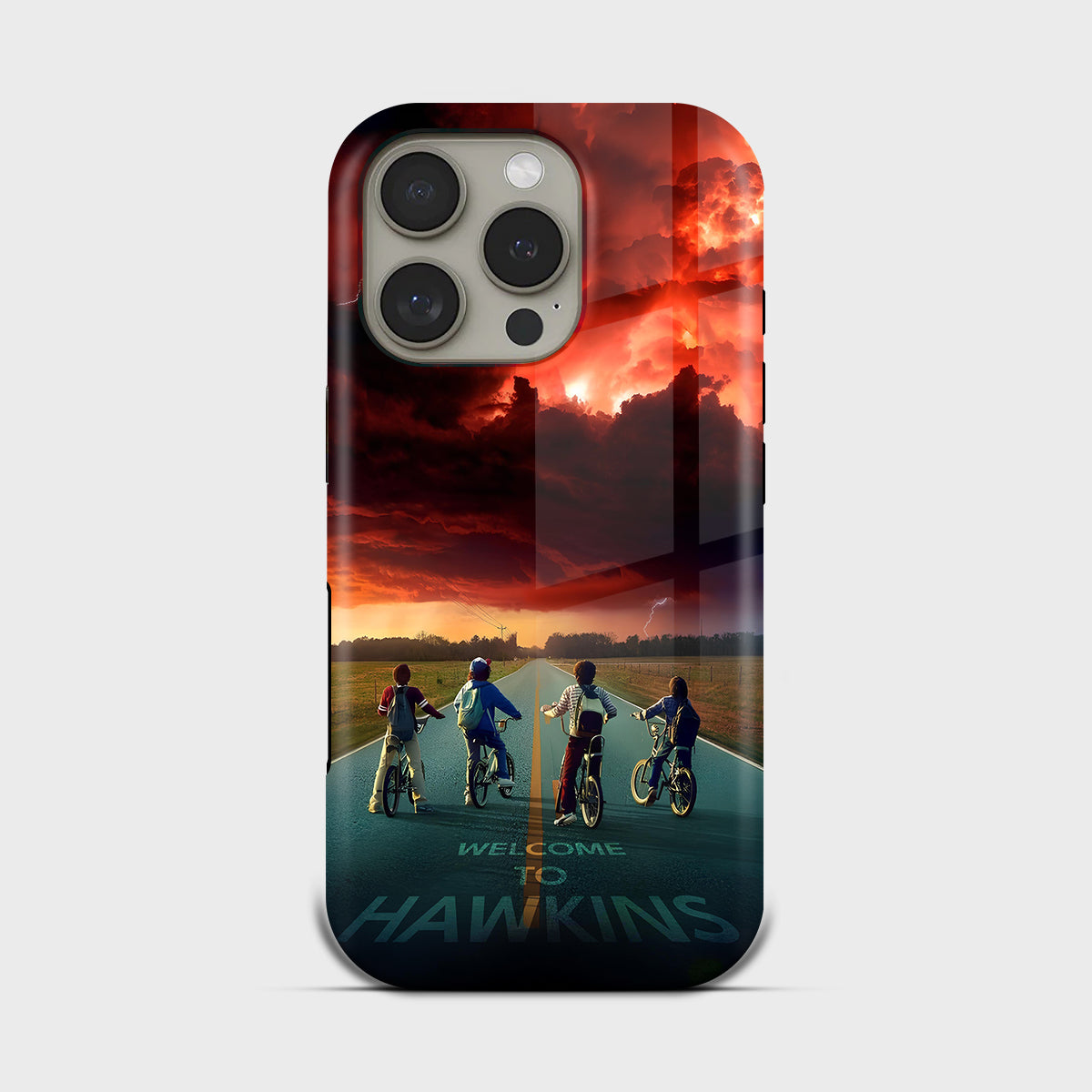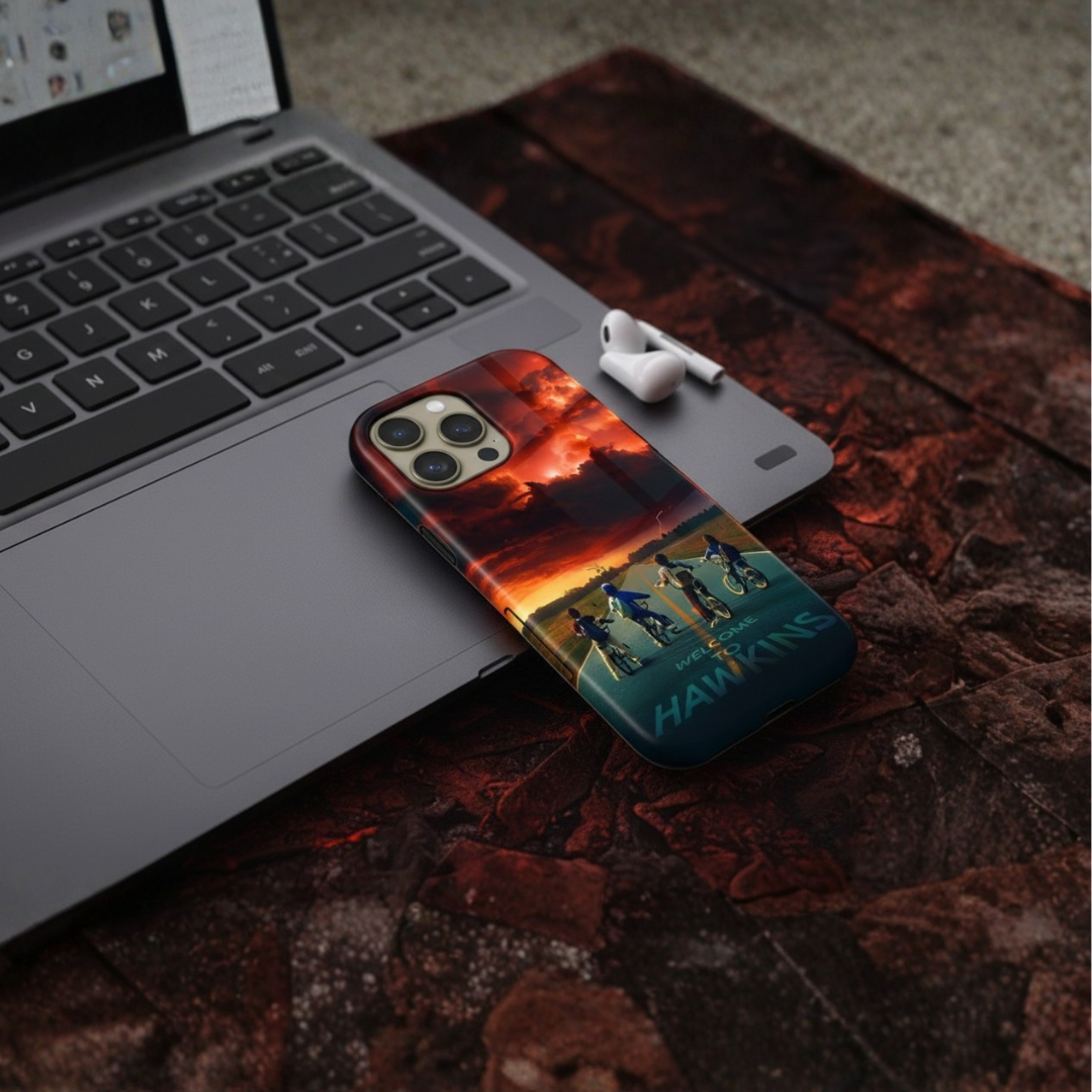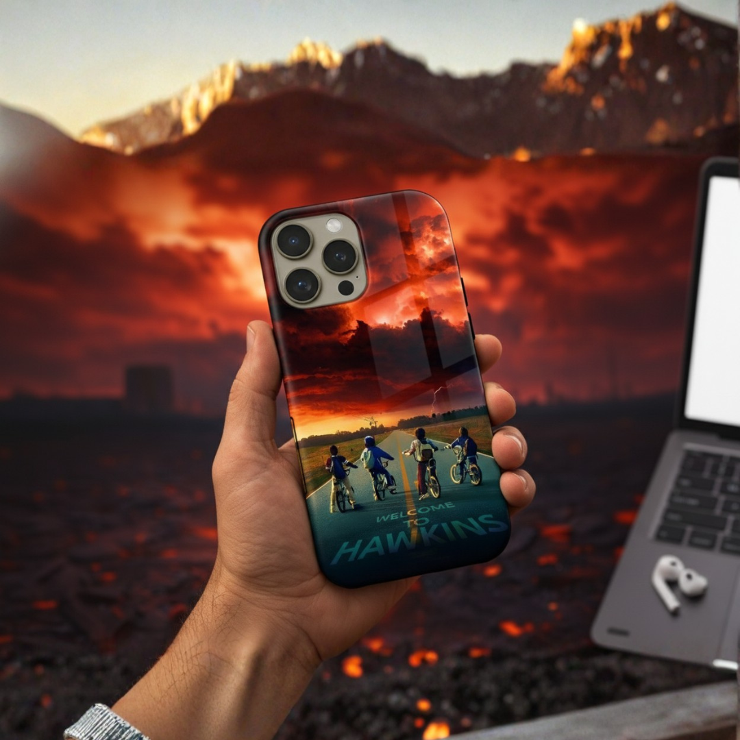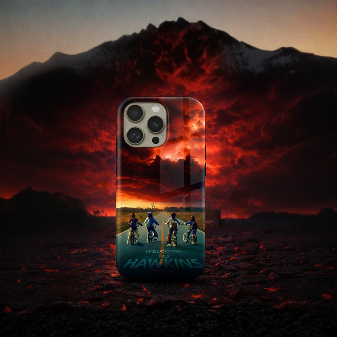 Enter the eerie calm before the storm with Hawkins Horizon, a collector’s edition case inspired by the thrilling world of Stranger Things. Set against a fiery sky and shadowed road, the design captures that unforgettable moment between light and darkness — when adventure calls and reality begins to blur.