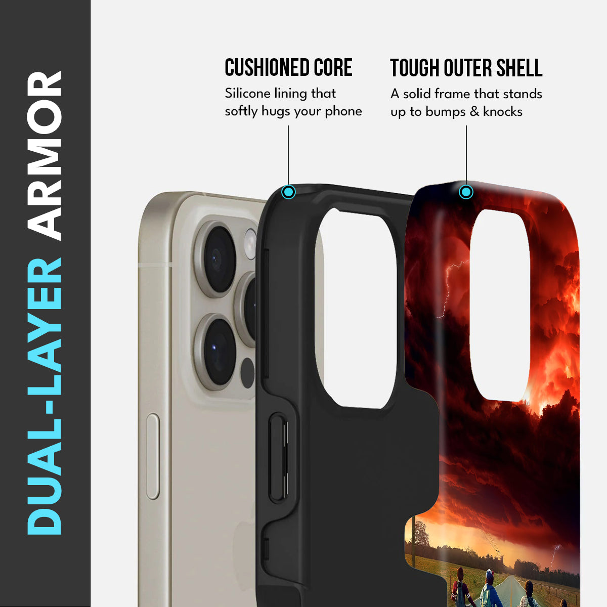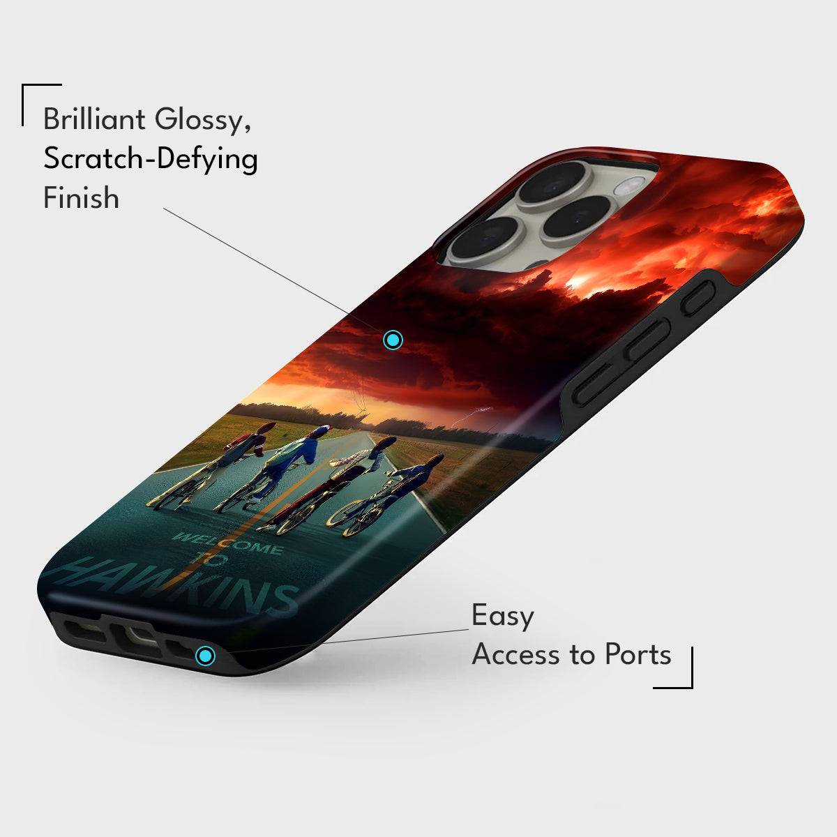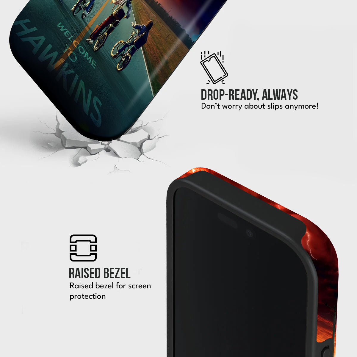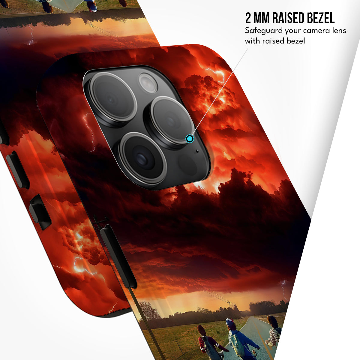 Enter the eerie calm before the storm with Hawkins Horizon, a collector’s edition case inspired by the thrilling world of Stranger Things. Set against a fiery sky and shadowed road, the design captures that unforgettable moment between light and darkness — when adventure calls and reality begins to blur.