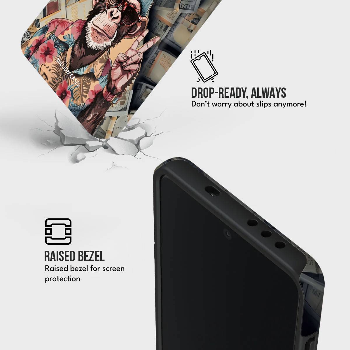 Bring bold energy and street-art swagger to your phone with the Hustle Ape Case—a design made for those who grind hard, live loud, and stay unbothered. Featuring a stylish, chilled-out ape in sunglasses and a floral shirt flashing the peace sign against a backdrop of stacked cash, this case captures the perfect mix of hustle and vibe.