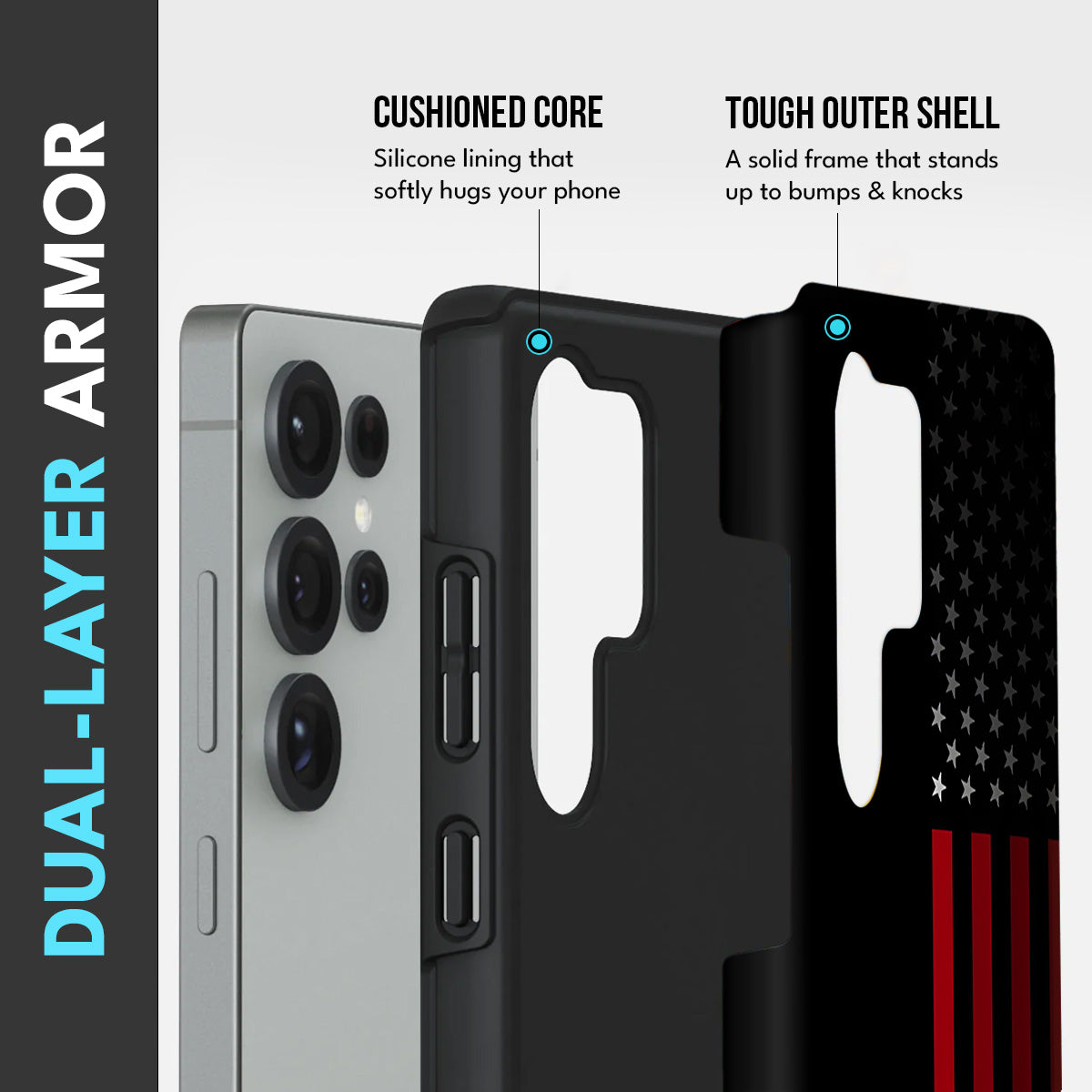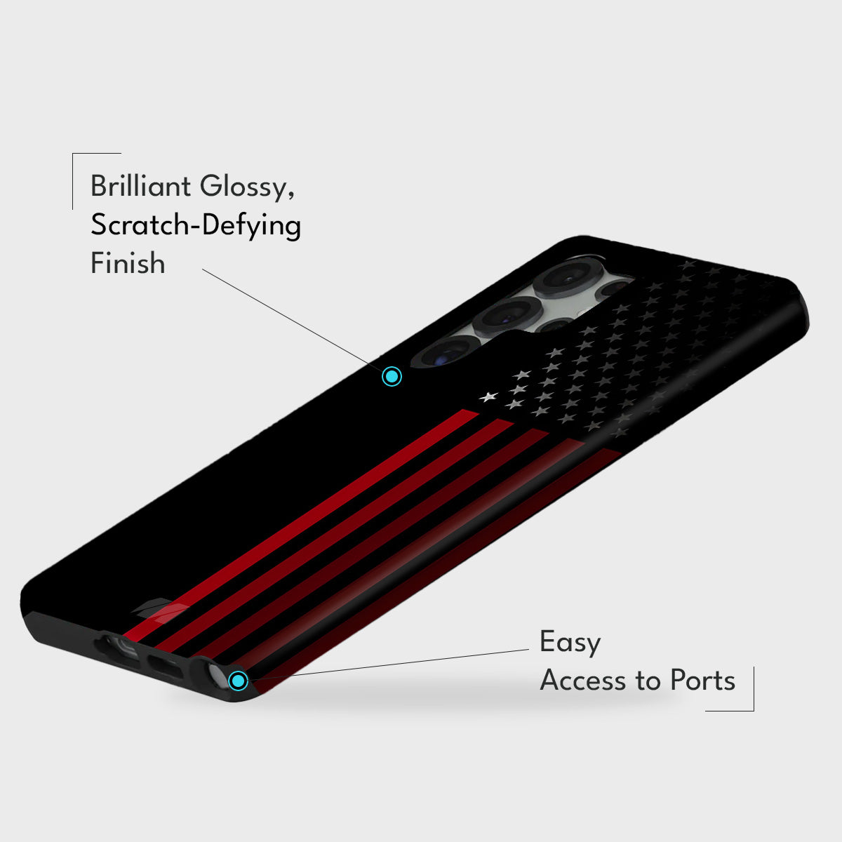 Stand strong, stand bold. The Midnight Patriot case blends sleek modern style with a powerful symbol of pride. Featuring a dark, minimalist rendition of the American flag with deep crimson stripes, this design represents strength, honor, and unshakable patriotism.