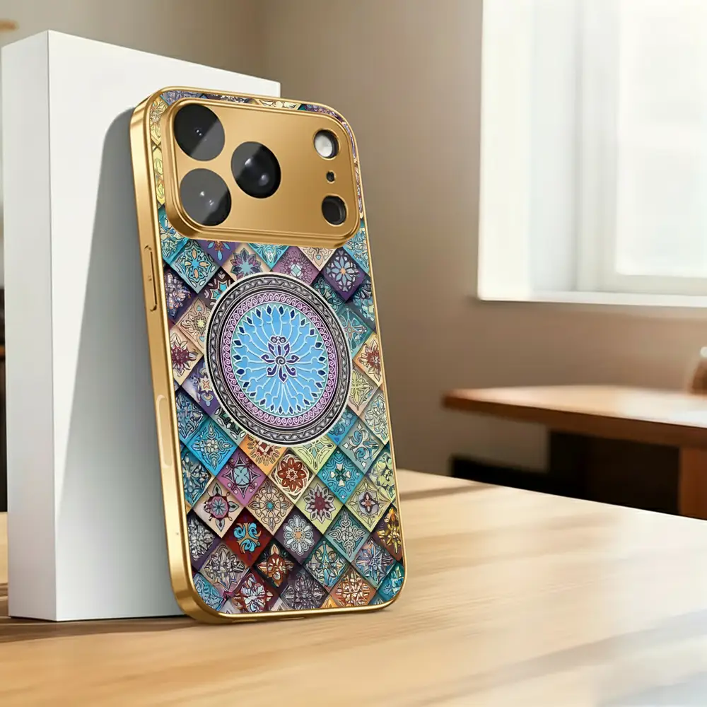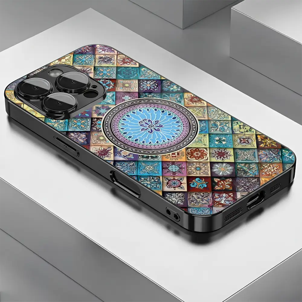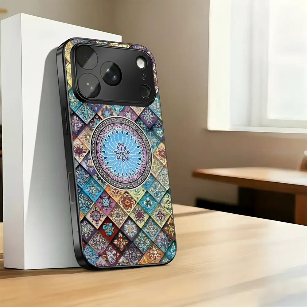Inspired by journeys across cultures and the beauty of hand-crafted design, Nomad Tiles is a celebration of pattern, color, and story. Featuring an intricate mosaic of ornamental tiles arranged around a striking central mandala, this case reflects the artistry found in ancient courtyards, traveling markets, and timeless craftsmanship.