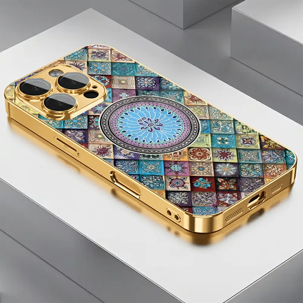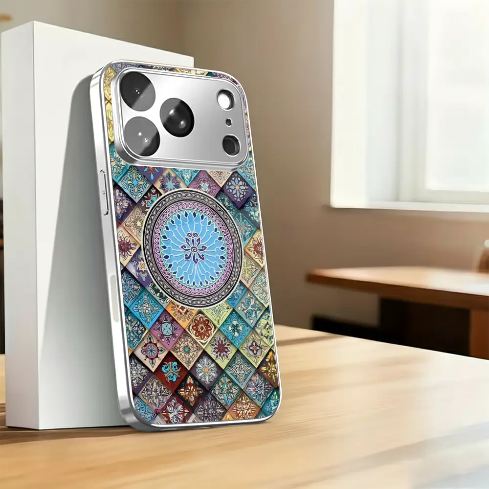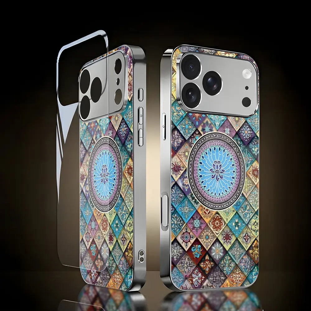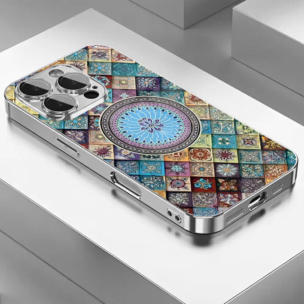 Inspired by journeys across cultures and the beauty of hand-crafted design, Nomad Tiles is a celebration of pattern, color, and story. Featuring an intricate mosaic of ornamental tiles arranged around a striking central mandala, this case reflects the artistry found in ancient courtyards, traveling markets, and timeless craftsmanship.