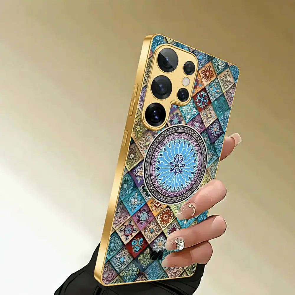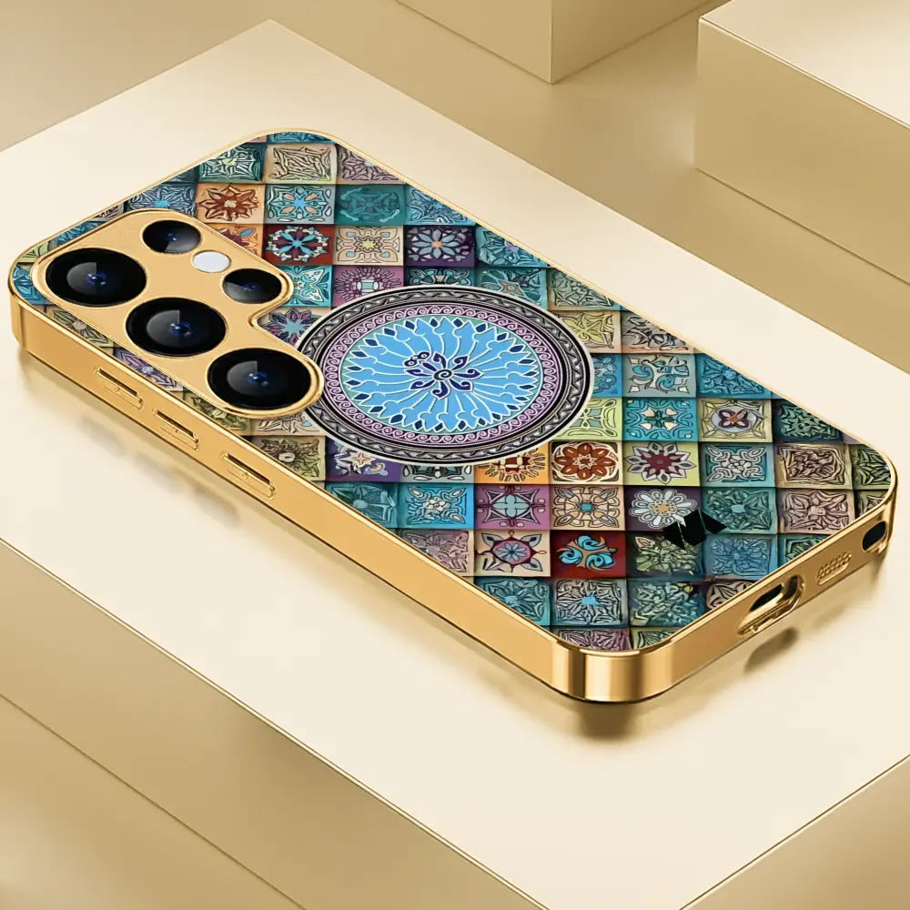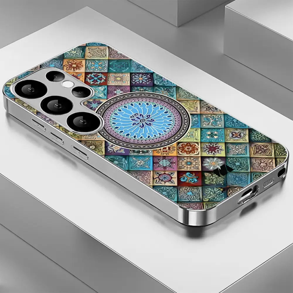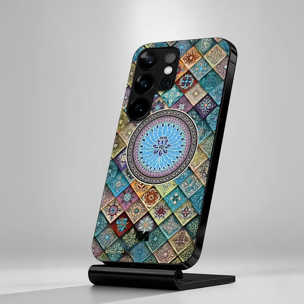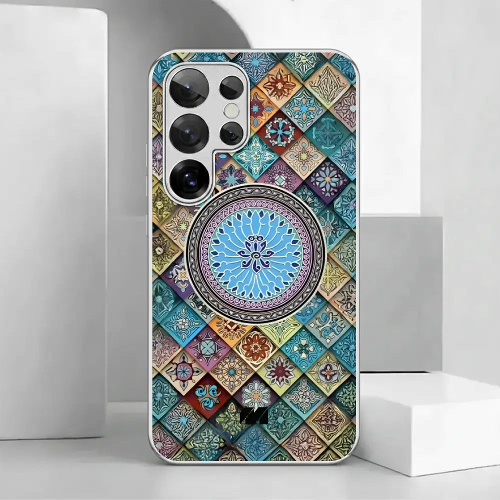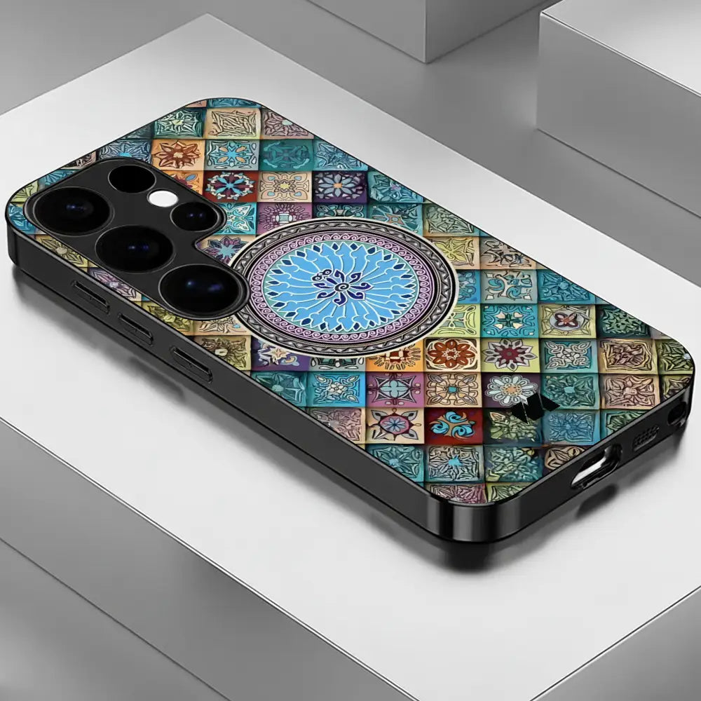 Inspired by journeys across cultures and the beauty of hand-crafted design, Nomad Tiles is a celebration of pattern, color, and story. Featuring an intricate mosaic of ornamental tiles arranged around a striking central mandala, this case reflects the artistry found in ancient courtyards, traveling markets, and timeless craftsmanship.