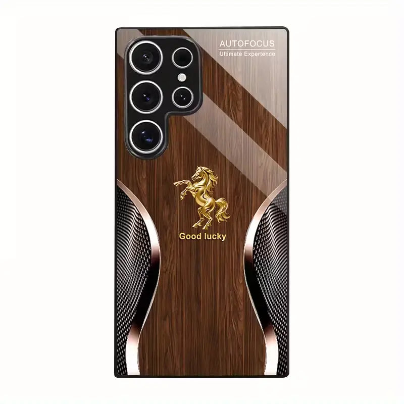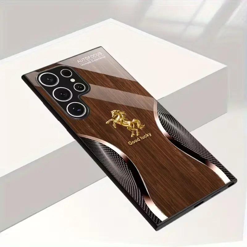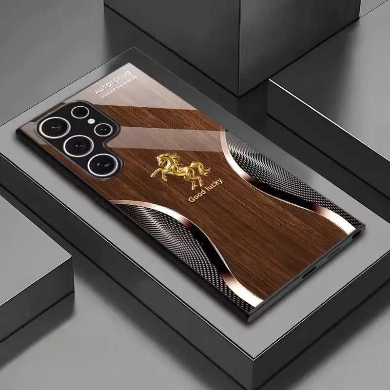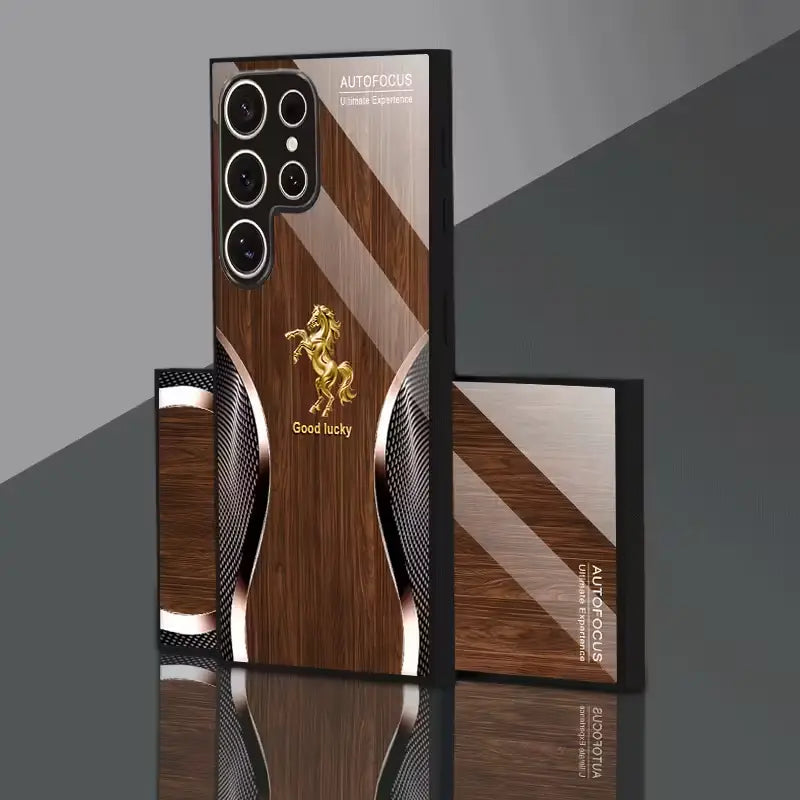 The Regal Rider Case blends timeless sophistication with bold luxury, featuring a striking wooden-texture design enhanced by sleek metallic accents. At its center stands a golden rearing horse—symbolizing strength, elegance, and victory—creating a case that feels both powerful and refined.