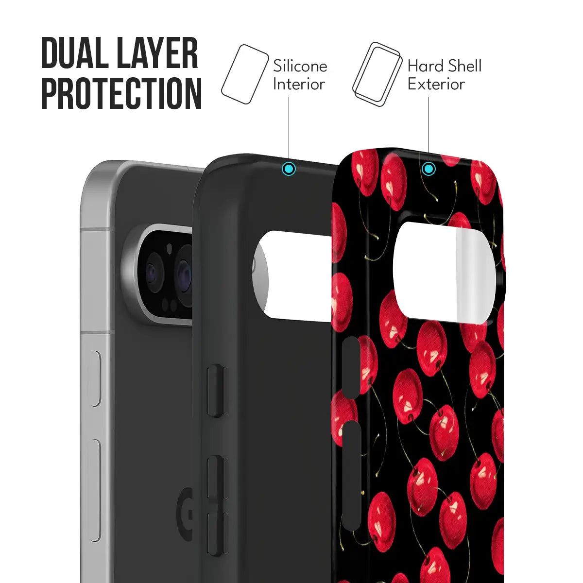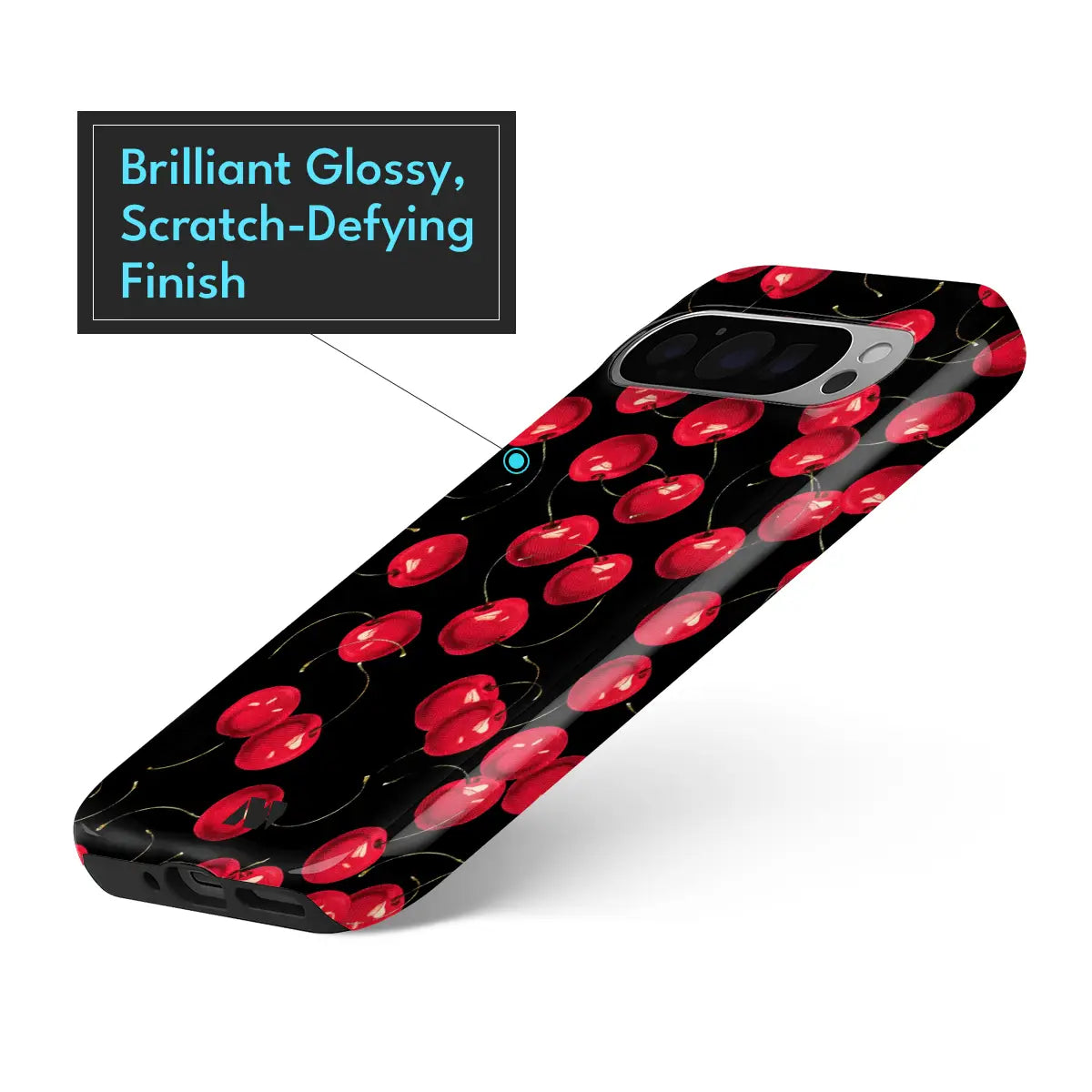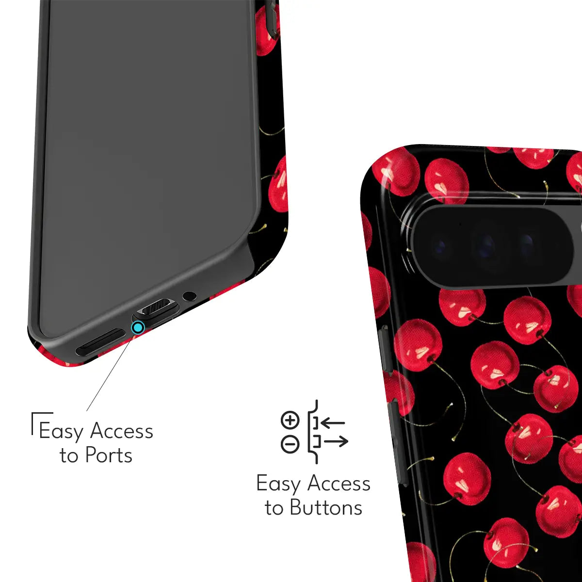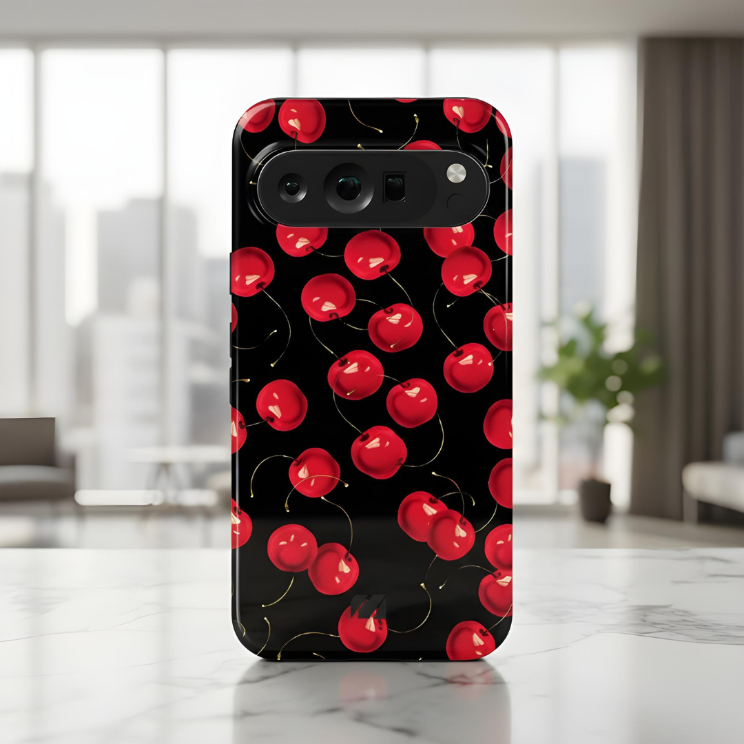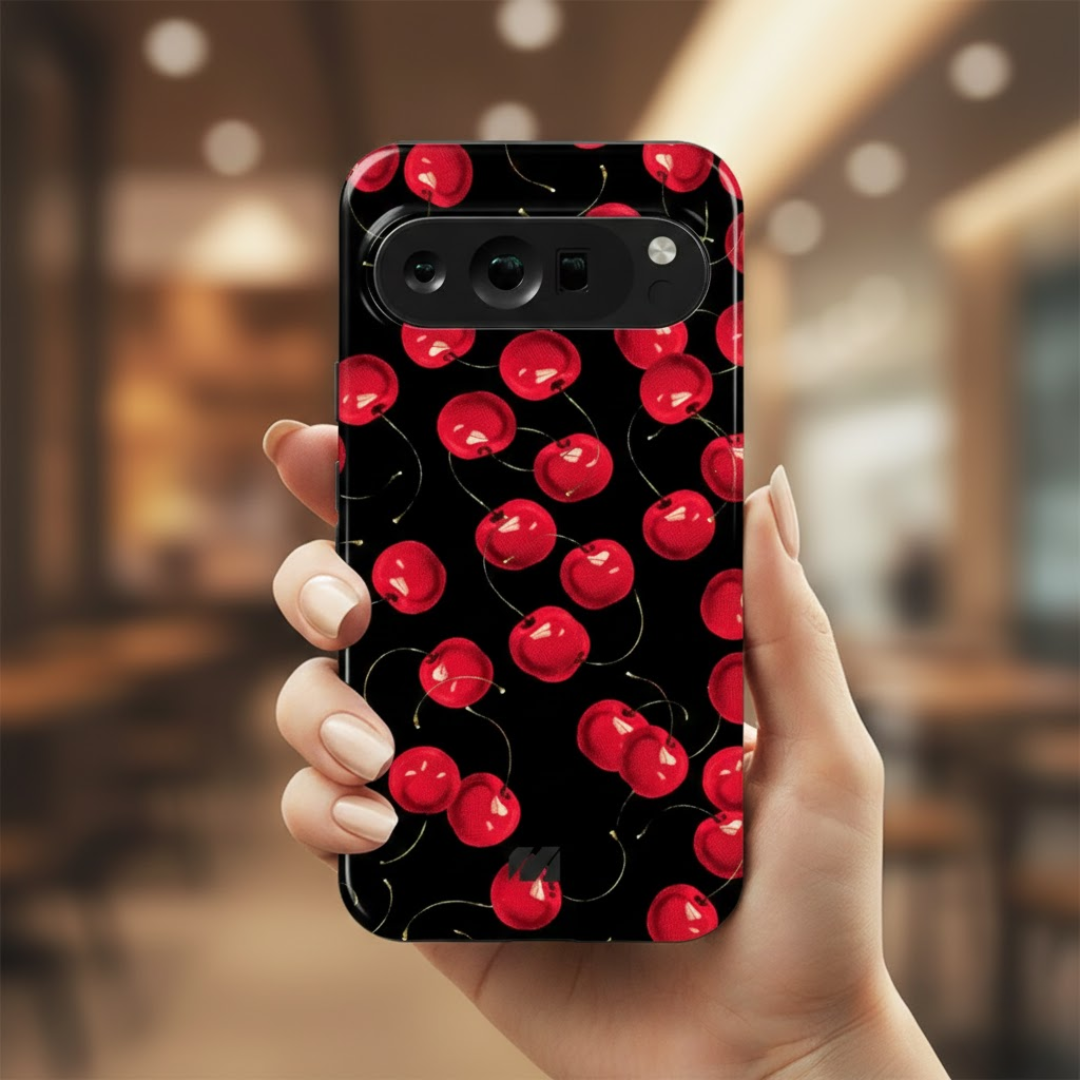 Scarlet Berries Case brings a bold splash of personality to your phone with its striking cherry-inspired pattern set against a deep black backdrop. Designed to stand out, it blends playful charm with modern style while offering dependable everyday protection.