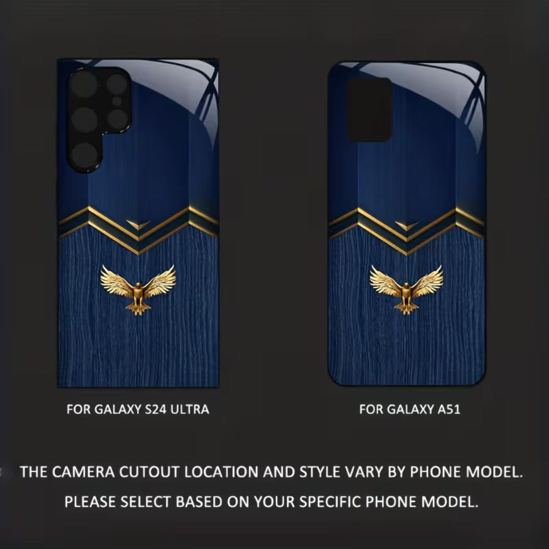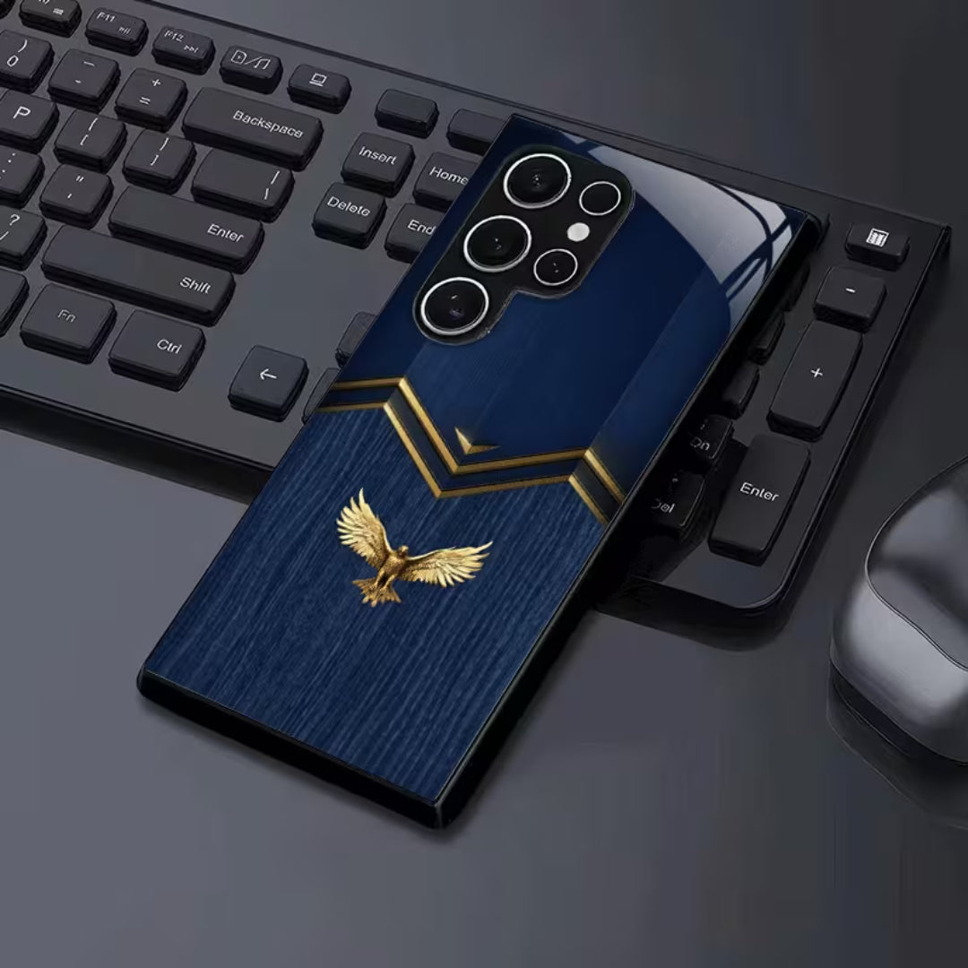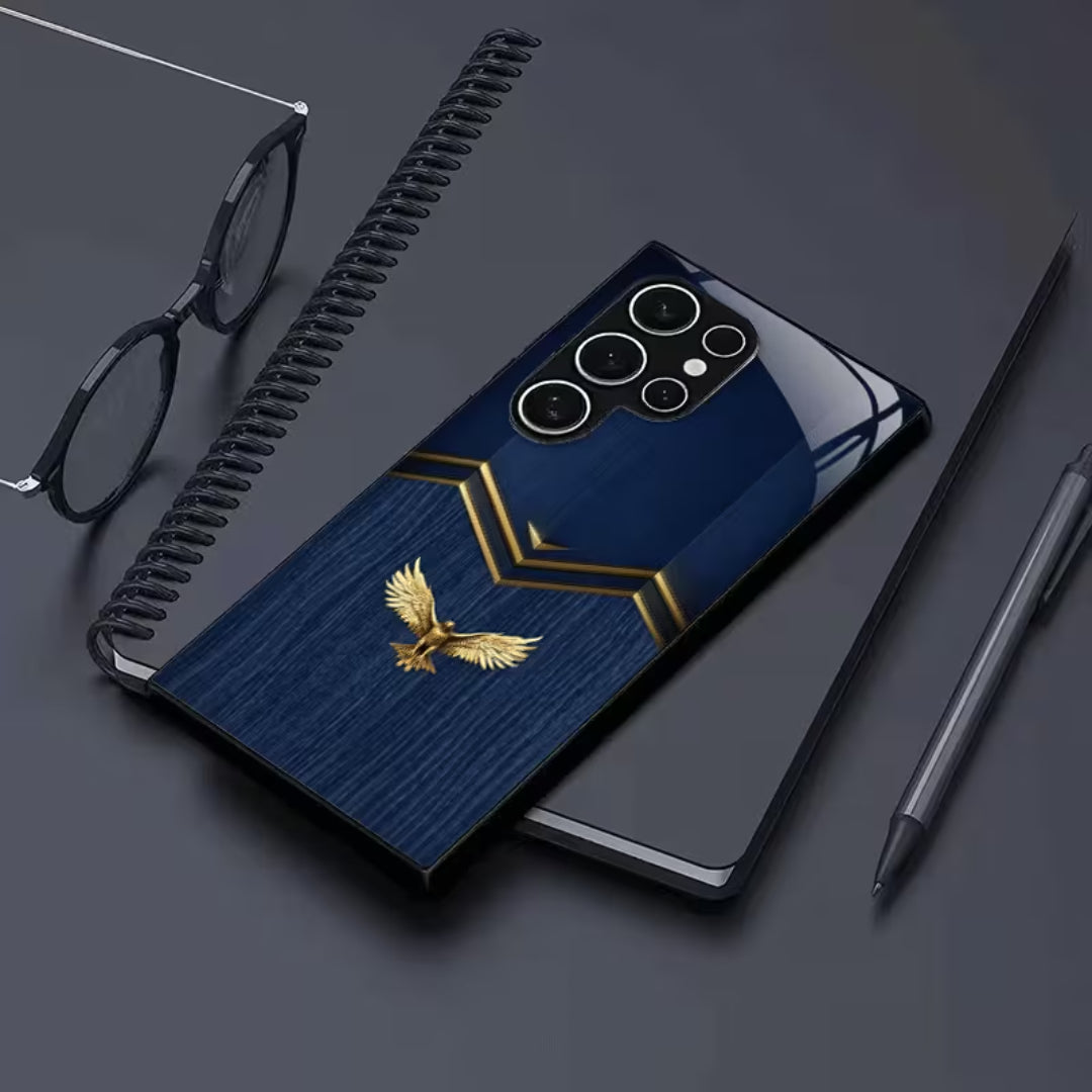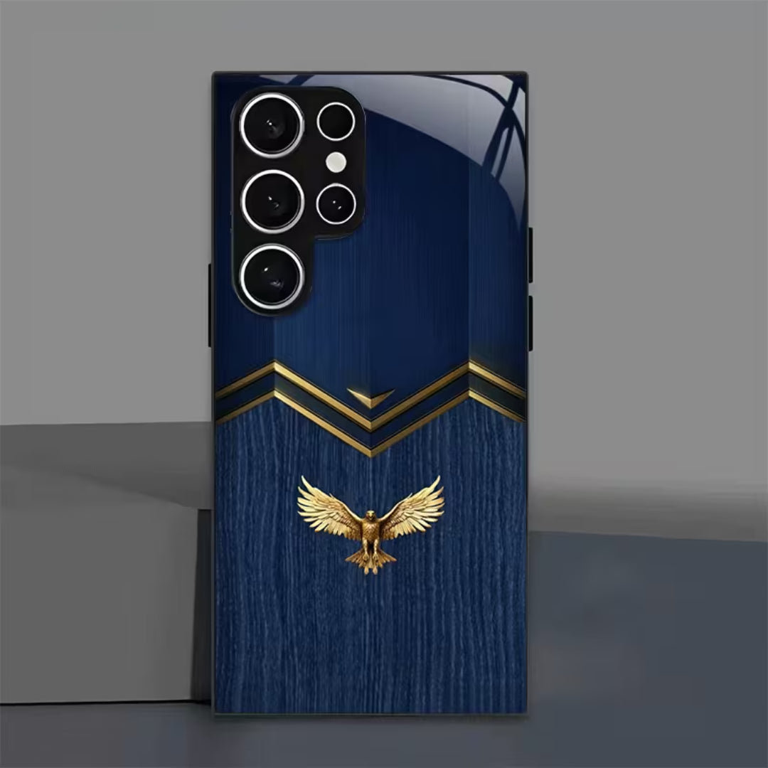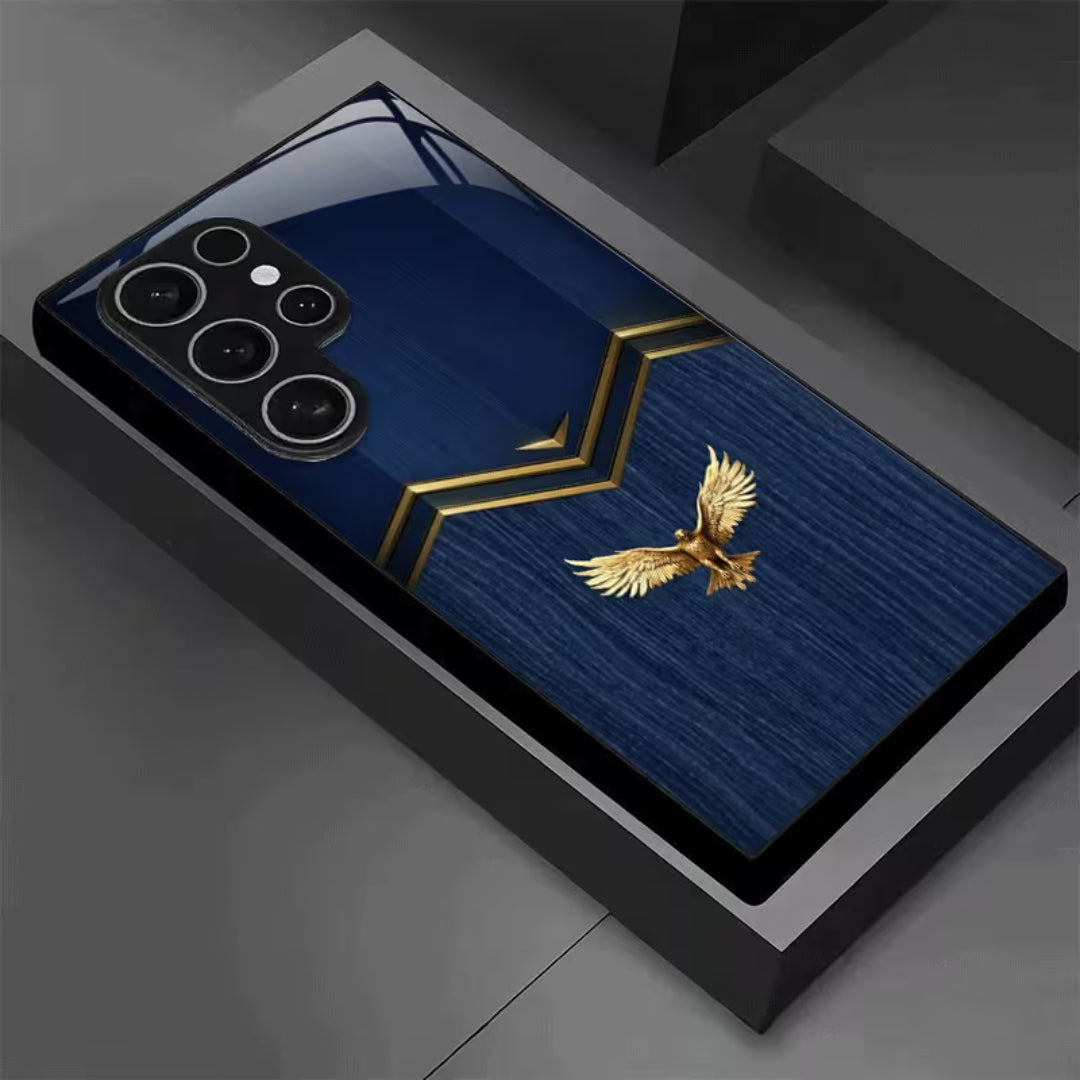 Skyseal Kings is crafted for those who lead without noise and rule through presence. The deep royal blue surface evokes endless skies, while the gilded eagle crest stands as a mark of authority, vision, and ascent. Clean geometric lines framed in gold bring a modern regality—balanced, composed, and unmistakably powerful.