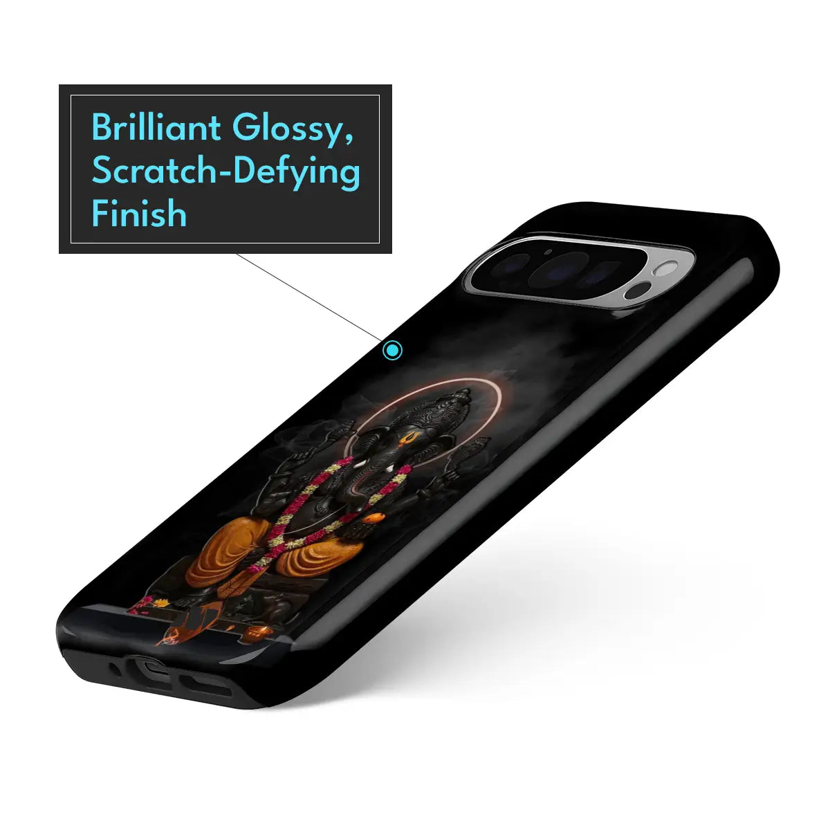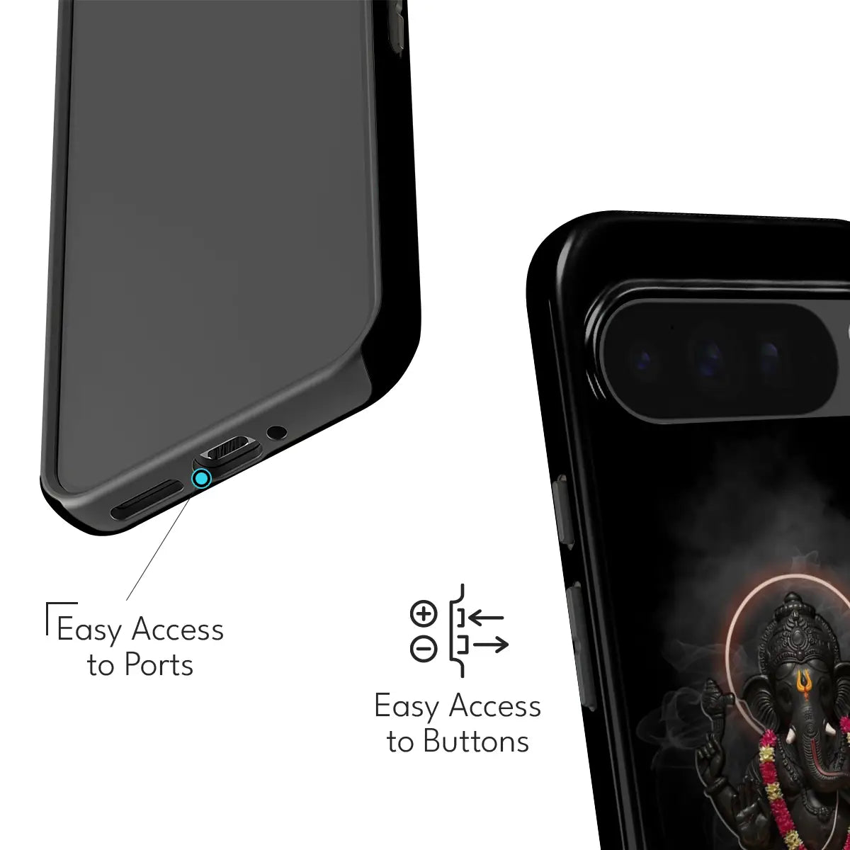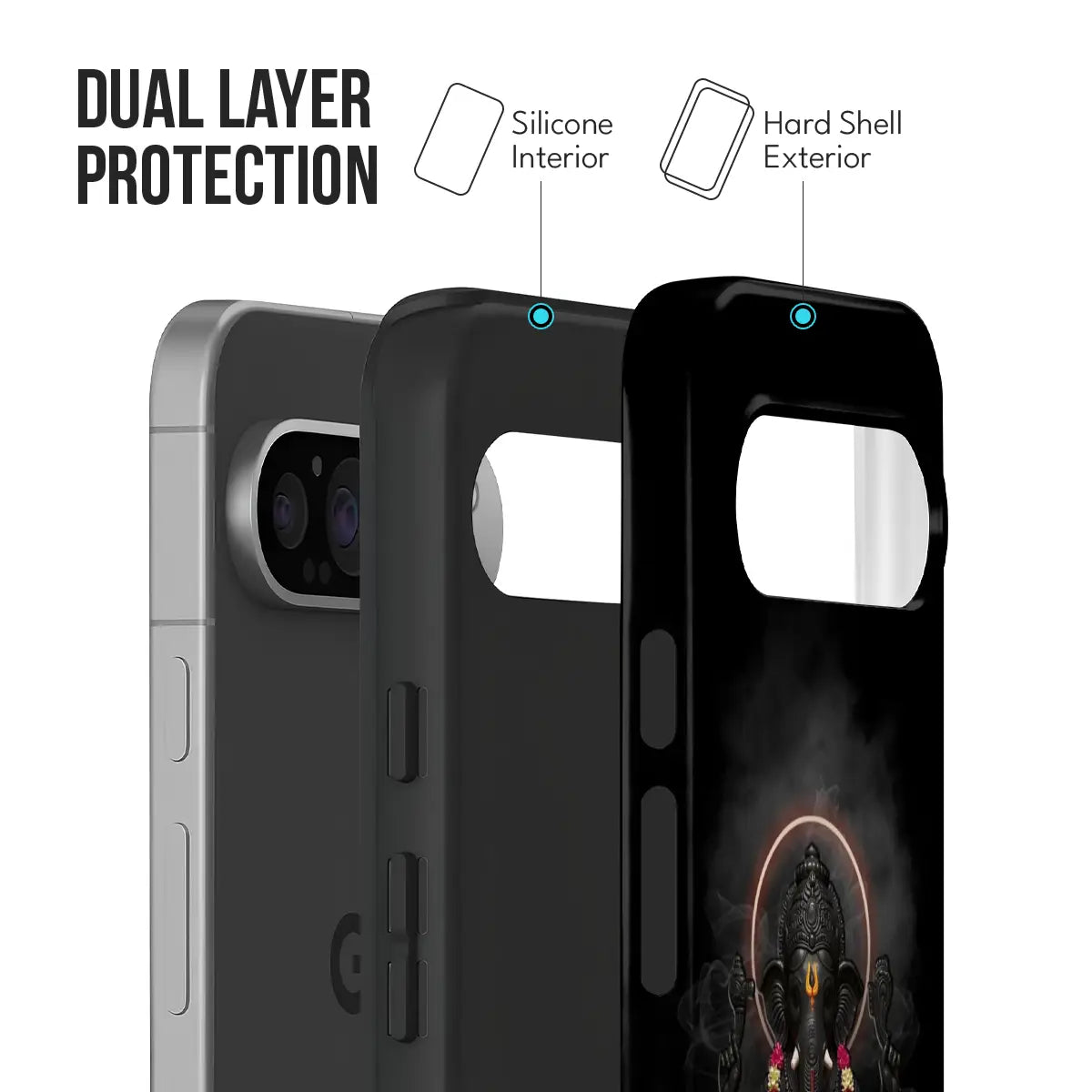 A powerful and serene design depicting Lord Ganesha seated in quiet majesty, surrounded by soft smoke and sacred light. Rich shadows and glowing accents evoke protection, wisdom, and the removal of obstacles—creating a deeply spiritual presence that symbolizes strength, peace, and divine guidance.