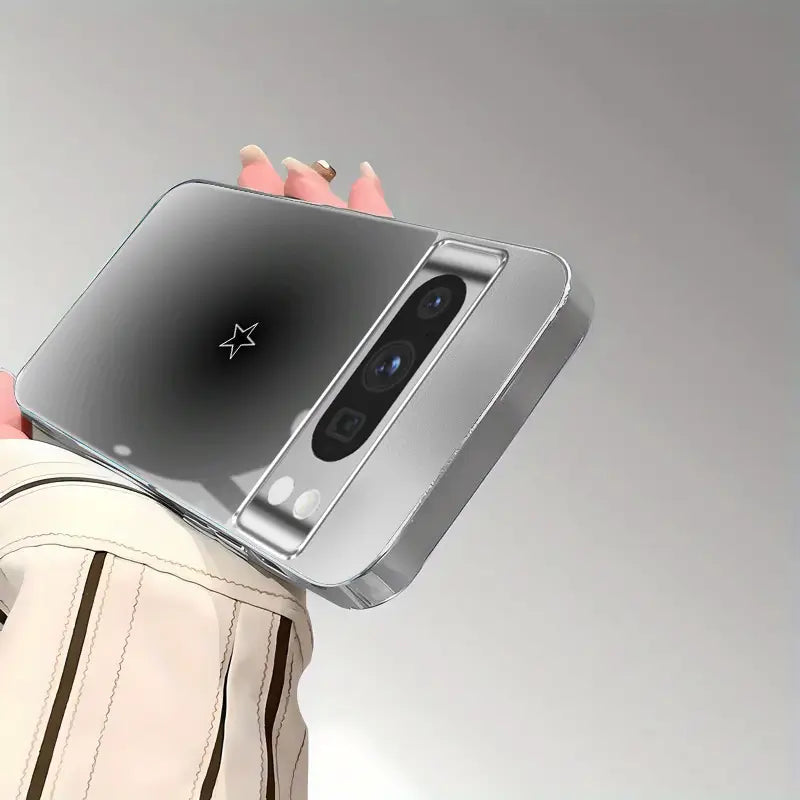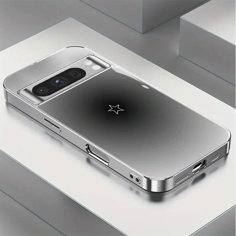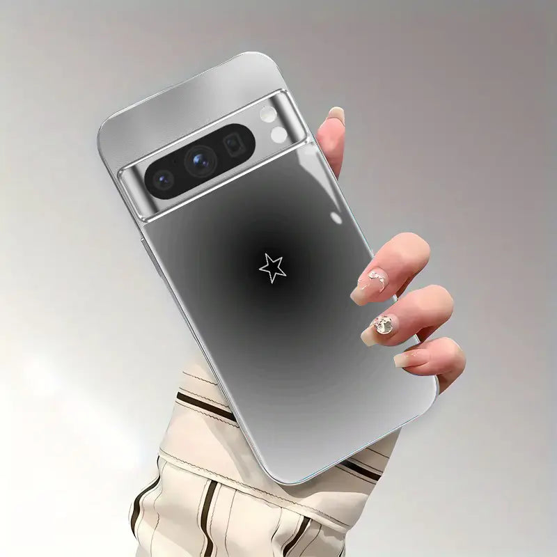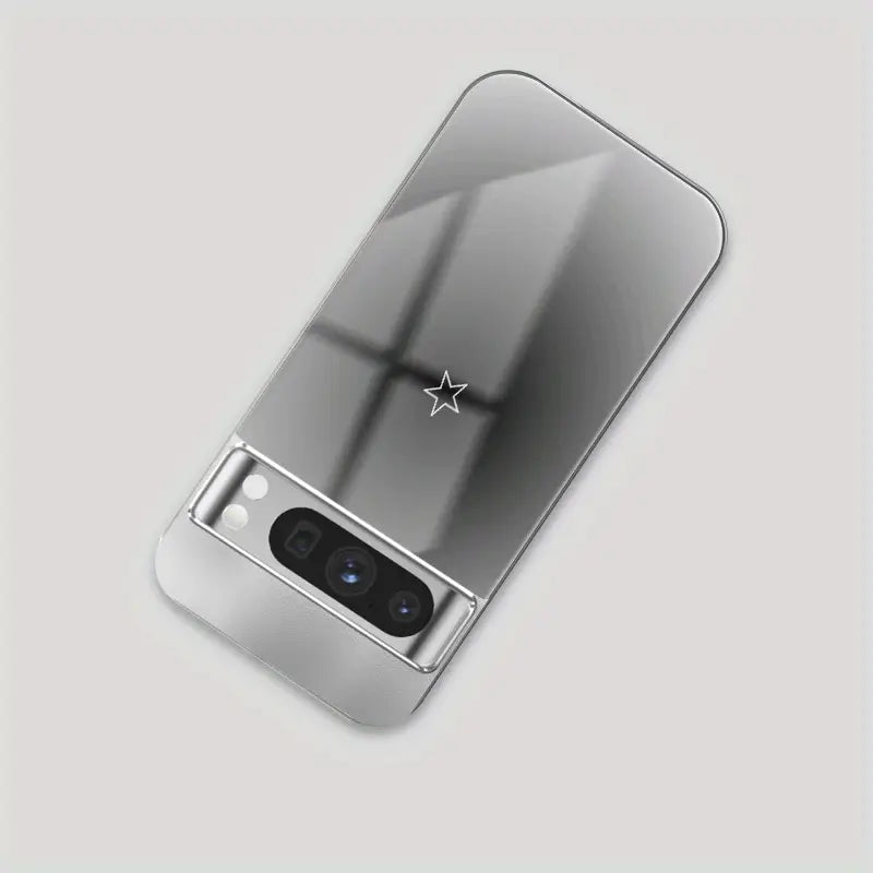 Guided by a single point of light. Star Meridian sets a polished chrome frame around a minimalist star emblem floating in a soft, charcoal-to-silver halo. The mirror-gloss finish delivers a clean, futuristic look—premium style without the bulk.