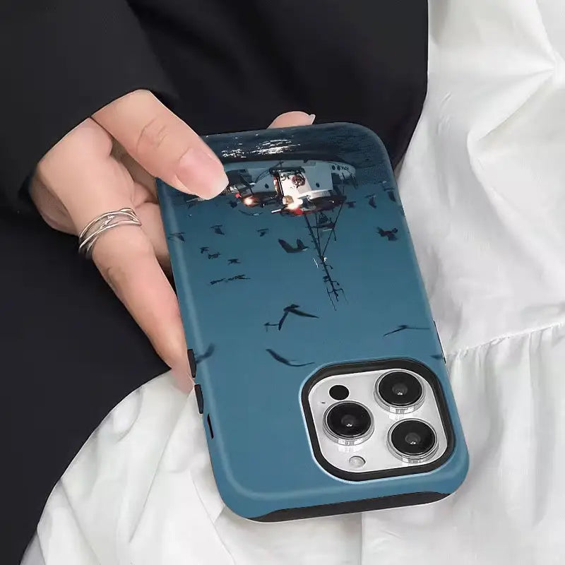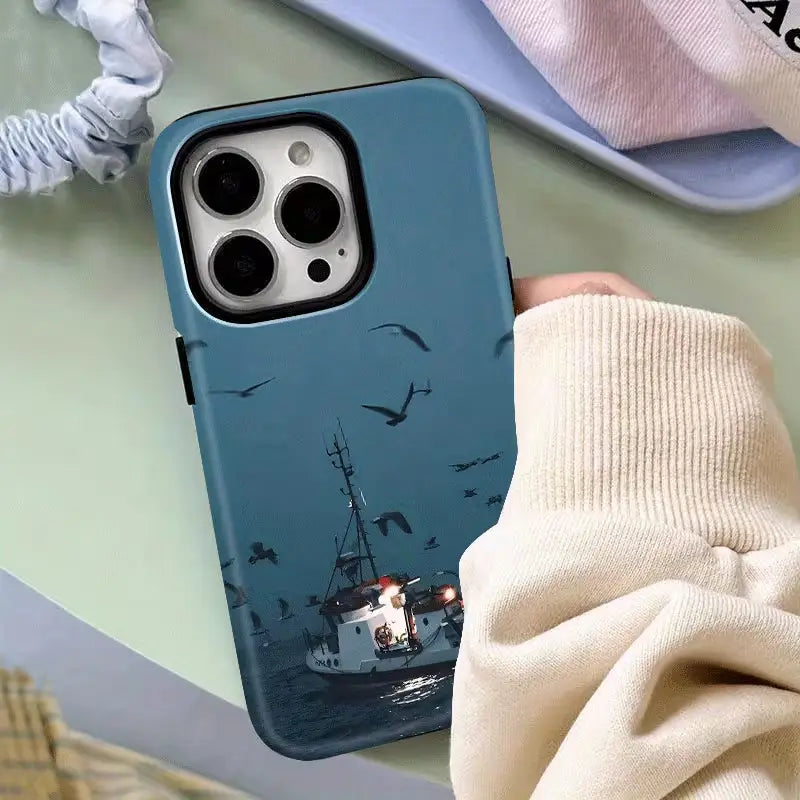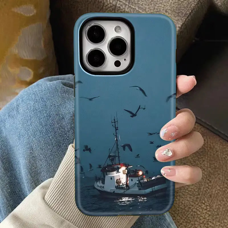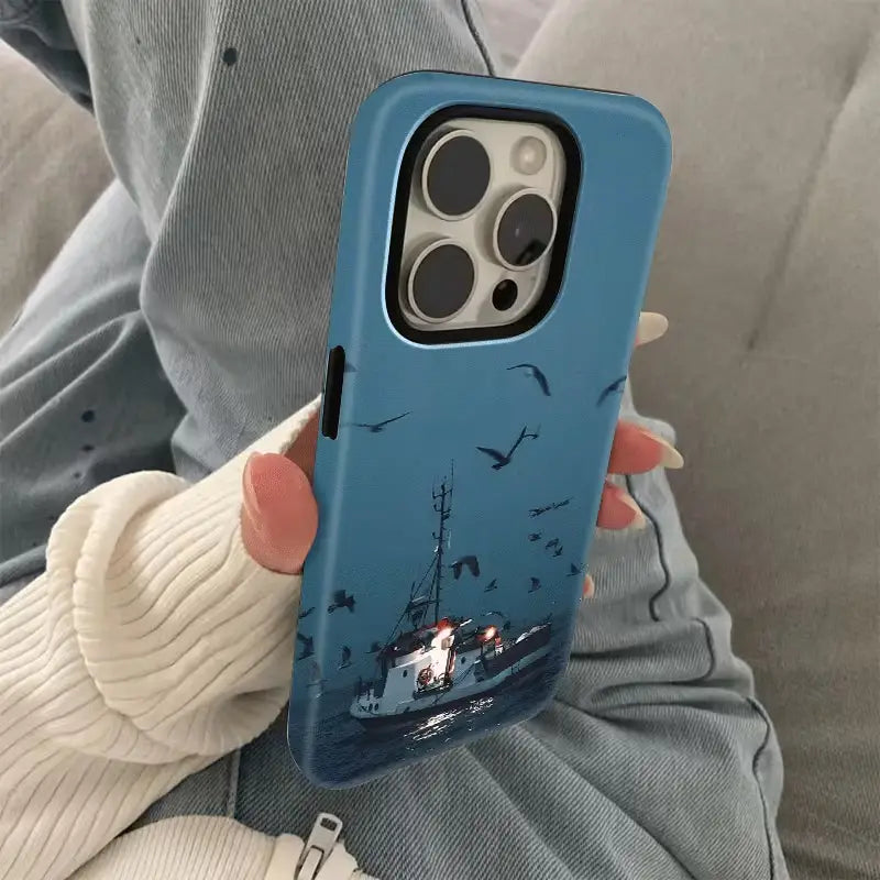 Lose yourself in the quiet beauty of the open sea with Stillwater Night, a phone case inspired by moments when the world slows and the water rests. Featuring a lone fishing vessel drifting across dark, glassy waves beneath a night sky filled with birds in motion, this design captures solitude, resilience, and calm determination.
